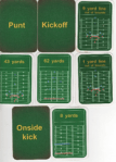 Created in 2002 by Chris LeMay to enhance the kickoff and punting procedures for playing the game of electric football, this deck of cards replaces the use of a TTQB or using spinners, dice and charts. With these cards it is possible to kick or punt the ball to a specific area of the field along with a random distance thus creating more realistic situations for the return of kickoffs and punts. Also, by using the distances provided by these cards, it is possible to kick field goals from up to 63 yards away.