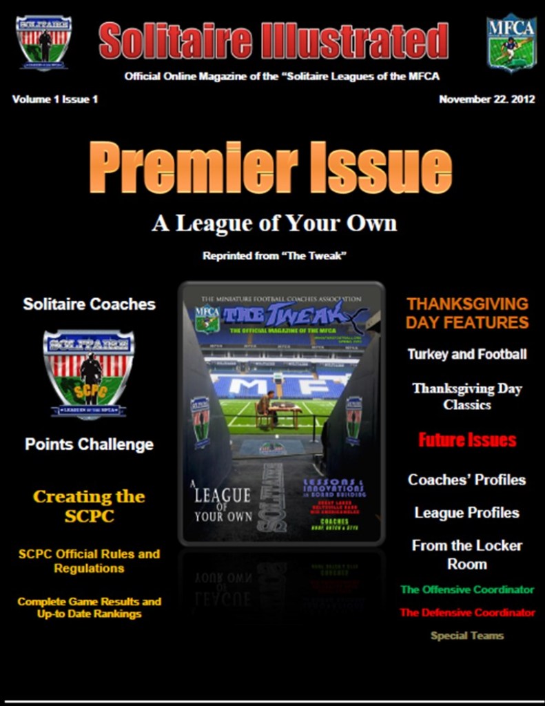 On November 22, 2012 the first issue of SOLITAIRE ILLUSTRATED was published. This was the first publication devoted solely to the game of solitiare electric football.
