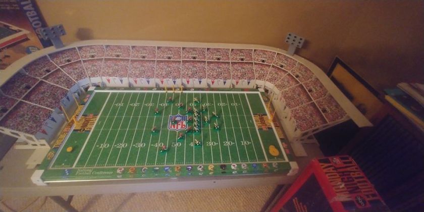 Although this game did not make the Top 20 Countdown, It is the first game set to feature a complete wrap around Stadium model. Produced by Miggle in 1997, this ABC Monday Night Football featured MNF logos, NFL helmets and battery operated lights to light the field. This particular Model no. 6072 fields stamped helmet Packers and Buccaneers.