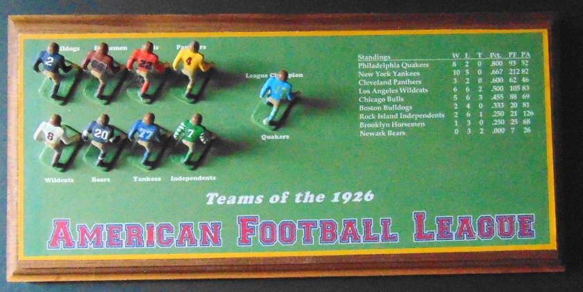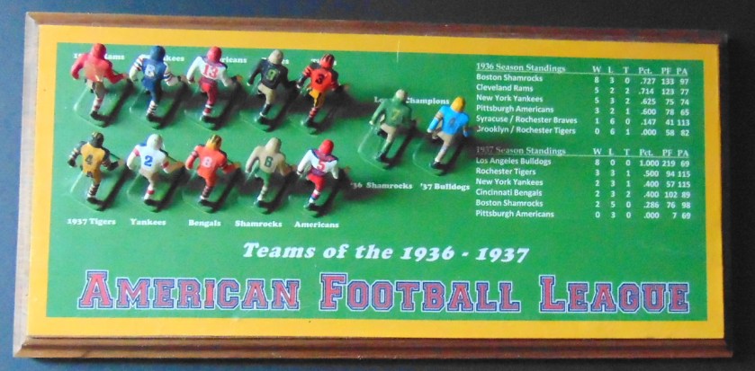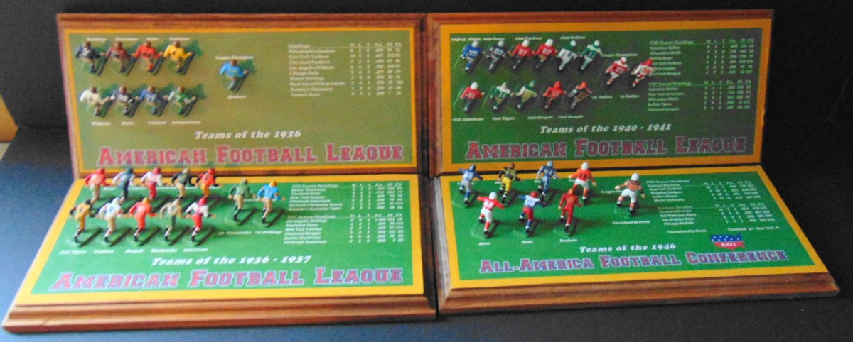 Featured here are some Wooden Plaque Displays featuring the major professional football leagues that challenged the NFL prior to the 1960 American Football League. The figures used are custom painted Munro figures.