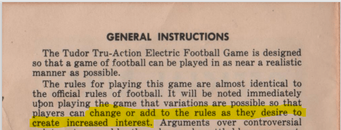 It simply amazes and overwhelms me sometimes at all the things that have been created and invented to improve the game of electric football and add to its history. From its very beginning, players of the game have always been encouraged to “change or add to the rules as they desire to create increased interest.”