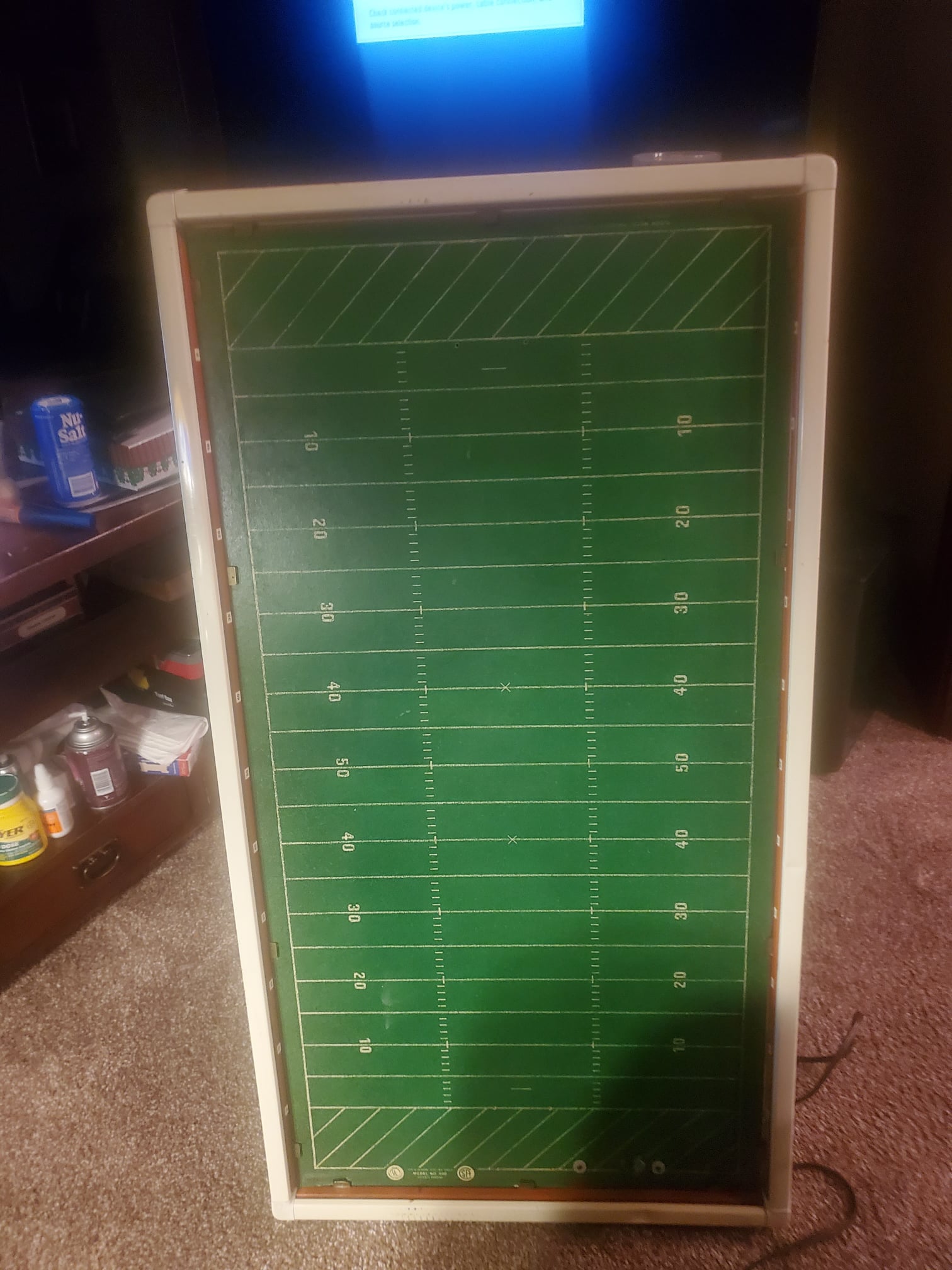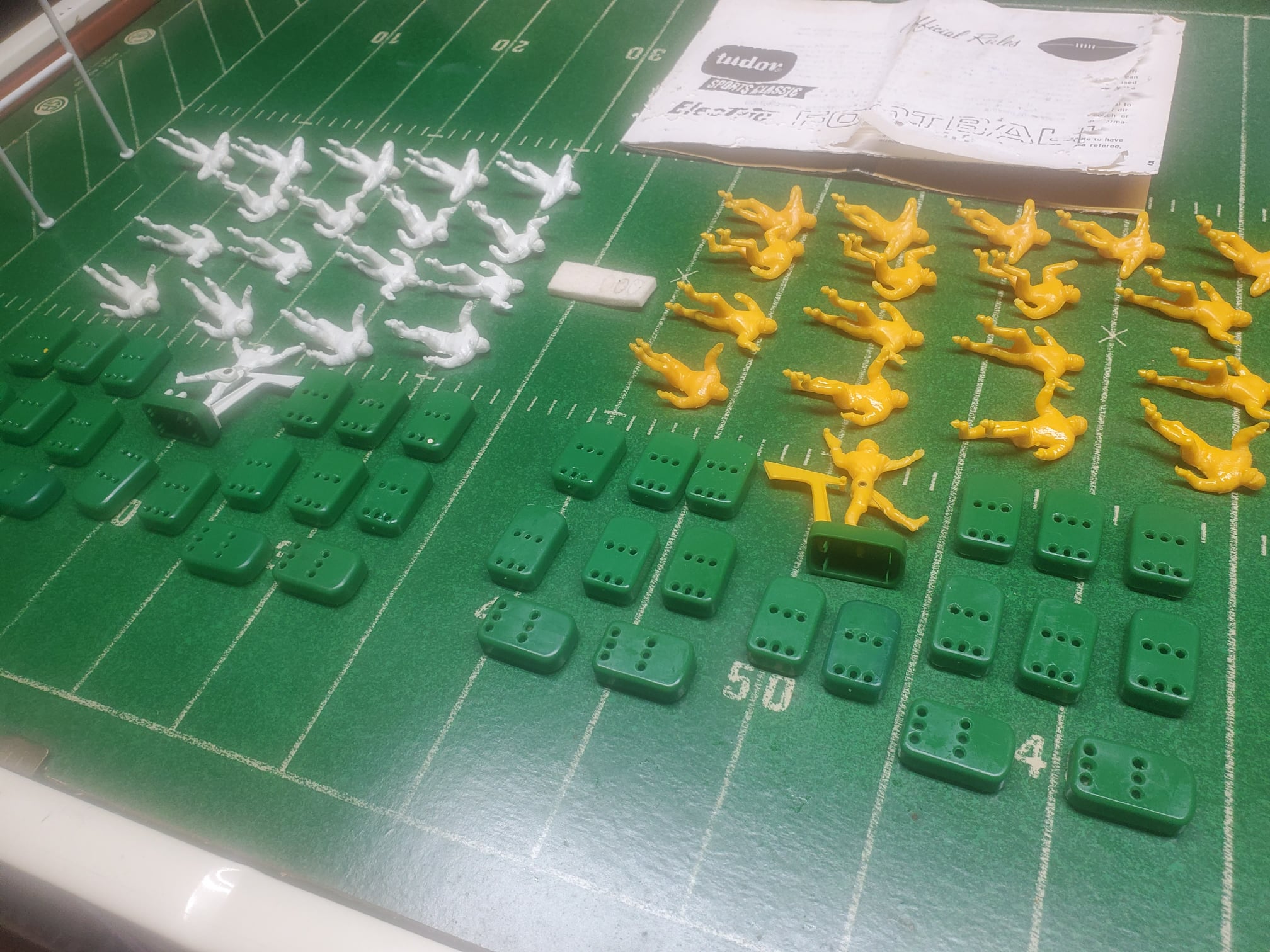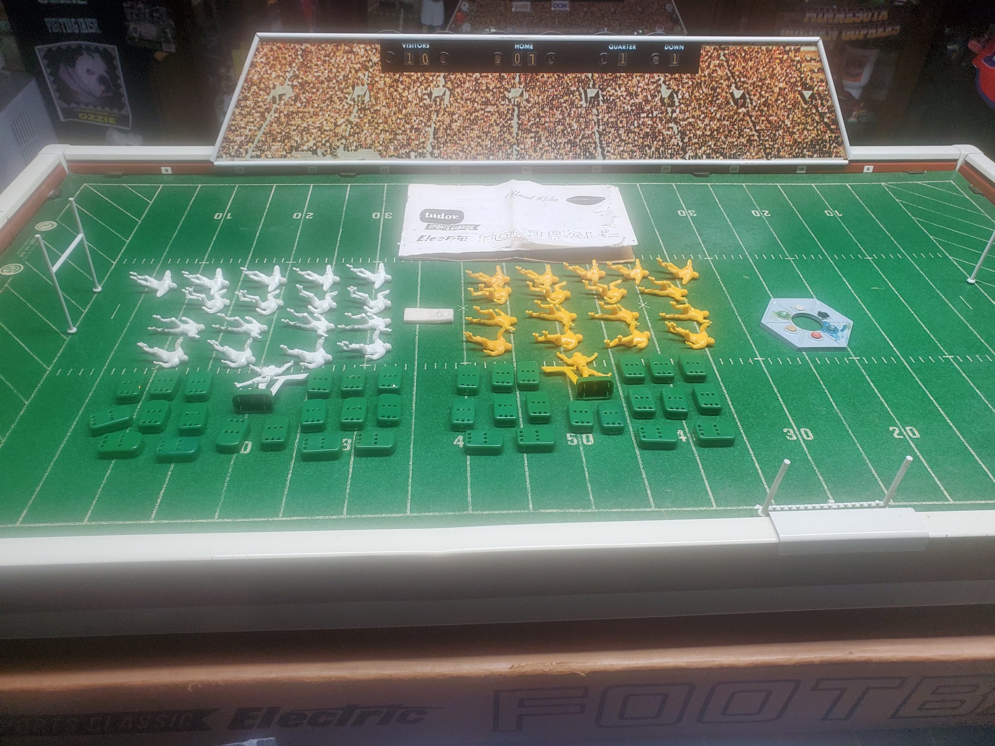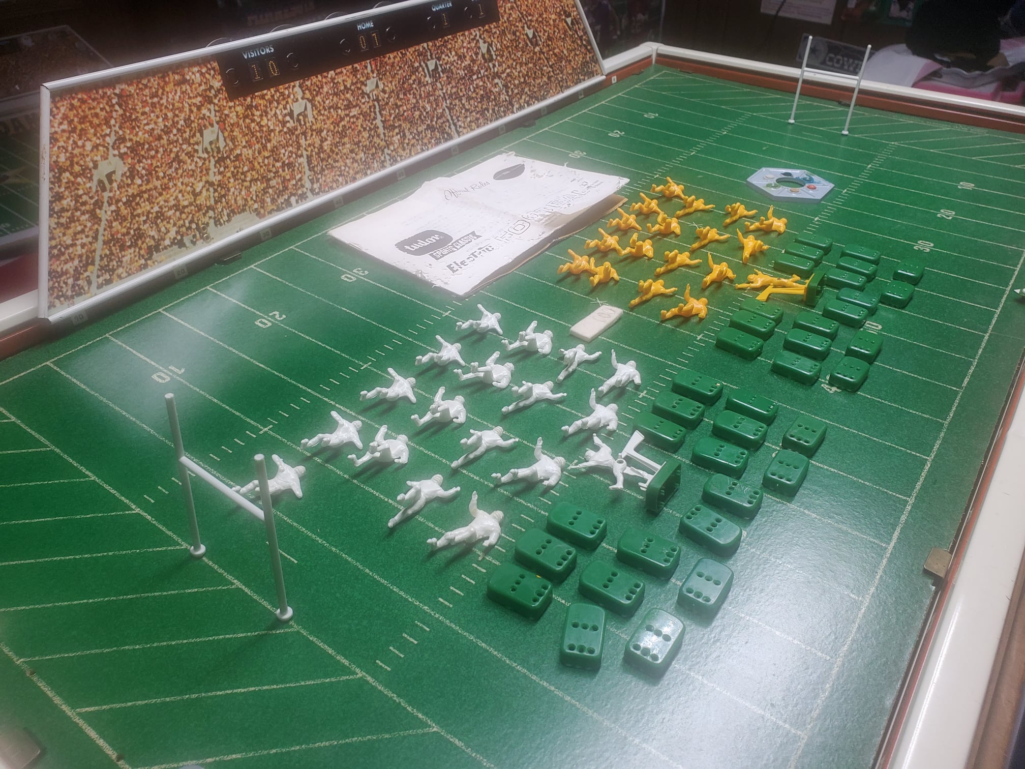 Picked up this Tudor 600 sports classic on EBAY. It’s close to 60 years old and although not in perfect condition it’s still pretty nice and has all the parts. The rule book is not all that great but readable. It has a really nice metal scoreboard which there is no way you would see today and it even has some footballs with it. The motor still runs and unlike many of these fields ( which are not metal but fiberboard ) it is not warped with age. The game sold for less than 12 dollars and bang for the buck was a really nice game. It did have however ( besides warping ) have other design problems and material problems. The players had pegs on the bottom of their feet that snapped into the 6 holes on the bases which in theory was a cool concept because you could change the angle of the player depending on which hole you put the players foot pegs into. The problem was the plastic they used was very brittle and if you tried to remove a player from the base the pegs would break off (get out the glue ). The brittle plastic was also a problem with the Quarterbacks, the passing arms would break off. This one is cool because none of the players have been put on the bases and the QB arms are not broken. The 600 classic games of course were noisy but the players ran pretty good considering there was no one tweaking bases back then. It’s my favorite Tudor game…actually the name fits – 600 classic