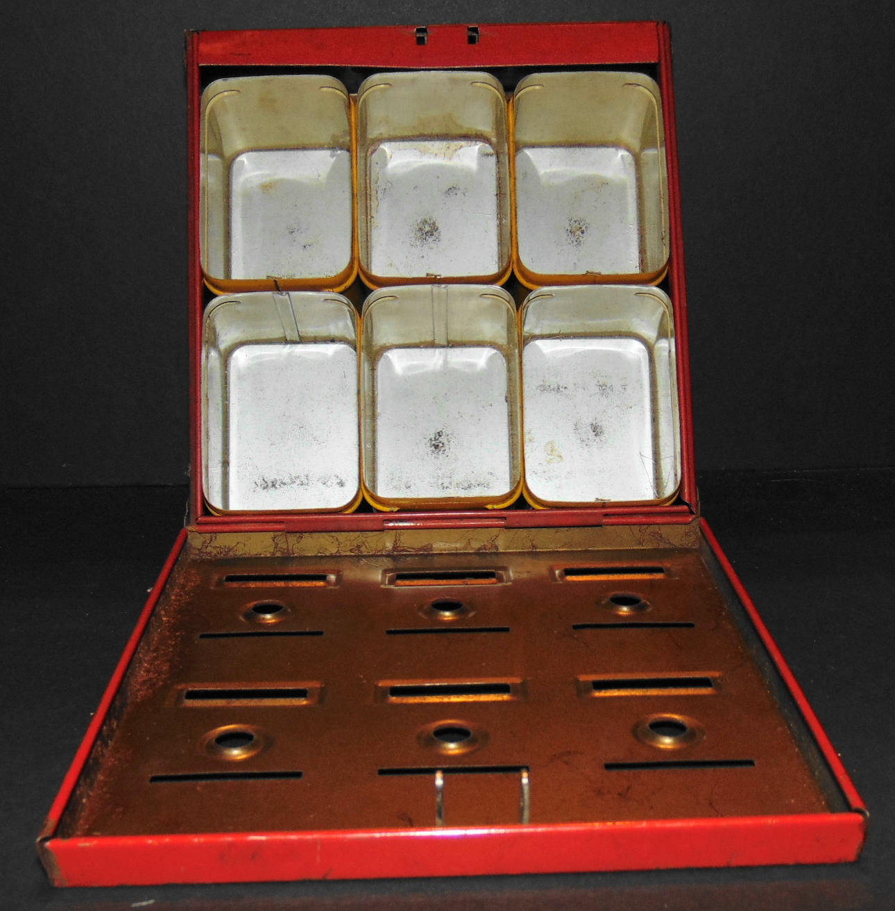 Apparently, this example is missing the lids to the inner compartments and came in a variety of colors and other configurations as a “Google Search” yielded the following images: