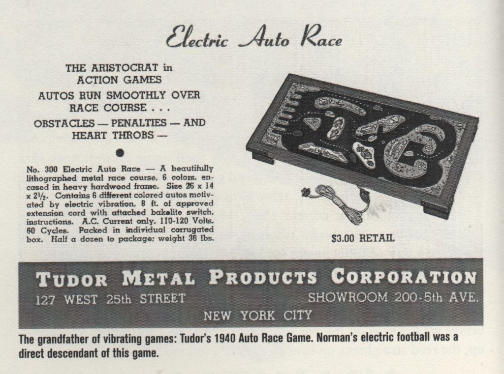 According to “The Unforgettable Buzz” Electric Football was adapted from a previous game made by Tudor using an electro-magnetic relay device, the vibrating electric horse race game which evolved from Tudor’s 1937 Electric Auto Race.