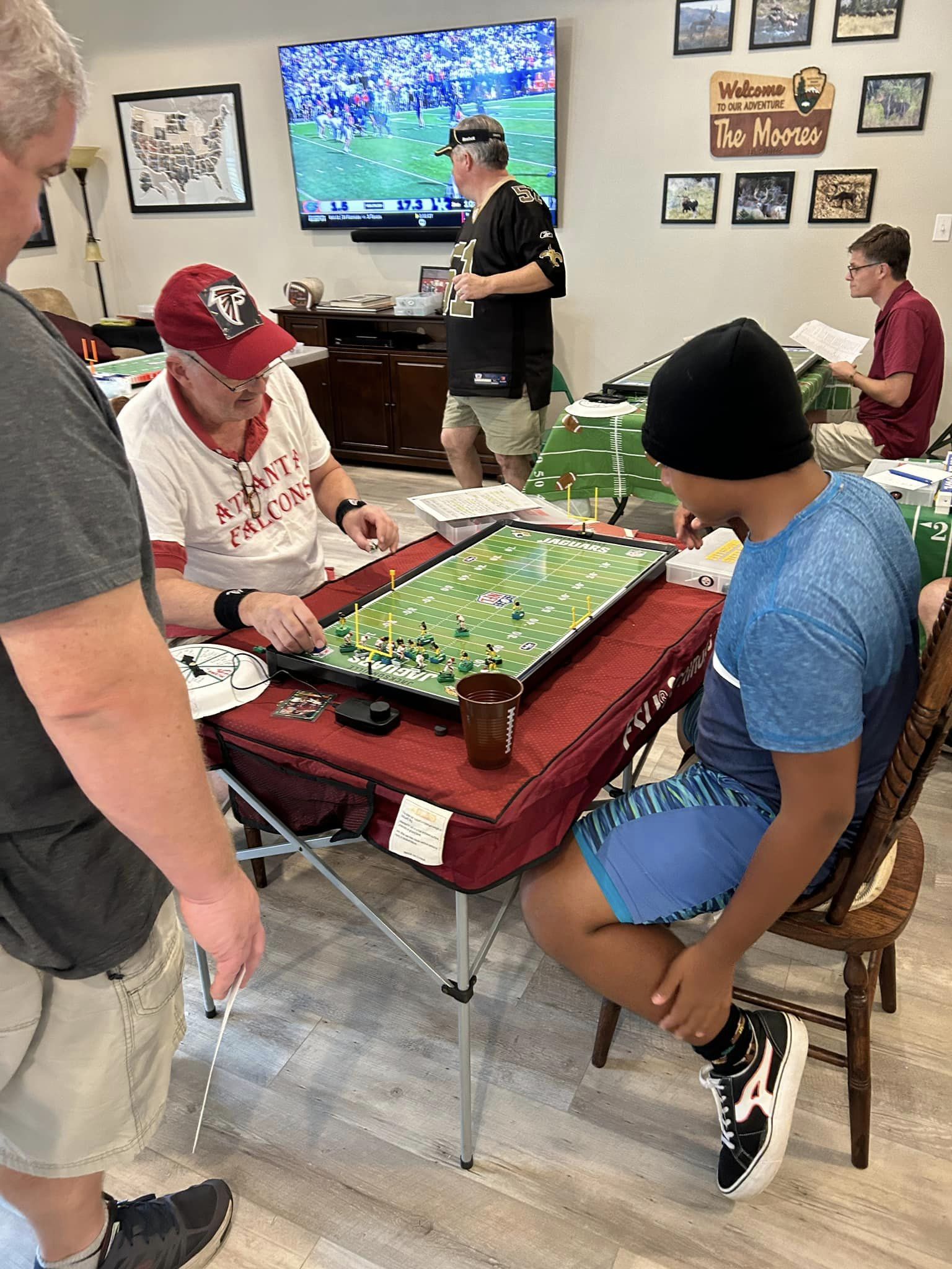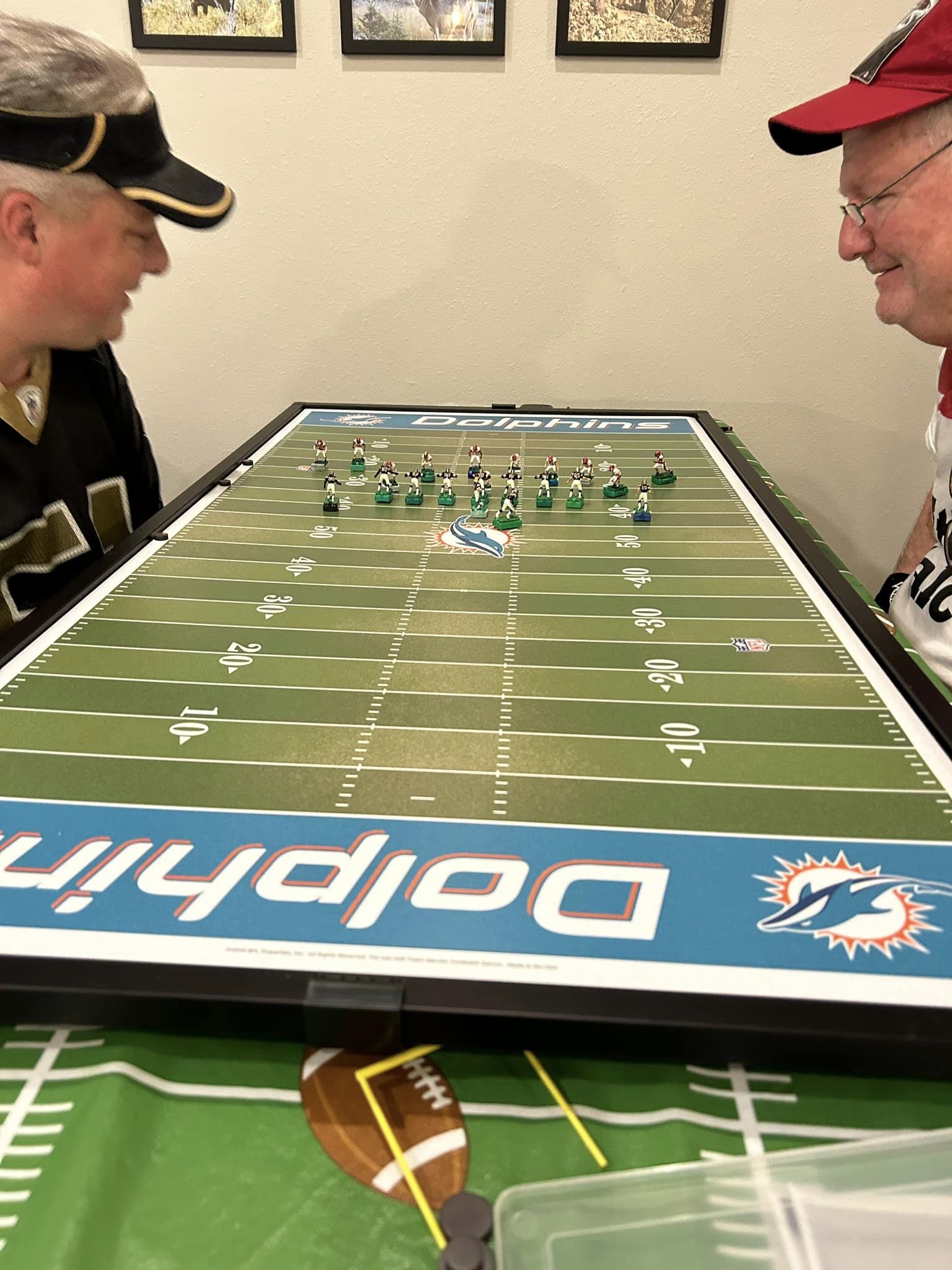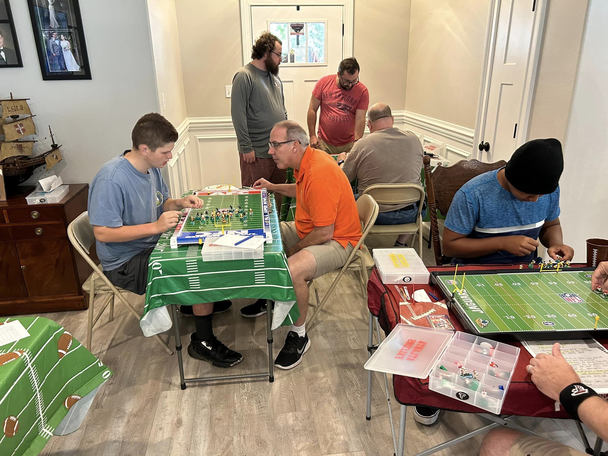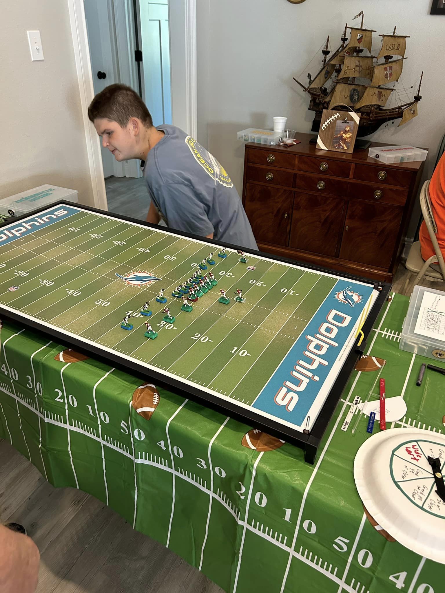 As the coaches drew their numbers, I wrote the data into a poster-sized foam board and noted the home and visitors and assigned a stadium (game board). We started with a Tudor Ultimate Board (Miami) which, being “Throwback”, we called the Orange Bowl. We had a Miggle Board which we called “Miggle Stadium”. We also had a beat-up board purchase from an Estate called the “Estate Bowl”. The newest board, and Jacksonville Jaguars Tudor 32×16 served as the “Gator Bowl”. The Saints coach brought an extra board that initially substituted for some of the Estate Bowl games. By design, after the first round, the winning team stayed on the Ultimate Board, and the losers fought through the losers’ bracket on the smaller boards. Before games and between rounds, coaches used a small Pavilion board as a practice field.