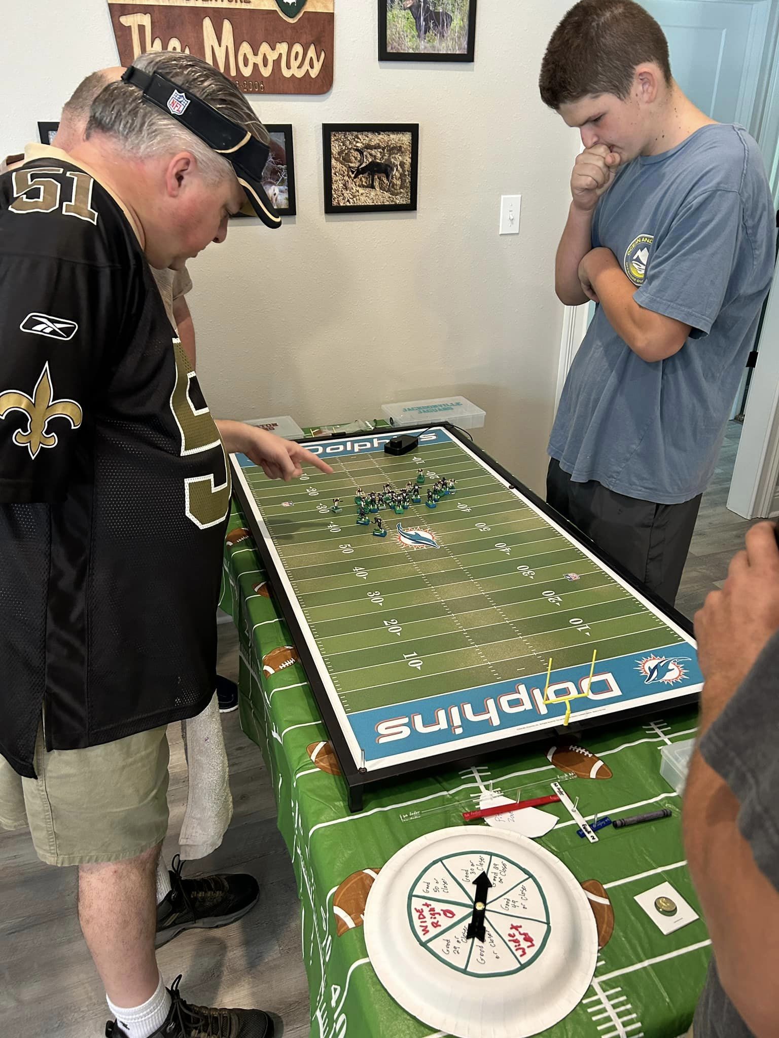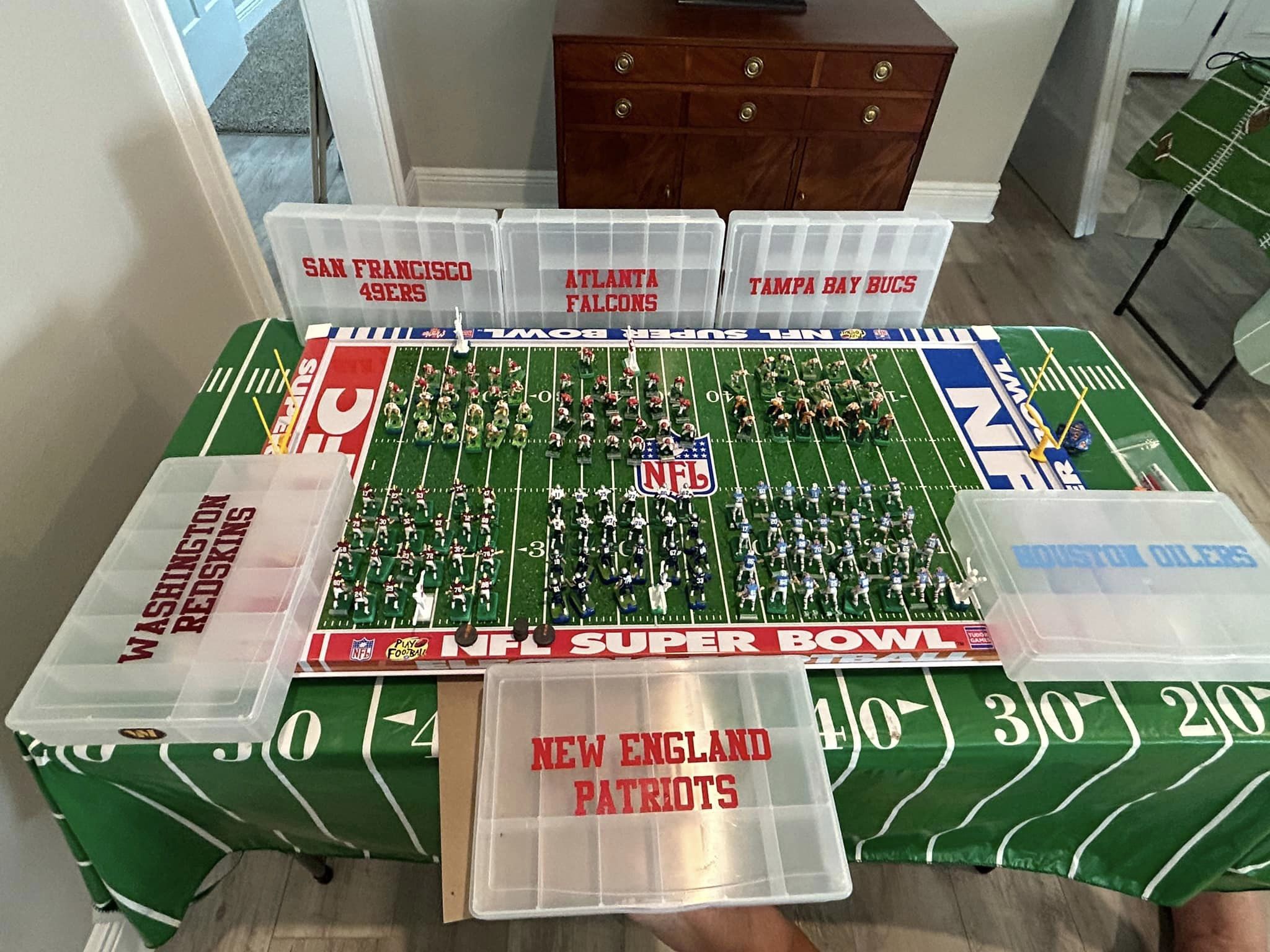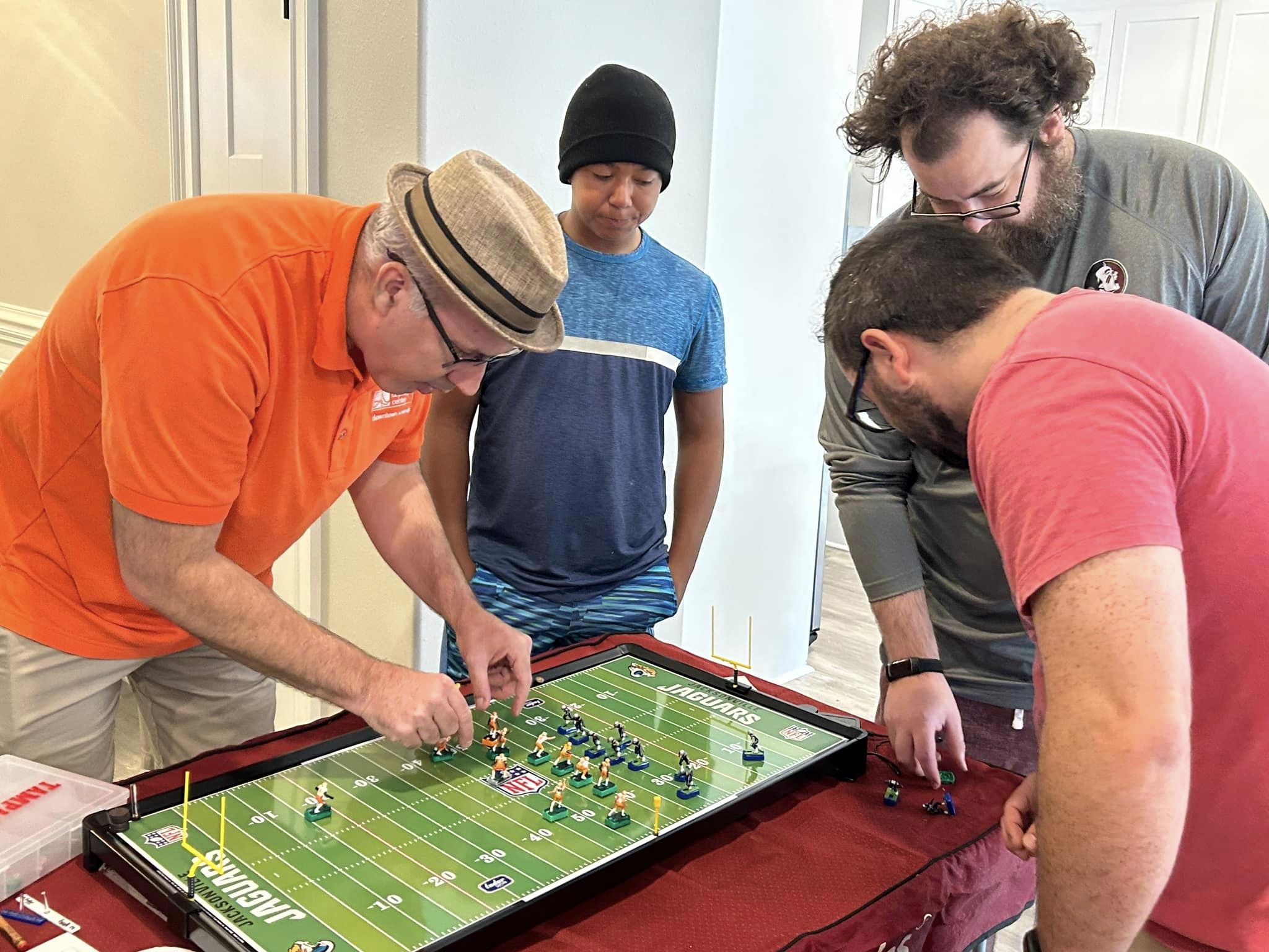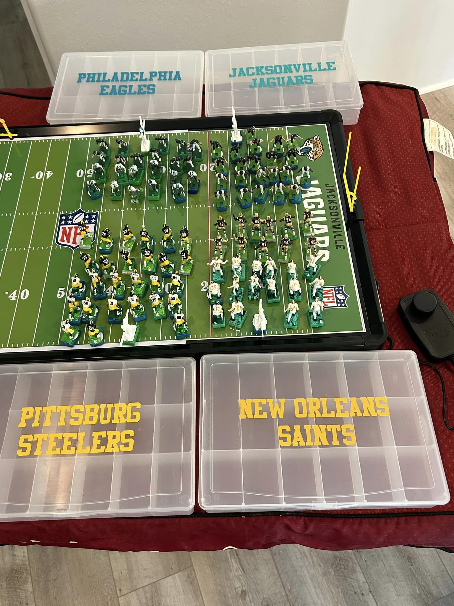 As the coaches drew their numbers, I wrote the data into a poster-sized foam board and noted the home and visitors and assigned a stadium (game board). We started with a Tudor Ultimate Board (Miami) which, being “Throwback”, we called the Orange Bowl. We had a Miggle Board which we called “Miggle Stadium”. We also had a beat-up board purchase from an Estate called the “Estate Bowl”. The newest board, and Jacksonville Jaguars Tudor 32×16 served as the “Gator Bowl”. The Saints coach brought an extra board that initially substituted for some of the Estate Bowl games. By design, after the first round, the winning team stayed on the Ultimate Board, and the losers fought through the losers’ bracket on the smaller boards. Before games and between rounds, coaches used a small Pavilion board as a practice field.