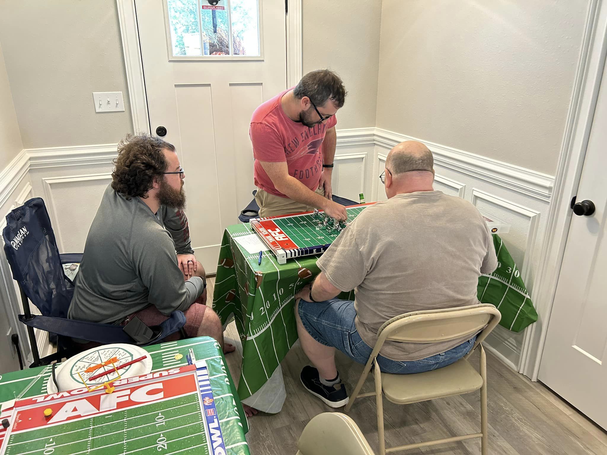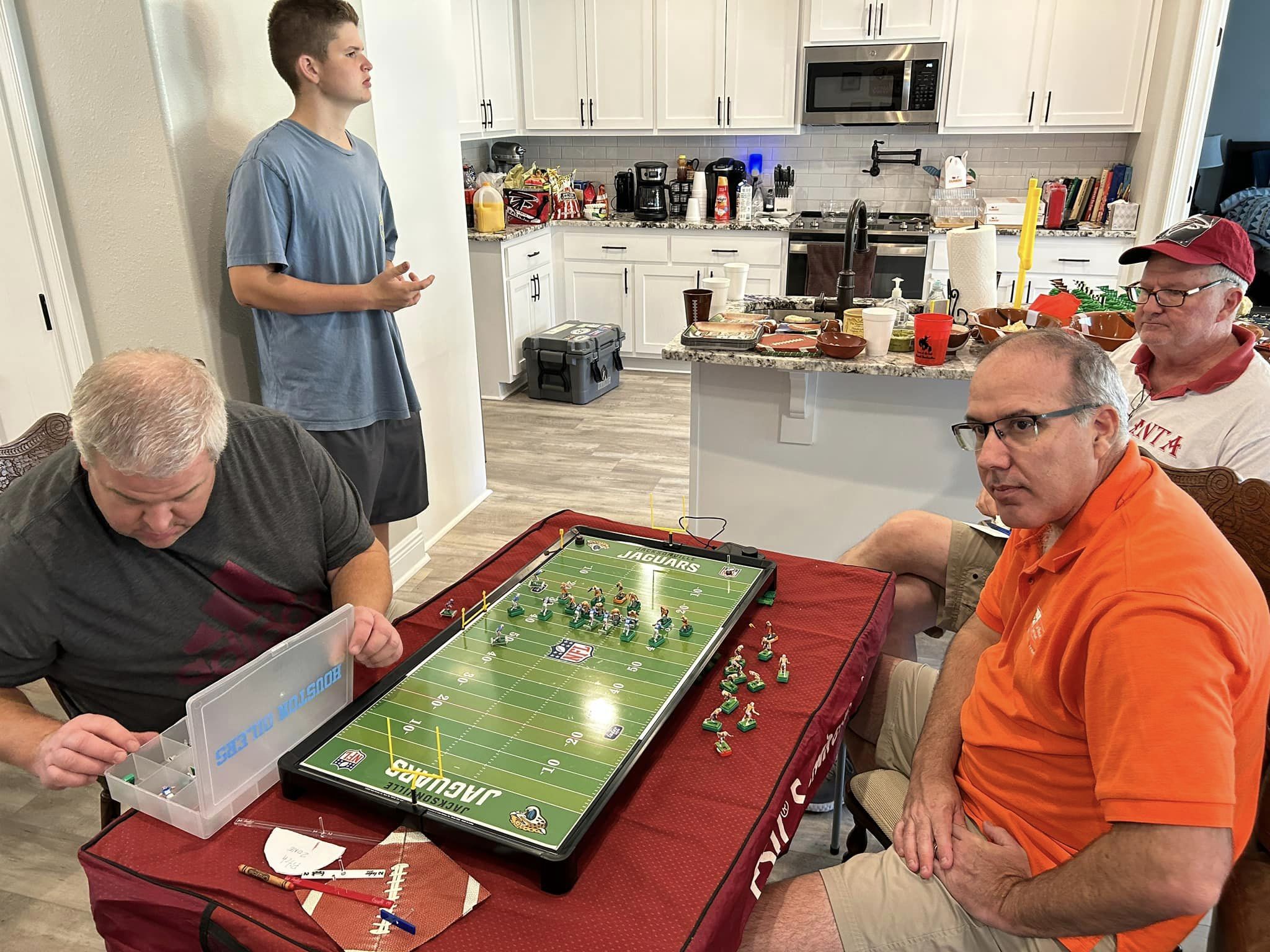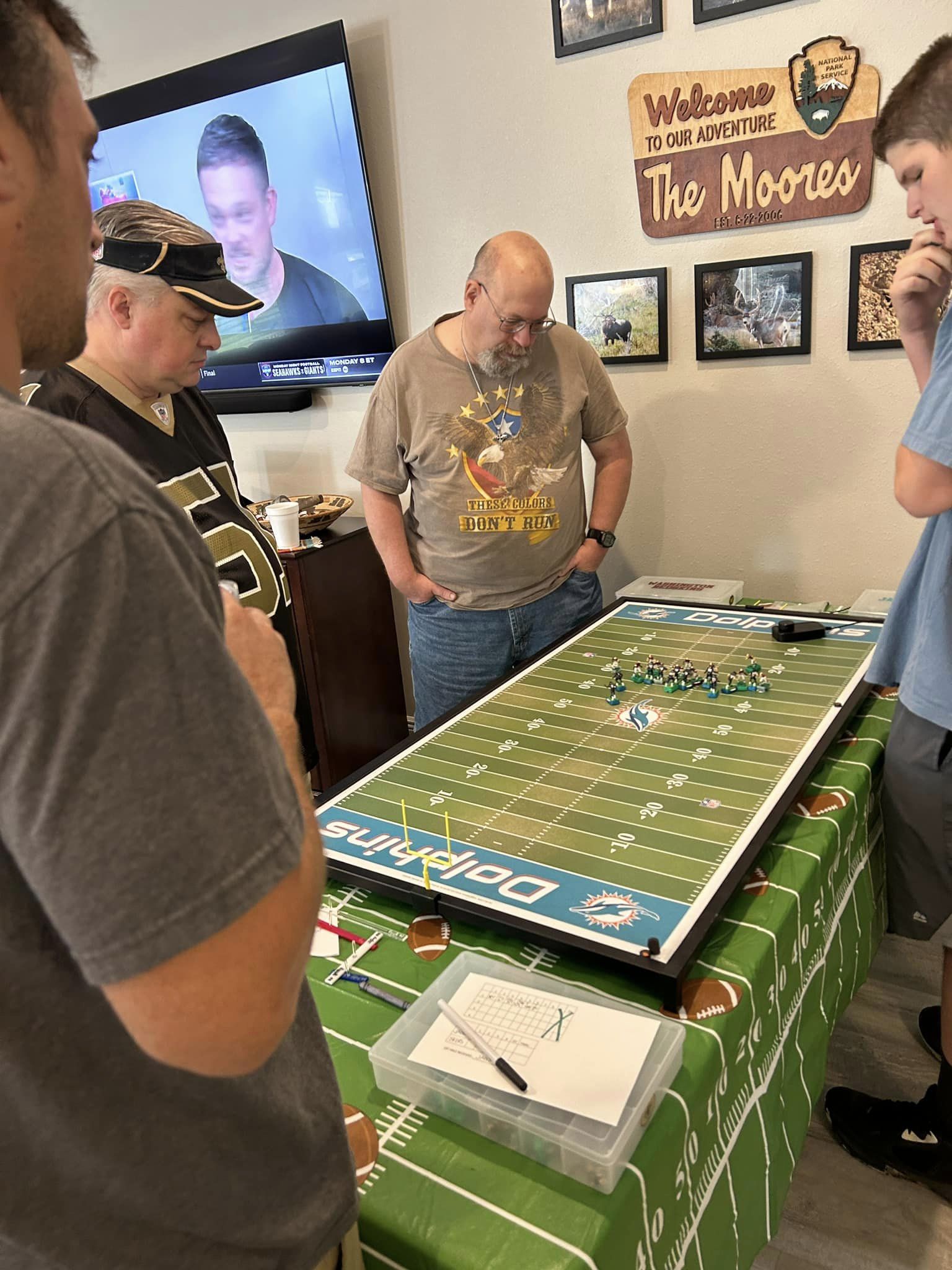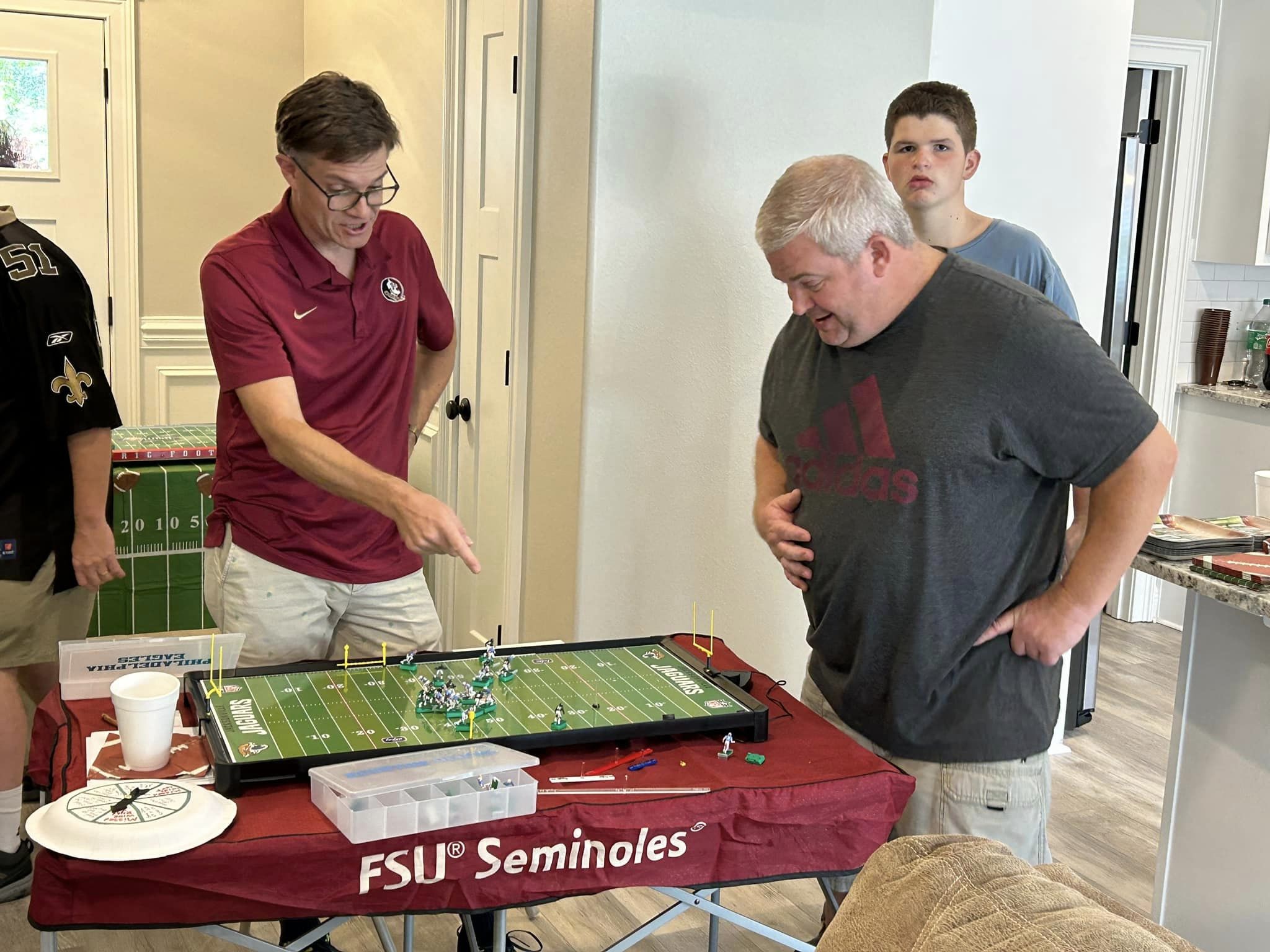 As the coaches drew their numbers, I wrote the data into a poster-sized foam board and noted the home and visitors and assigned a stadium (game board). We started with a Tudor Ultimate Board (Miami) which, being “Throwback”, we called the Orange Bowl. We had a Miggle Board which we called “Miggle Stadium”. We also had a beat-up board purchase from an Estate called the “Estate Bowl”. The newest board, and Jacksonville Jaguars Tudor 32×16 served as the “Gator Bowl”. The Saints coach brought an extra board that initially substituted for some of the Estate Bowl games. By design, after the first round, the winning team stayed on the Ultimate Board, and the losers fought through the losers’ bracket on the smaller boards. Before games and between rounds, coaches used a small Pavilion board as a practice field.