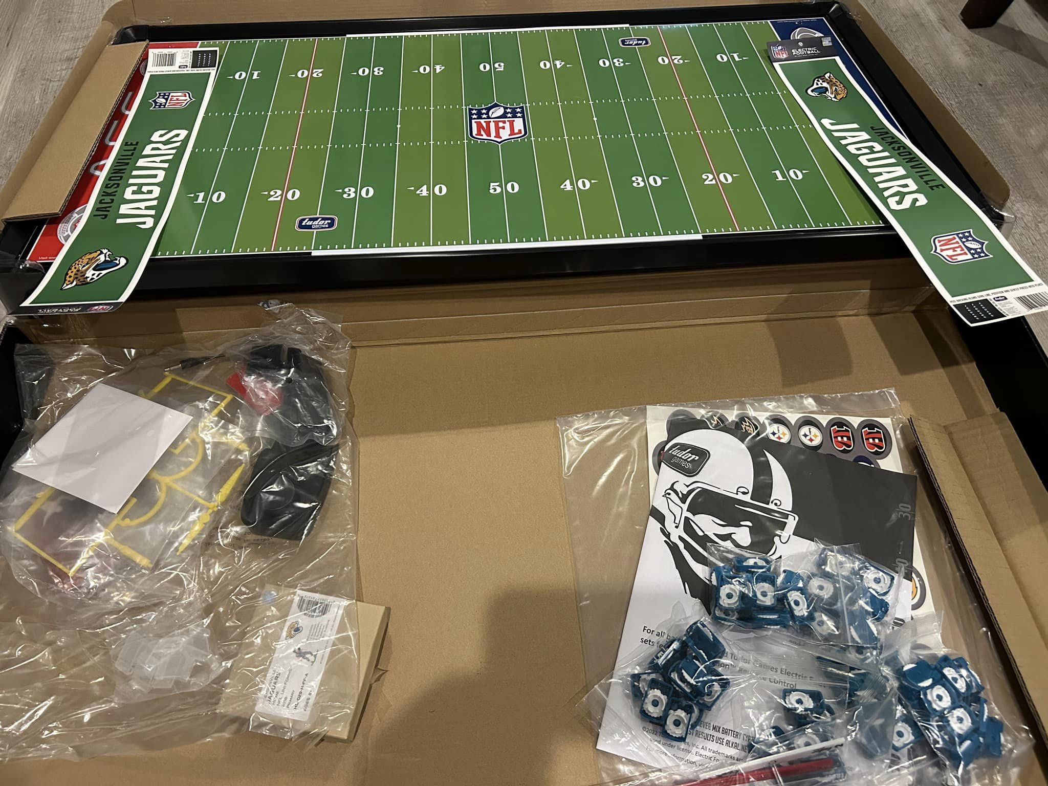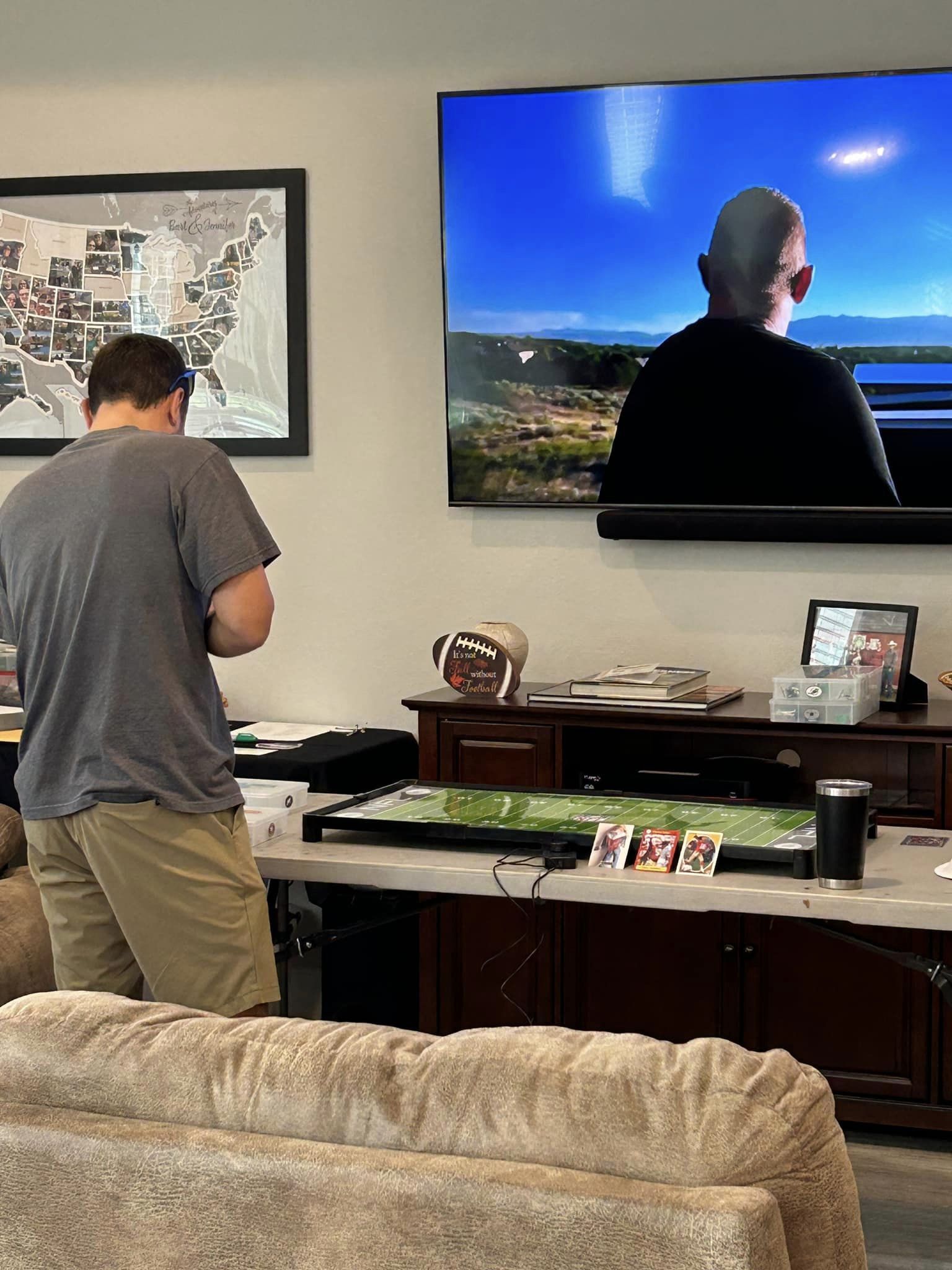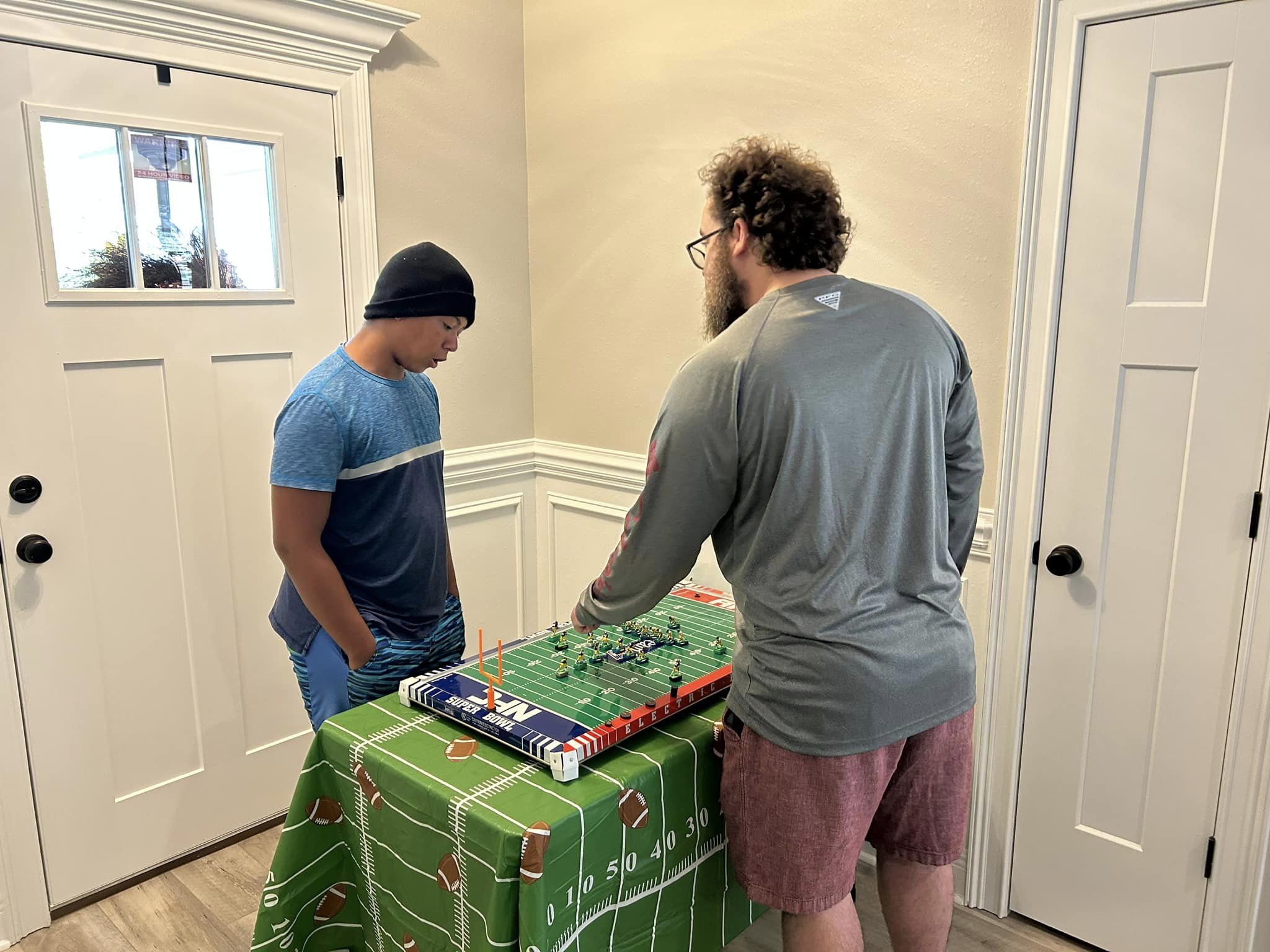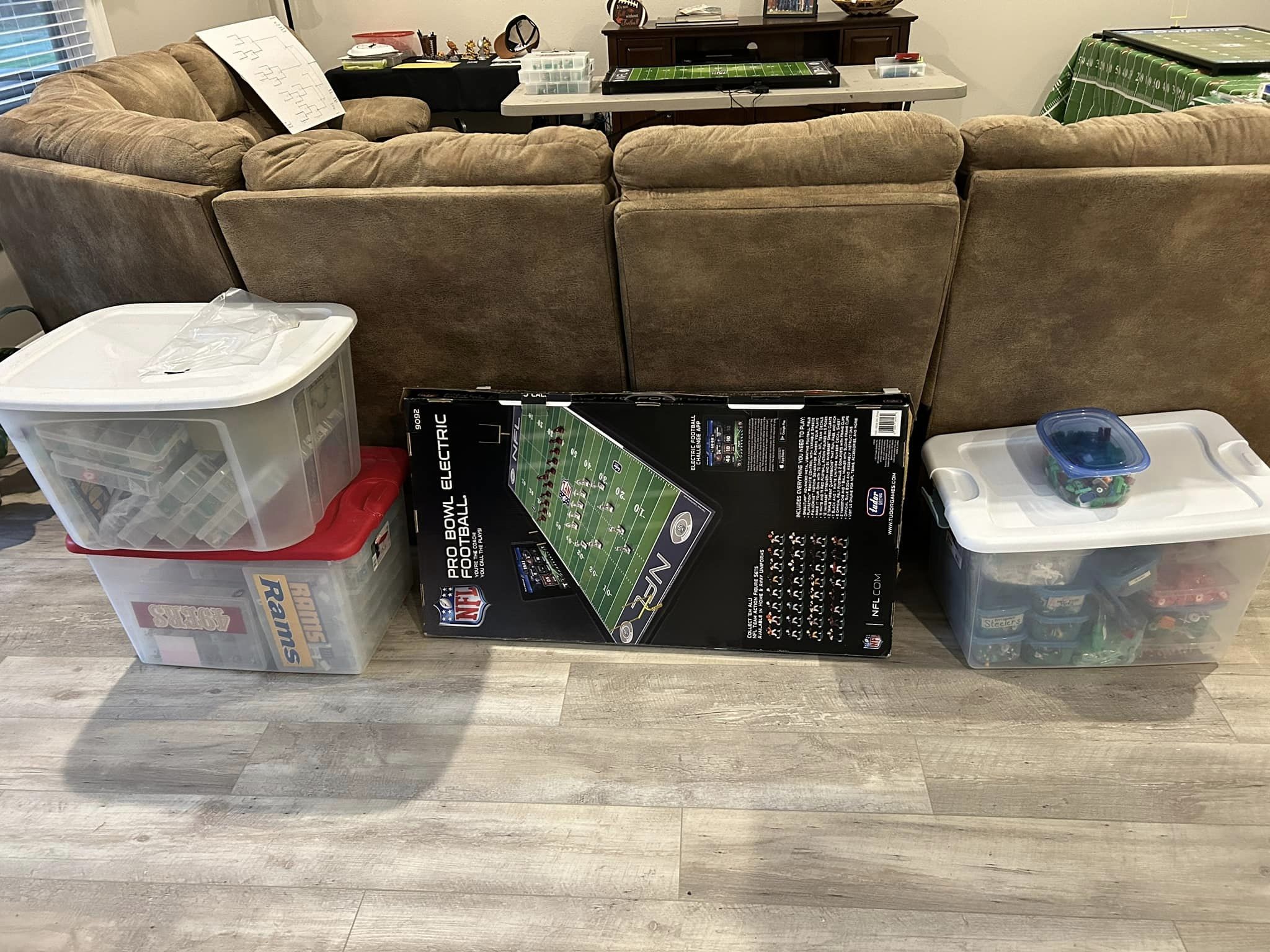 As the coaches drew their numbers, I wrote the data into a poster-sized foam board and noted the home and visitors and assigned a stadium (game board). We started with a Tudor Ultimate Board (Miami) which, being “Throwback”, we called the Orange Bowl. We had a Miggle Board which we called “Miggle Stadium”. We also had a beat-up board purchase from an Estate called the “Estate Bowl”. The newest board, and Jacksonville Jaguars Tudor 32×16 served as the “Gator Bowl”. The Saints coach brought an extra board that initially substituted for some of the Estate Bowl games. By design, after the first round, the winning team stayed on the Ultimate Board, and the losers fought through the losers’ bracket on the smaller boards. Before games and between rounds, coaches used a small Pavilion board as a practice field.