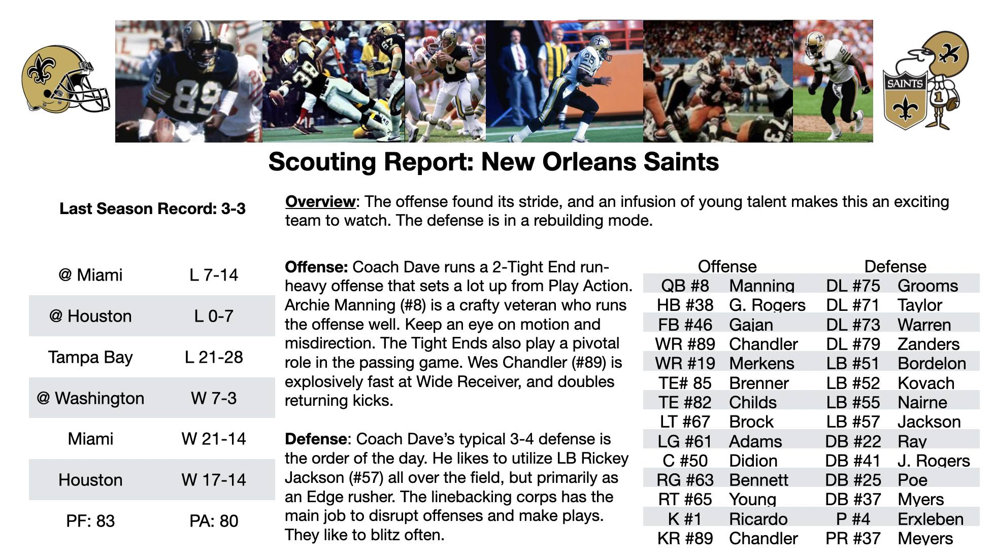 It was not to be. What was expected to be a shoot-out turned into a defensive battle. Late in the game, Saints QB Archie Manning rolled right looking to hit running back George Rogers on a swing pass. An Atlanta defender raced toward the running back. Just before the buzzer stopped, the Saints runner smashed into the Atlanta defender, knocking the Falcon to the ground. Manning quickly hit the runner with a Triple Threat QB pass as the hapless defender lay on his back. The receiver turned, and the defender jumped to his feet, but the Saints great raced to the five-yard line before going out of bounds. The Falcons defense re-grouped and stood tall in the Red Zone, but Manning found Wes Chandler for a short TD pass putting the Saints up 7-0, with time running out.