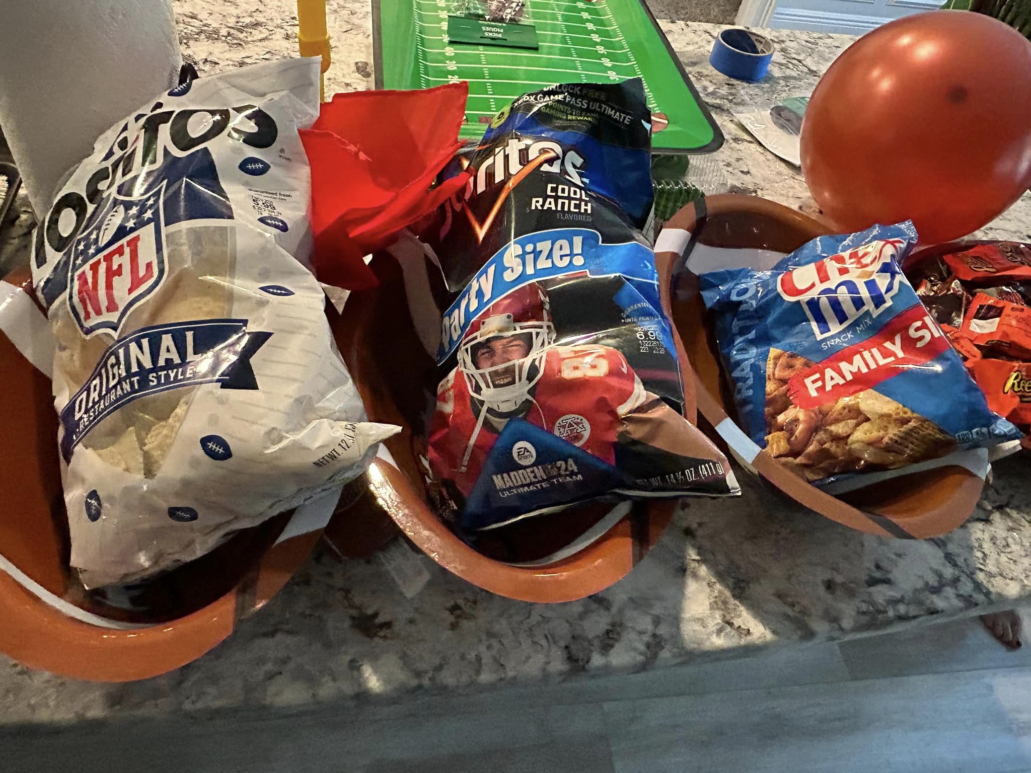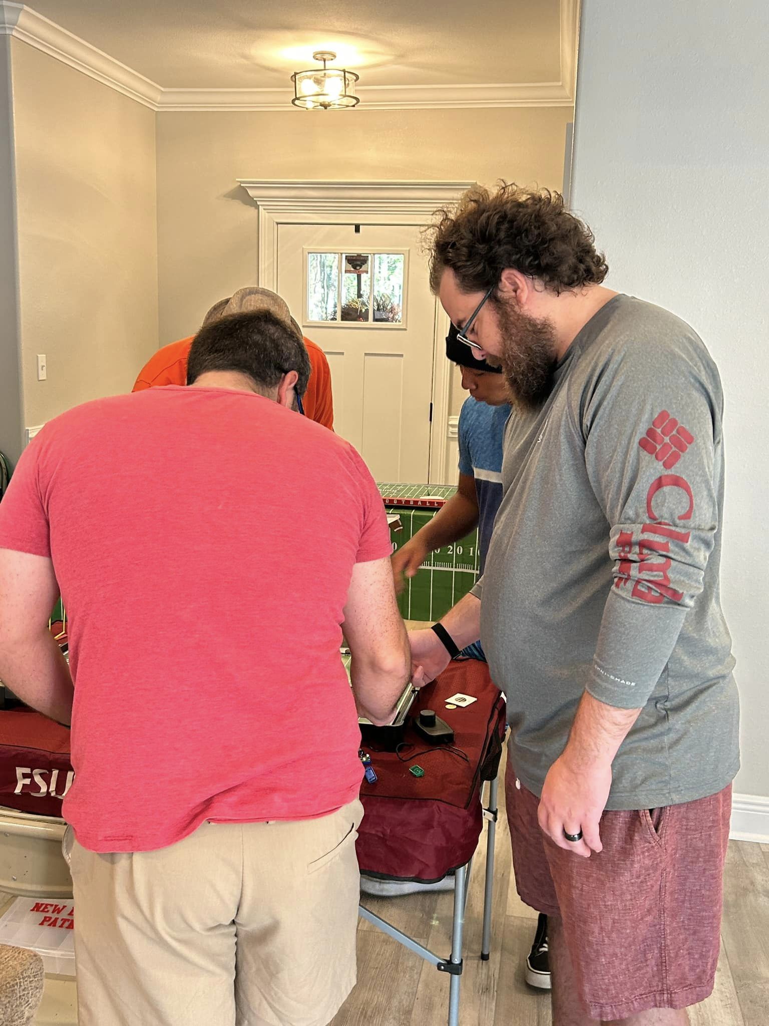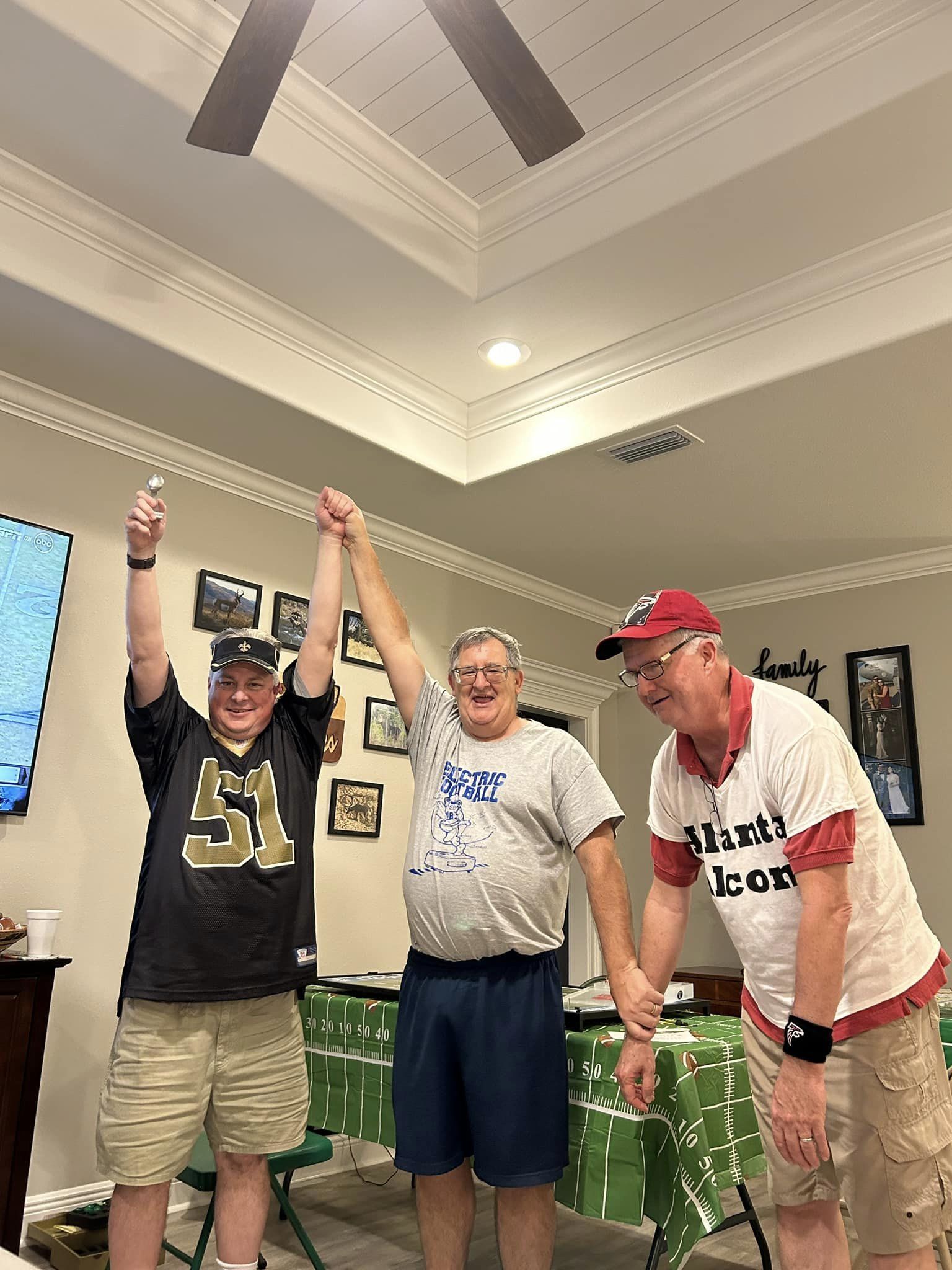 The Rookie tournament began at 8:30 a.m. with coffee and donuts. Upon arrival, each coach drew a folded paper with a number from the Commissioner’s “Go Buck Naked” Duluth Trading Company ballcap. Each coach received a 3D printed football-shaped key chain embossed with a commemorative sticker as their “coaching credentials”. The Commissioner’s wife, and co-host, Jennifer, crafted the key chains, printed goal posts, picked up the donuts and a sandwich tray from the local Publix grocery store. She bought all the necessary snacks and beverages. For dessert, since each coach hoped to be paired against a “cupcake” in the opening round of the double-elimination tournament, she selected green frosted cupcakes. For her hard work and dedication, the Commissioner appointed her as League Chief Financial Officer. As CFO, she set the limits on how much the Commissioner could spend on this endeavor. Once the games began, Jennifer took three of the other coach’s wives to get their nails done.