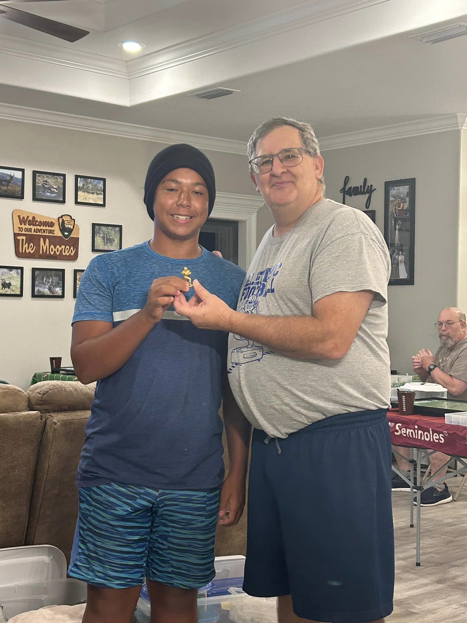 We are not in the part of Florida that makes up Georgia’s armpit, but if you push past the sweaty pit hairs, you can see and smell Georgia’s underarm from our North Florida residence. Thus, picking who got to be the Jaguars was not easy. “Hacksaw”, a 14-year-old Eagle Scout Coach took Jacksonville. In his first game, the Jacksonville offense, led by QB Treavor Lawrence and Running back E-T-N could not progress against the Washington Redskin defense. Hacksaw elected to move # 85, Tim Tebow, from Tight End to Quarterback. Timmy responded with a long bootleg scramble that set up a touchdown. For a brief moment, I knew why I wanted to host this adventure. Although Jacksonville lost 7-6, the excitement of a lad thinking he was coming to a “Madden” tournament but adapting to a “real” game gave us joy. Although he was the first coach eliminated, Hacksaw graciously accepted the “Mr. Irrelevant” good sport award. The other teenaged coach made the wild card round and earned Rookie of the Year (ROY) honors and top offense honors.