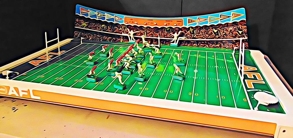 Because it was as a Christmas present from our parents or Santa that so many of us received our first games of ELELCTRIC FOOTBALL. For me, it was Christmas of 1970 or 1971 (I can’t really remember which, but I think I was 13 years old which would make it 1970). Anyway, it was the first and only AFL version of electric football that Tudor produced featuring 2 AFL teams and a special edition game board. You can see a pic of that game here in our game collection section of the nefgm.org website: NEFGM Game Collections