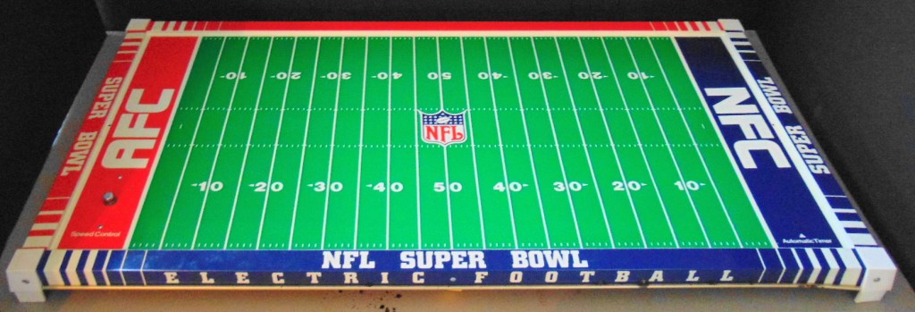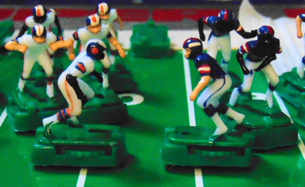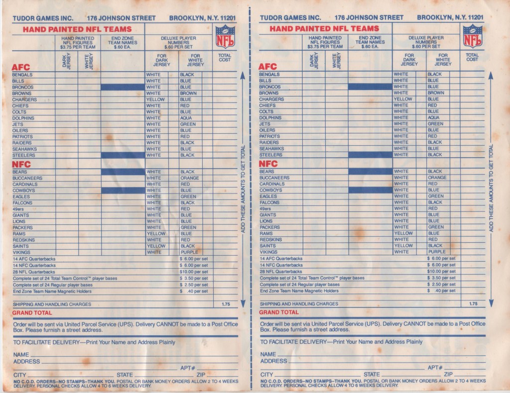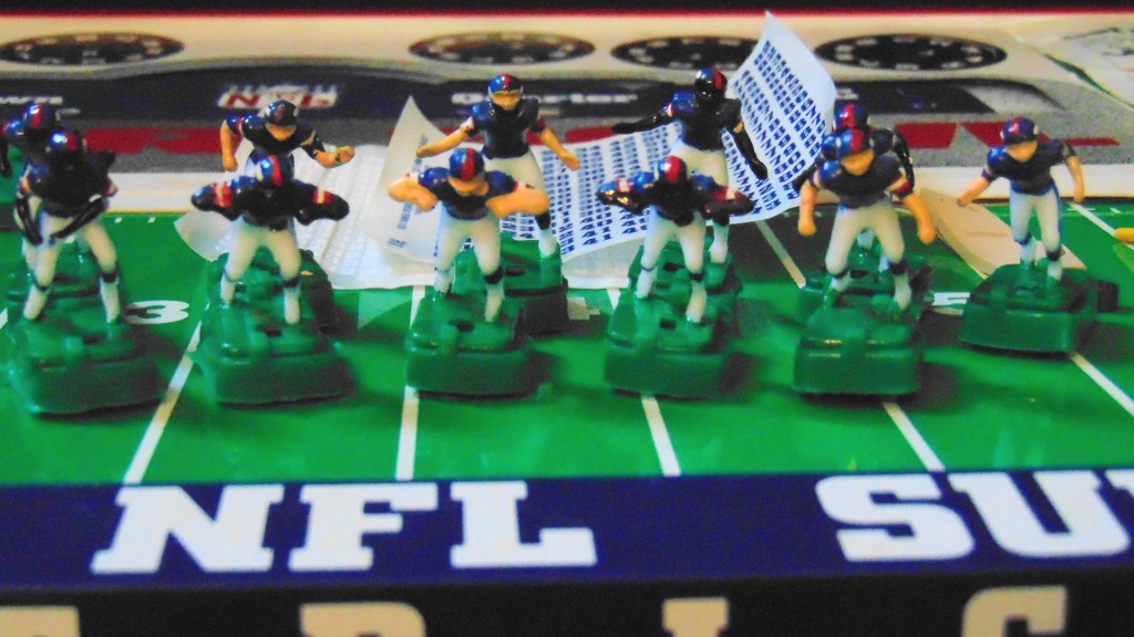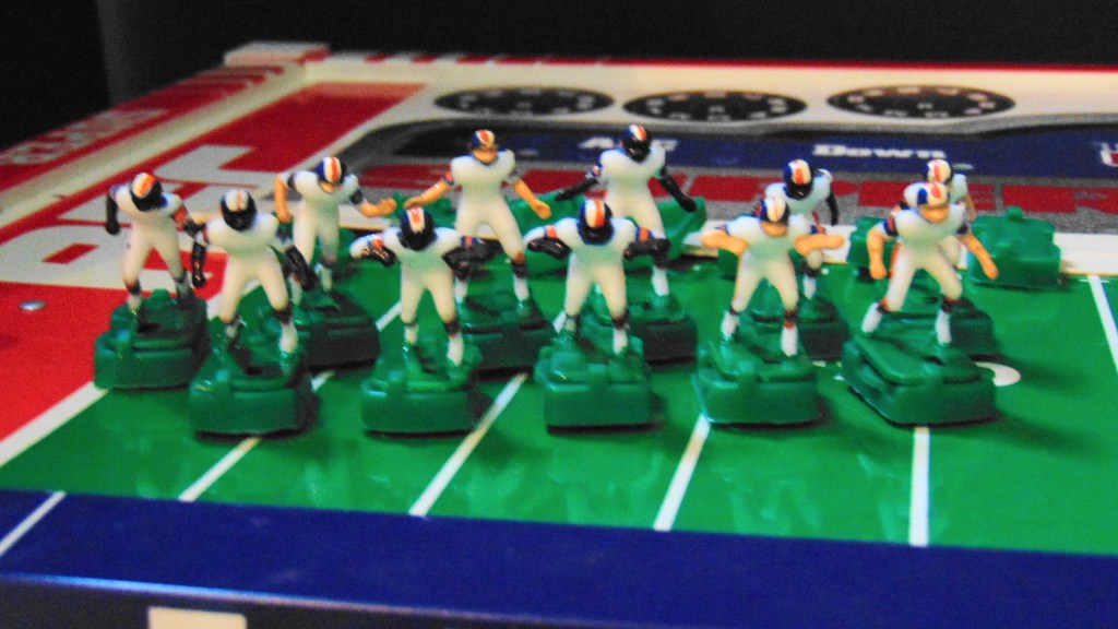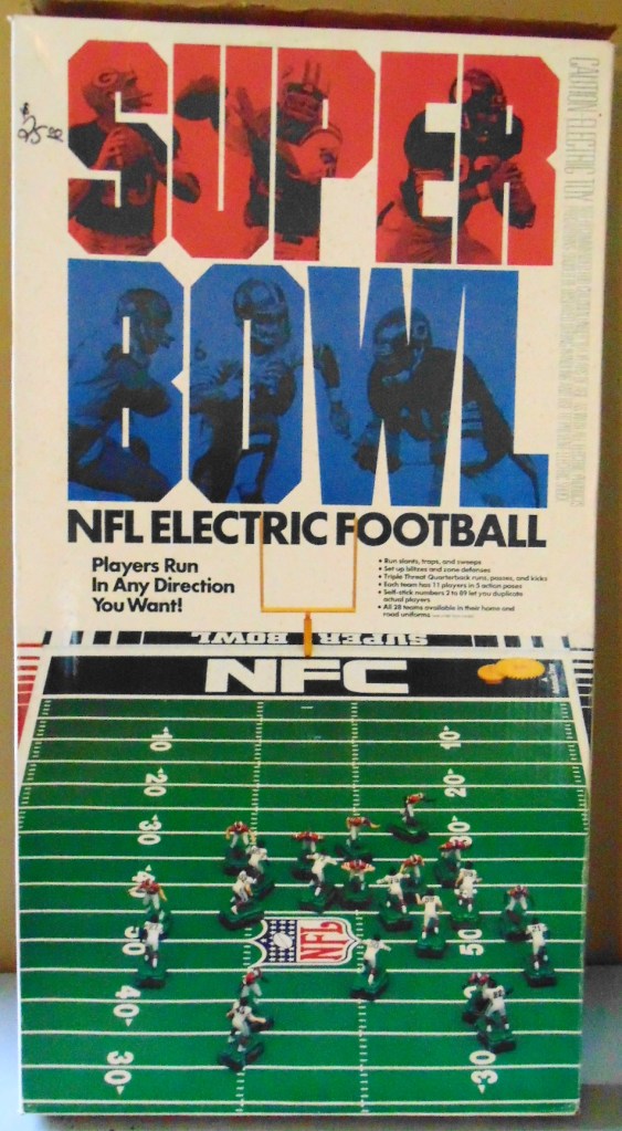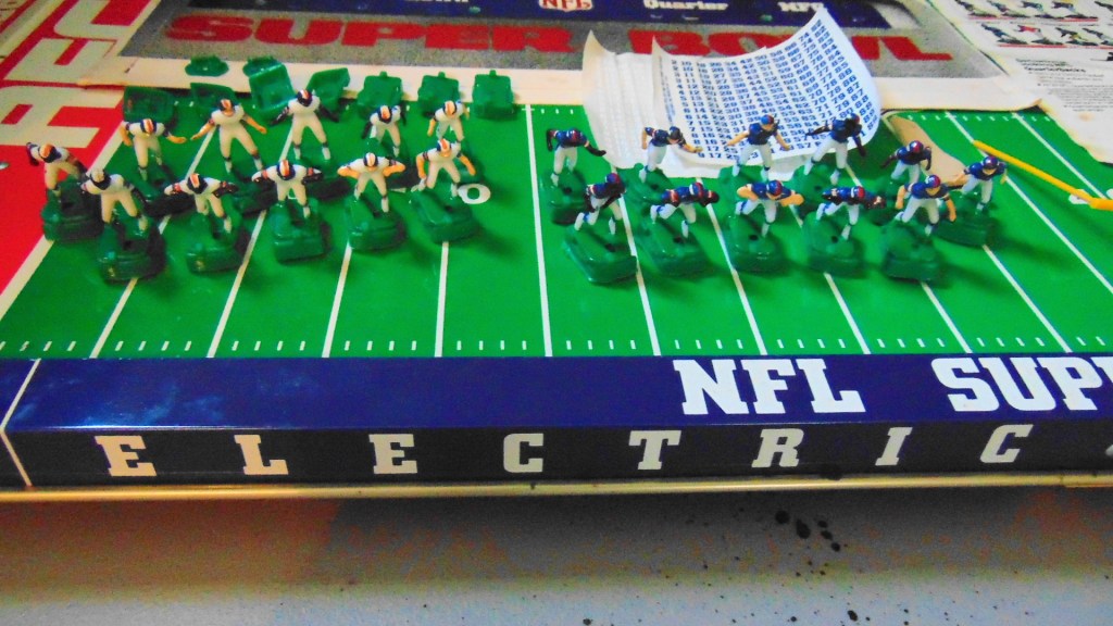 This game is from 1987 and includes the Broncos in white uniforms and the Giants in dark uniforms. Teams pictured on the box are the Bears and Patriots from the previous years Super Bowl.
