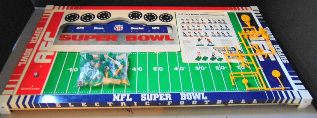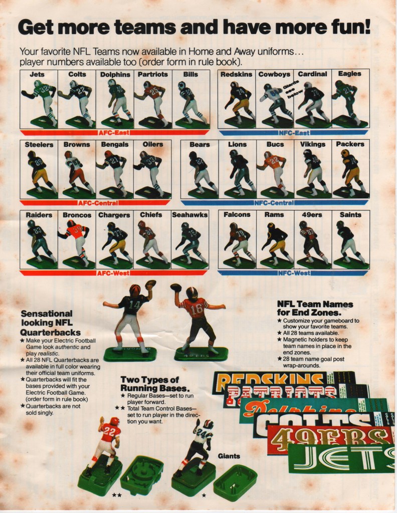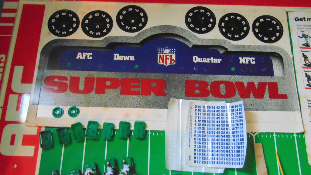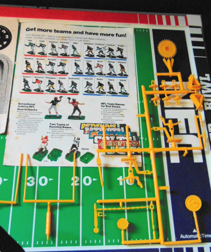 This set is in very good condition and in almost unused condition. The accessories are still attached to the sprue except for the goal posts and the scoreboard has never been assembled. The number sheets are still complete and the figures are unbroken except fot one Giants tackle figure that has an arm broken but still attached and can be glued back in place.