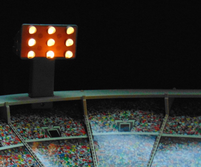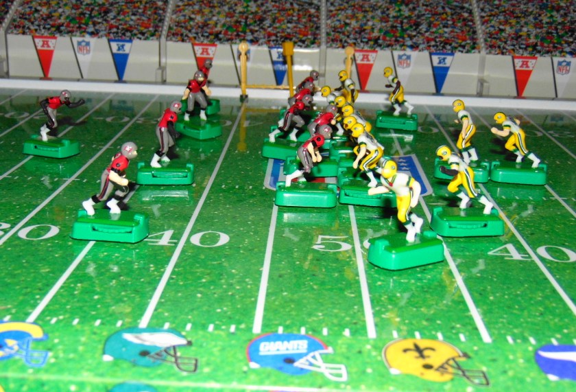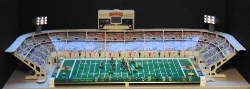 This particular game is one of three in the museum’s collection. The teams included with this game are the Packers in white and the Buccaneers in dark uniforms. Of the other Monday Night Football games, one includes the Packers and Colts and one is a gameboard only. These games and the lighted stadium were originally produced beginning in 1997.