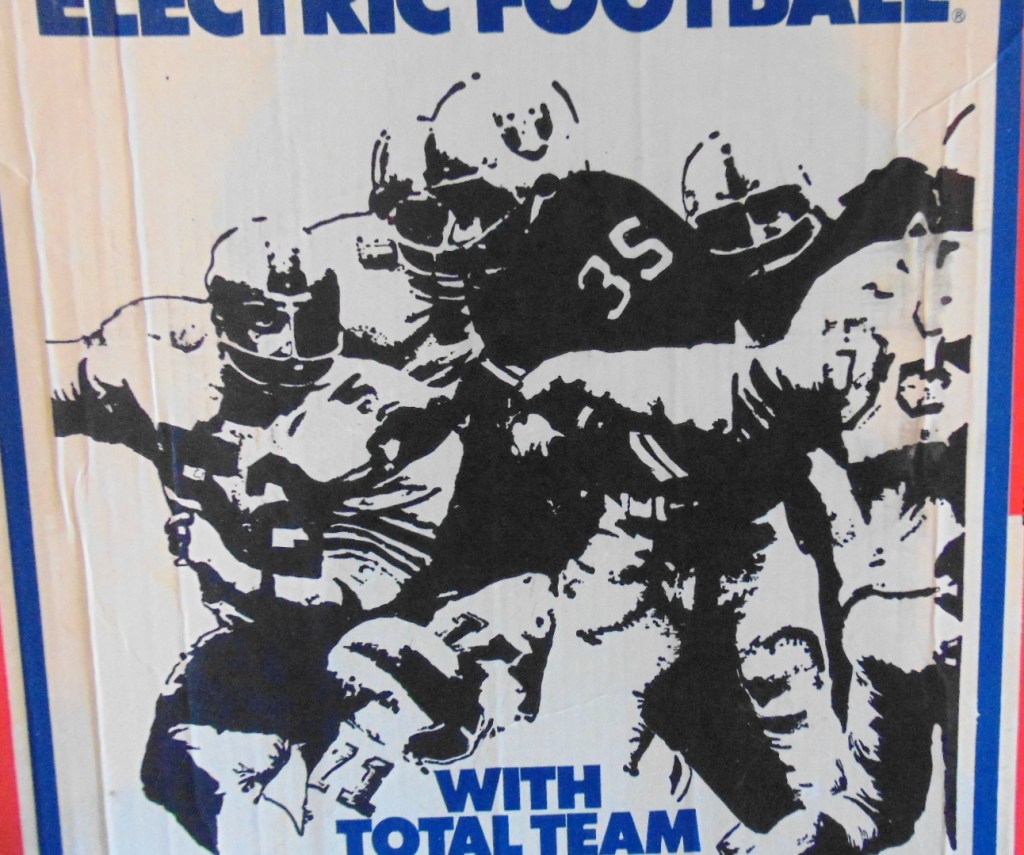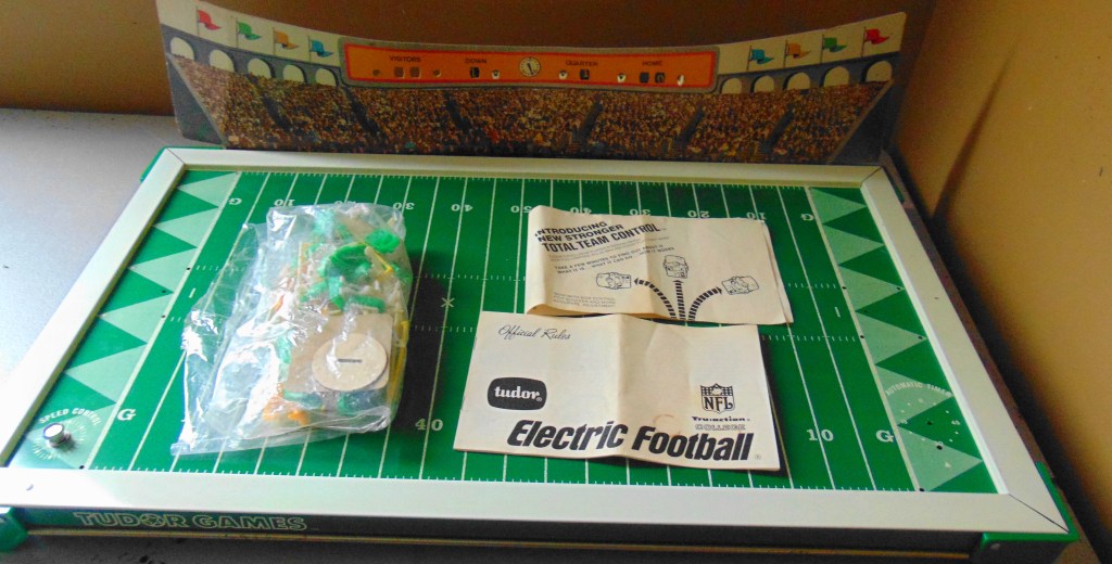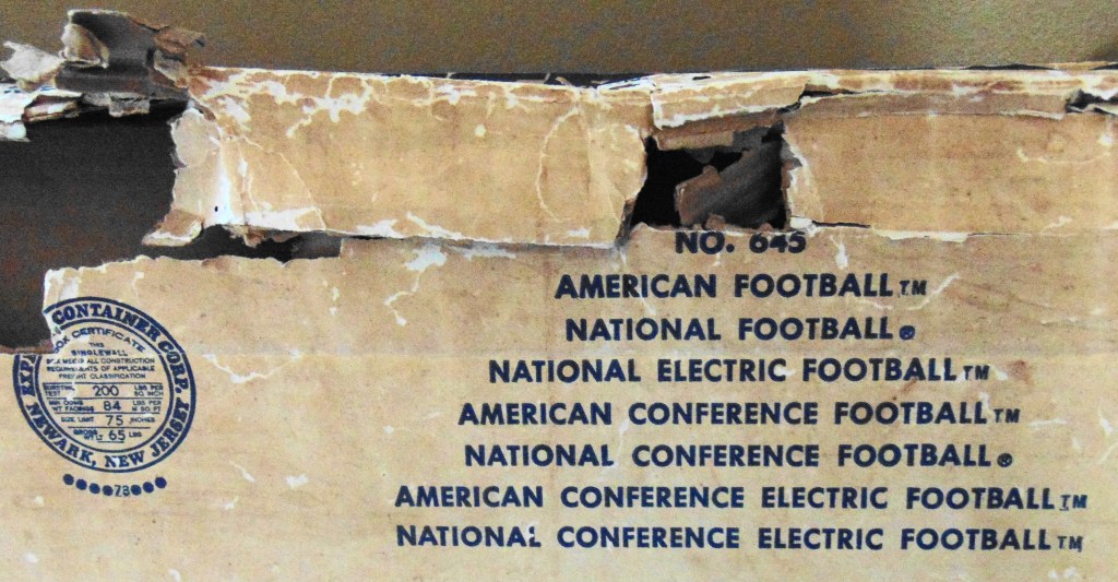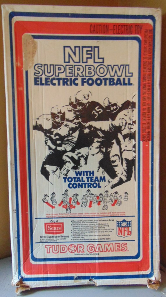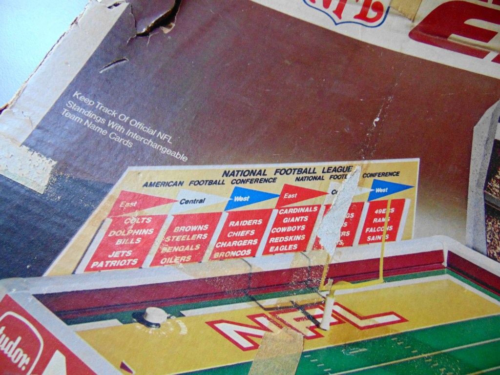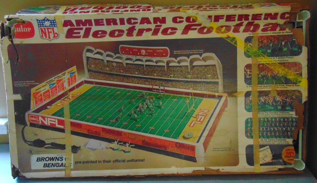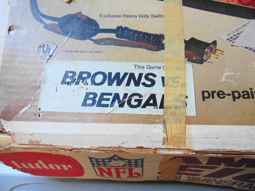 Tudor NFL American Conference Electric Football Model #610. “Browns vs. Bengals”. Game board – Good Condition (One broken leg corner) . Box -Extremely Poor Condition.