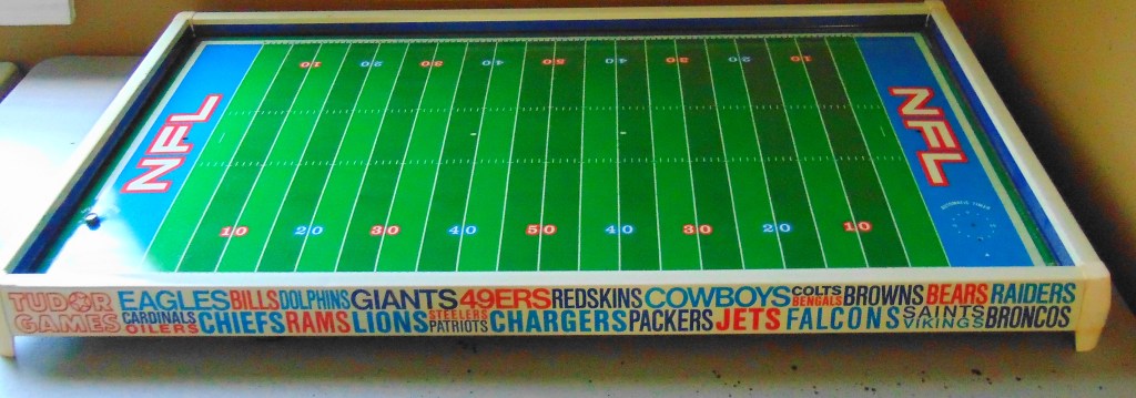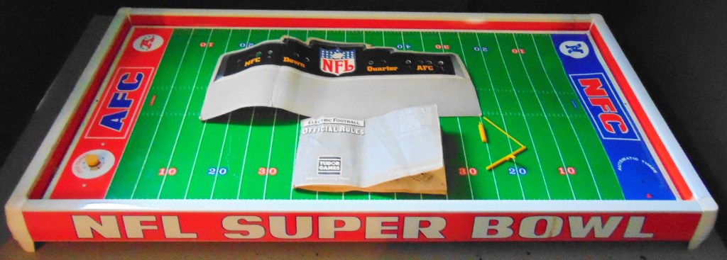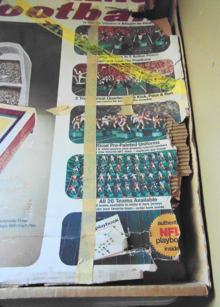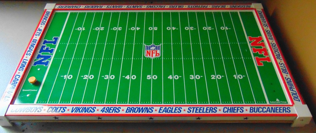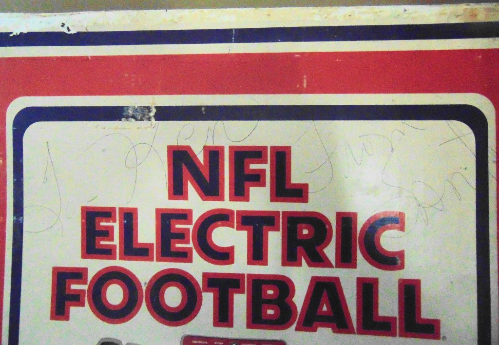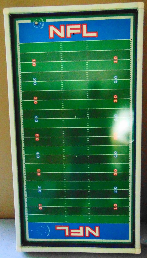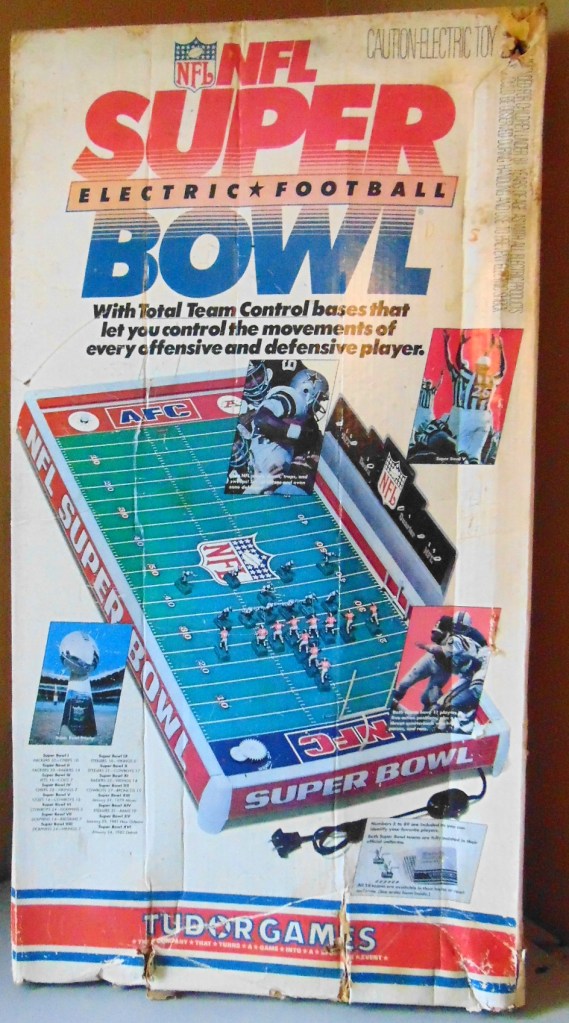 Tudor NFL American Conference Electric Football Model #610. “Browns vs. Bengals”. Game board – Good Condition (One broken leg corner) . Box -Extremely Poor Condition.
