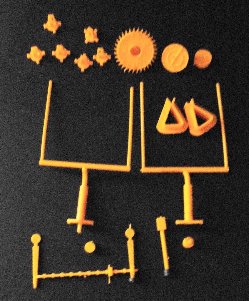 1972 Tudor Official Electric Football Model #500. Missing and broken parts. 2 complete teams of yellow (one broken arm RB) and white players with TTC bases.