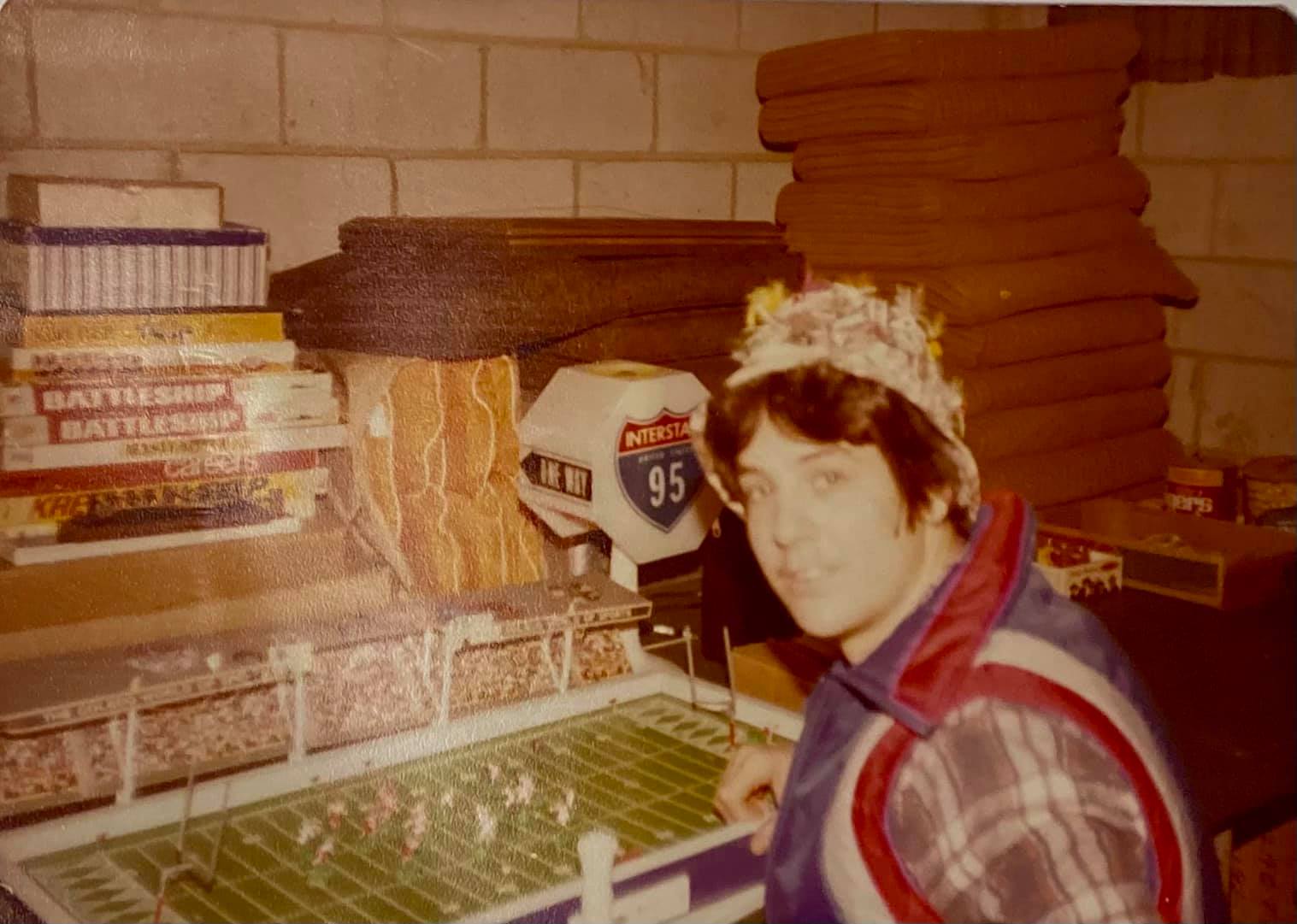Ron as a teen with his first electric football game and as an adult with his current stadium setup.