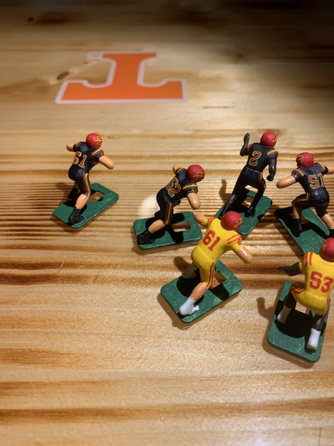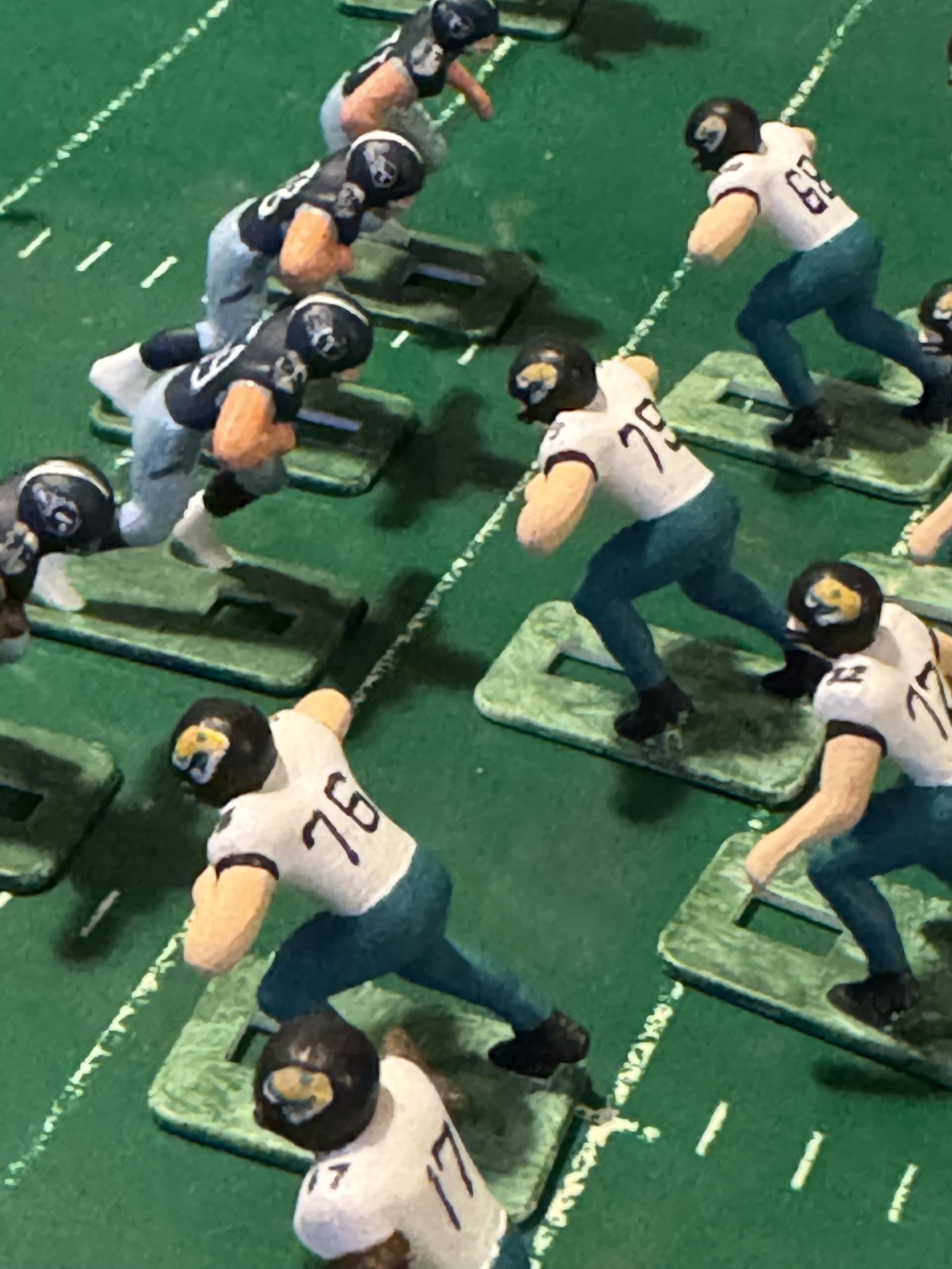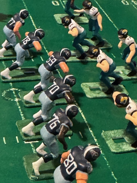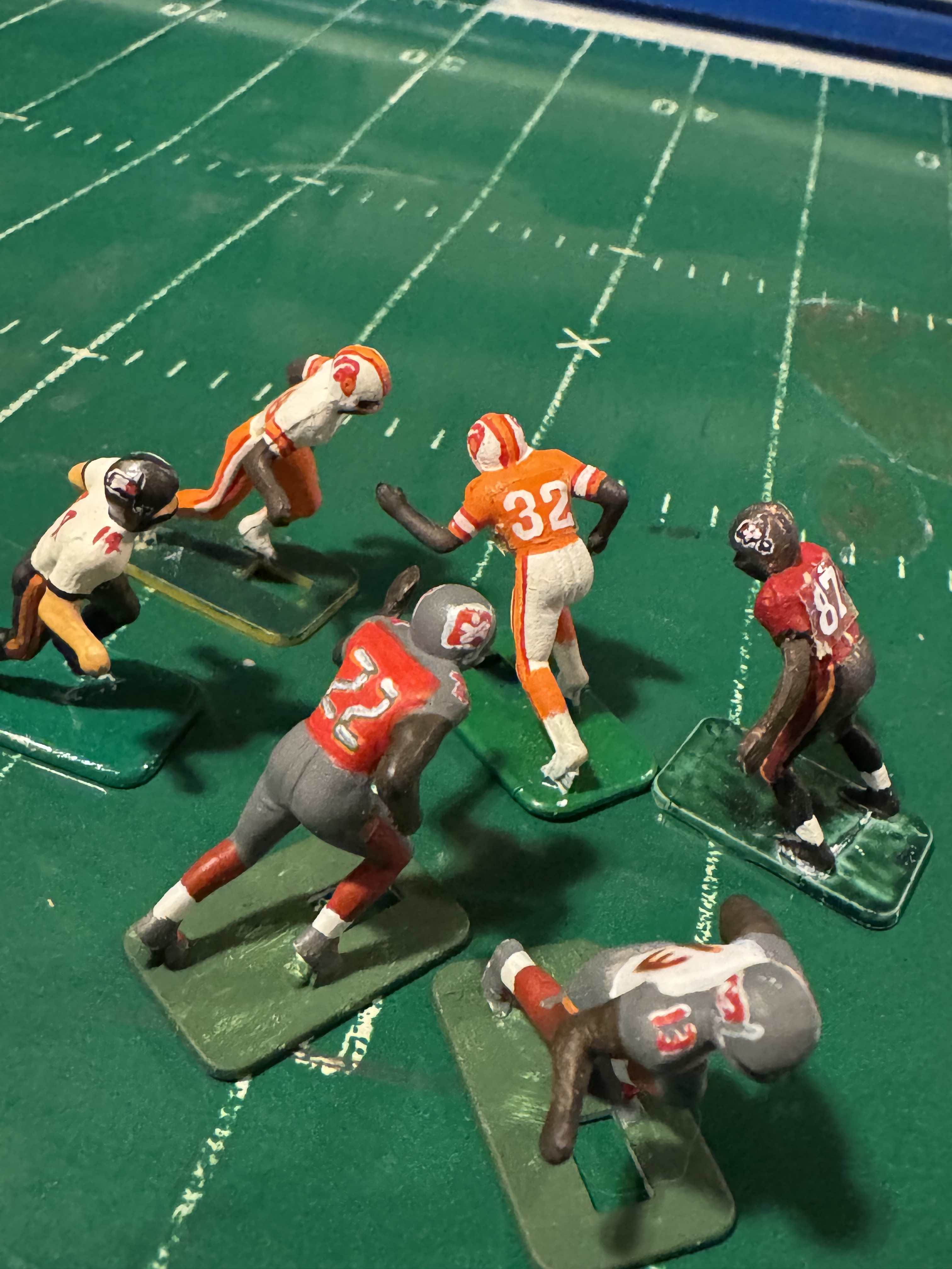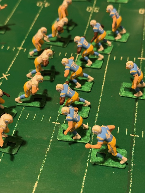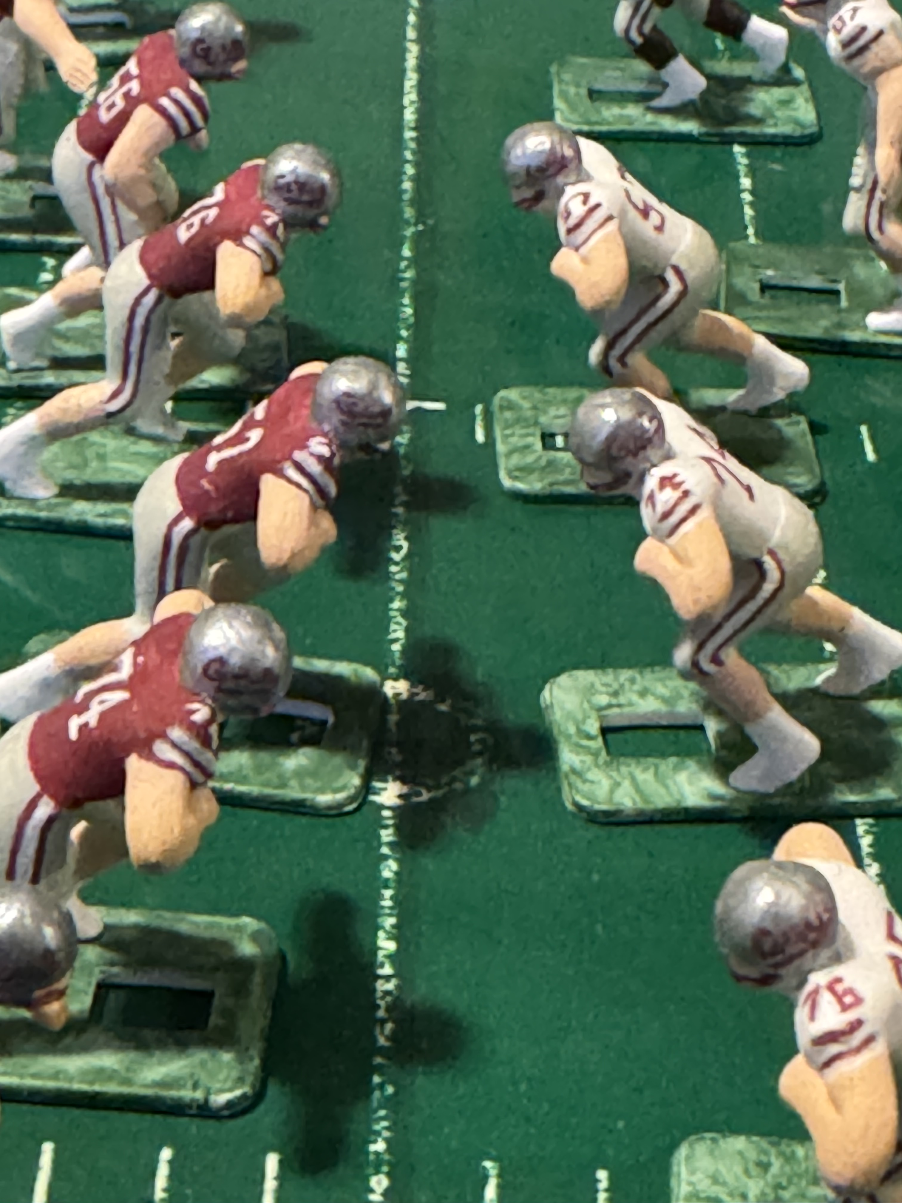 Well, it all started in 1977 as a 7-year-old when my uncle gave me a board with the Chicago Bears vs St Louis Cardinals. Then my dad painted the teams to be USC vs UCLA. I also got a Super Bowl board with the Steelers and Cowboys, and I have been hooked ever since. Then I started getting the division sets in the box. Didn’t like how the teams looked from China, so I started painting the players myself. Then I would get plan white players (teams) to paint other teams and uniforms. Once I had every NFL team I started painting a bunch of college teams. I have moved a lot in my life, and they always made the move with me. It has expanded rather than down in size throughout the years. I don’t play anymore but I still paint teams. I do it as a history of football uniforms within my collection. Still painting and adding to the collection.