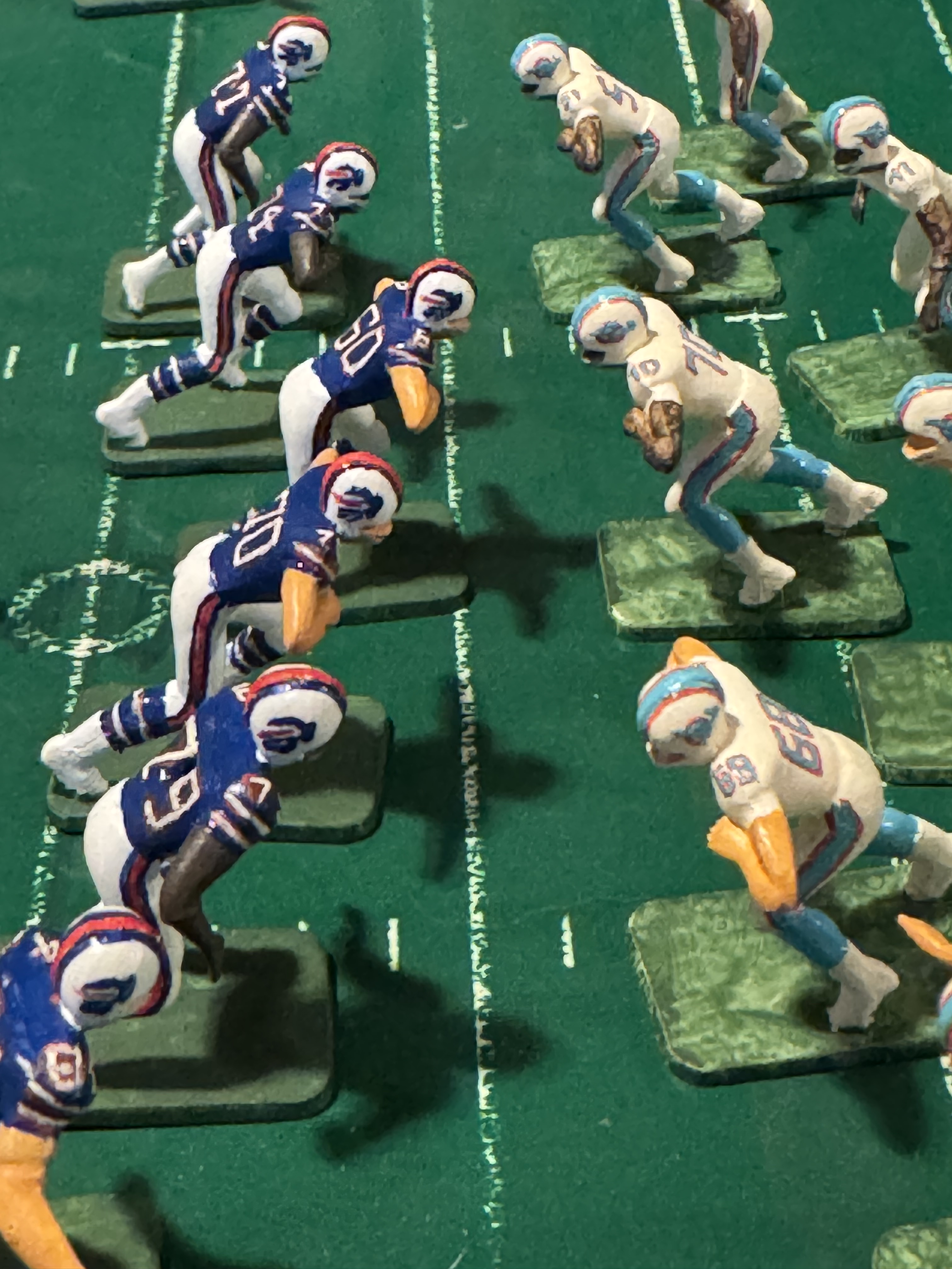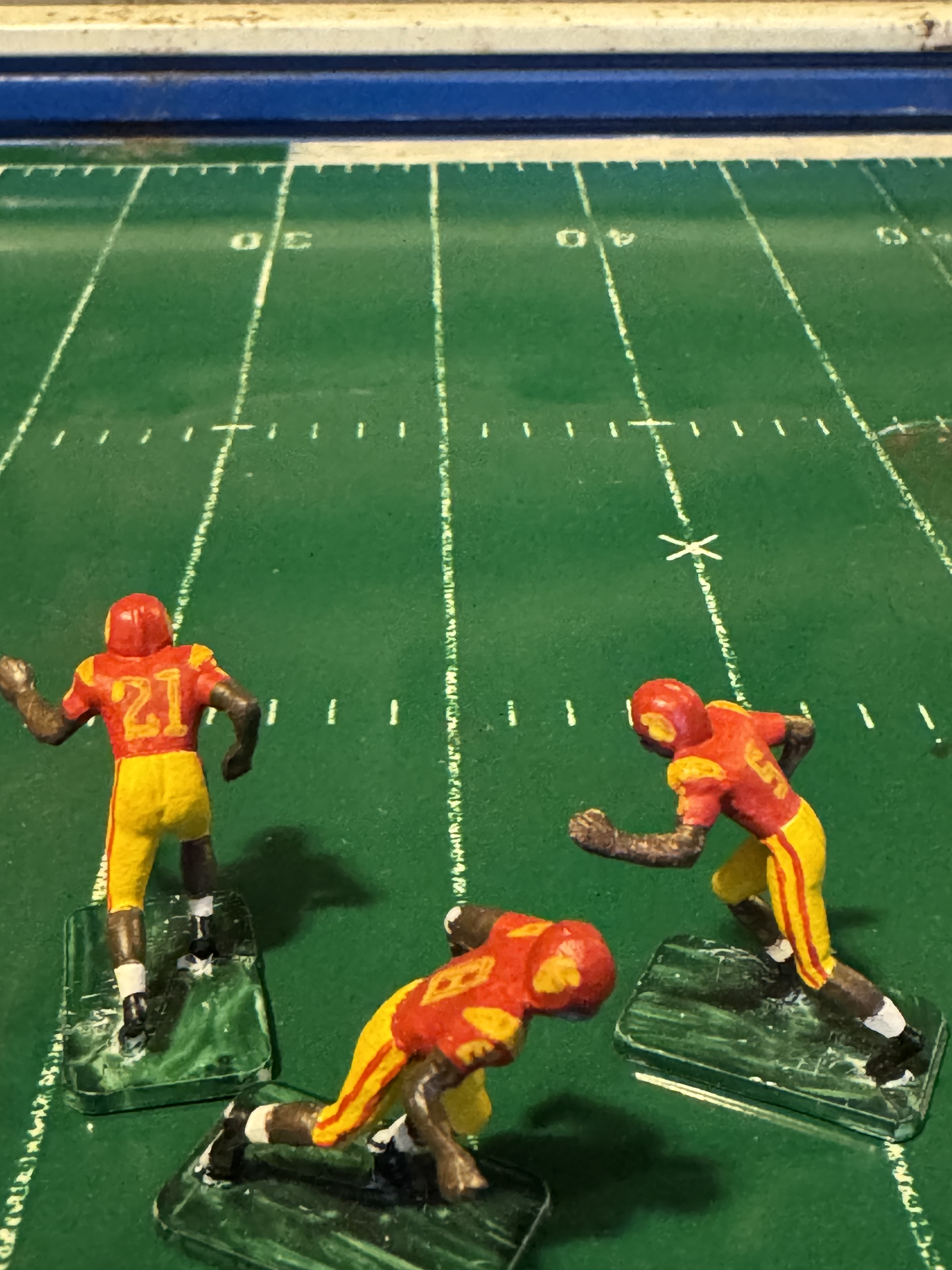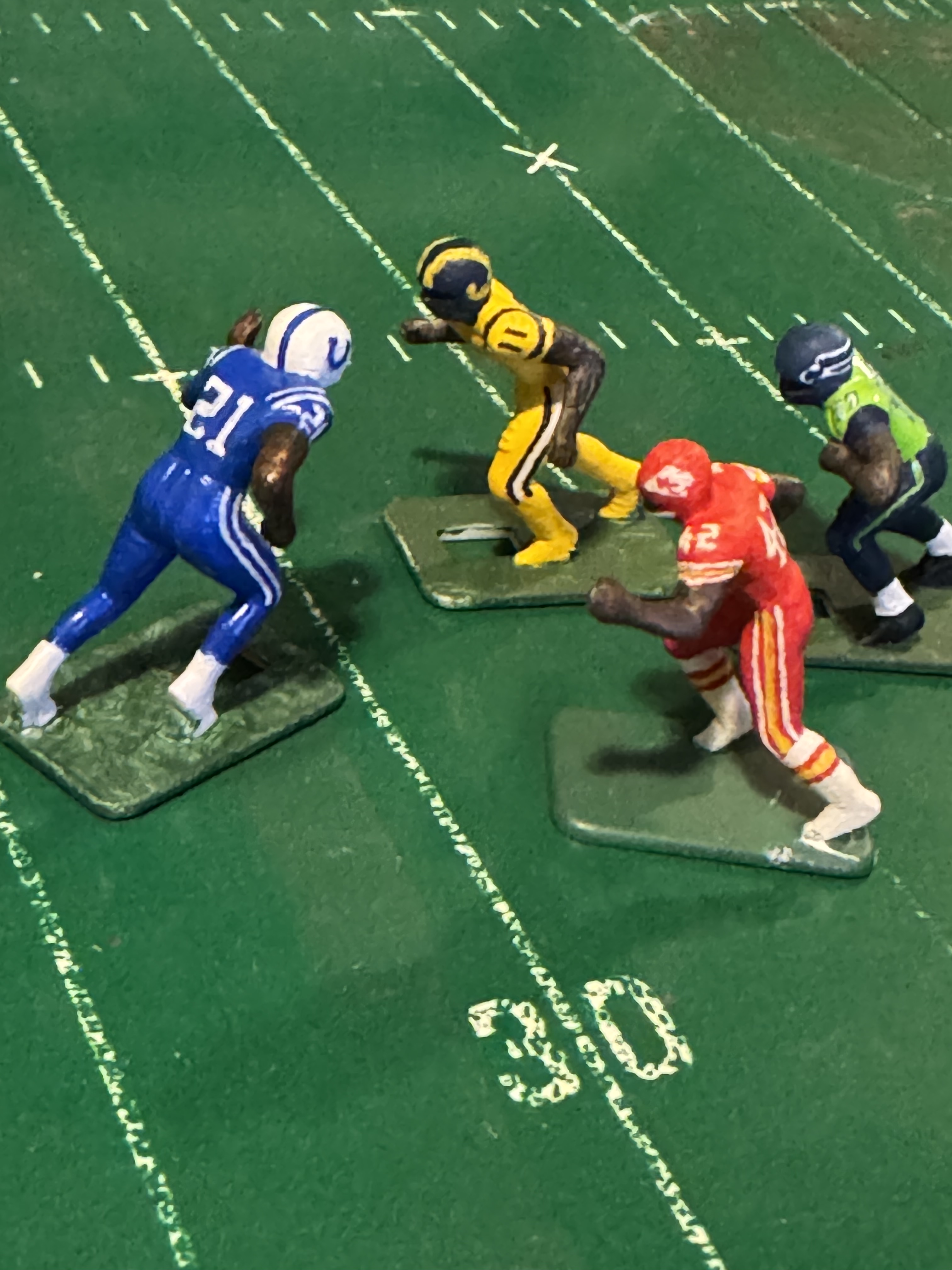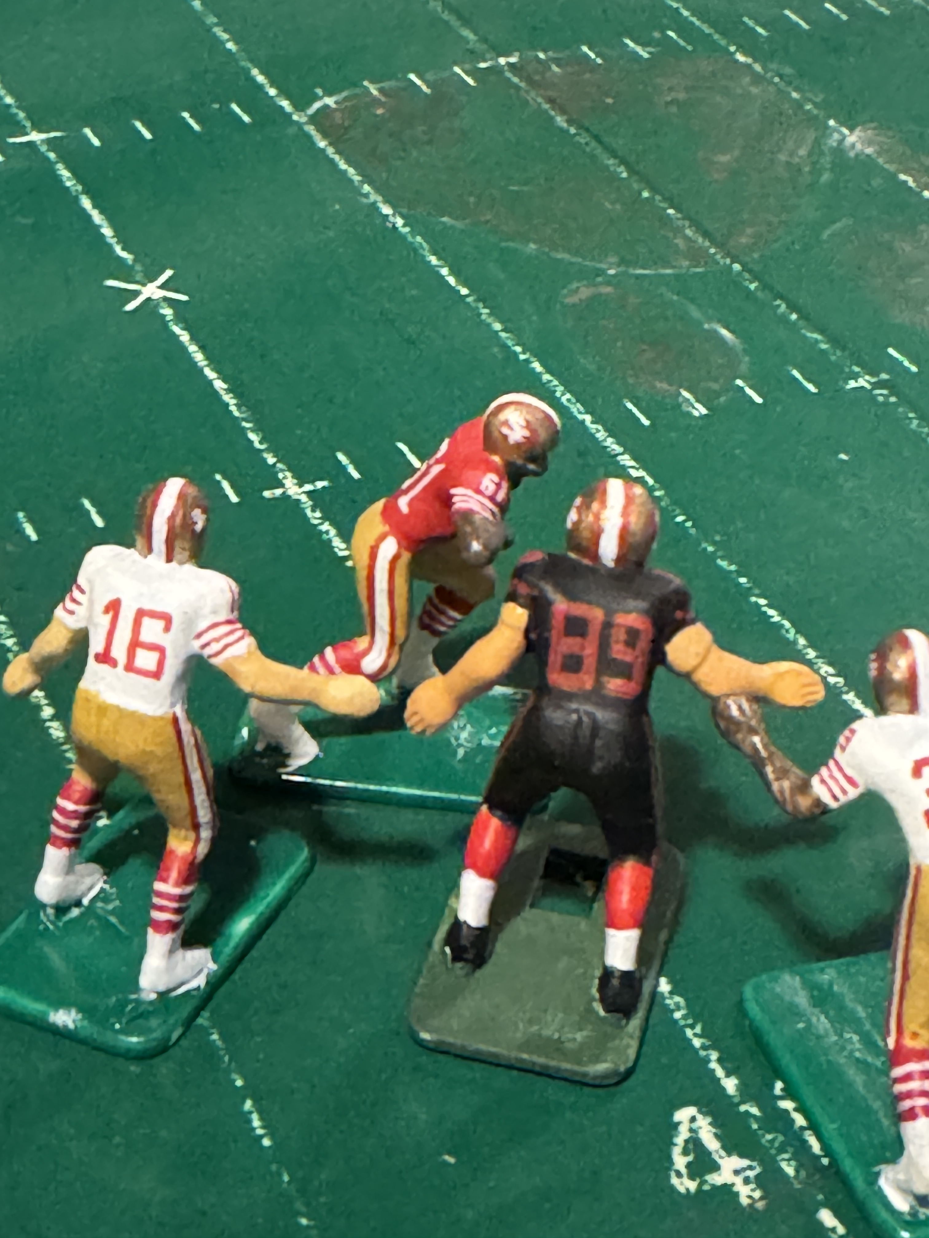 Well, it all started in 1977 as a 7-year-old when my uncle gave me a board with the Chicago Bears vs St Louis Cardinals. Then my dad painted the teams to be USC vs UCLA. I also got a Super Bowl board with the Steelers and Cowboys, and I have been hooked ever since. Then I started getting the division sets in the box. Didn’t like how the teams looked from China, so I started painting the players myself. Then I would get plan white players (teams) to paint other teams and uniforms. Once I had every NFL team I started painting a bunch of college teams. I have moved a lot in my life, and they always made the move with me. It has expanded rather than down in size throughout the years. I don’t play anymore but I still paint teams. I do it as a history of football uniforms within my collection. Still painting and adding to the collection.