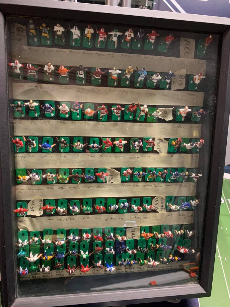 “This is my most prized possession in my football room! My son Kyle made this for me when he was a young boy. Kyle painted a figure of each college team and gave this to me as a gift a long time ago. Now he’s a grown man – 27 years old. I’m proud of the man you have become, and I love you very much. Happy birthday Kyle!”