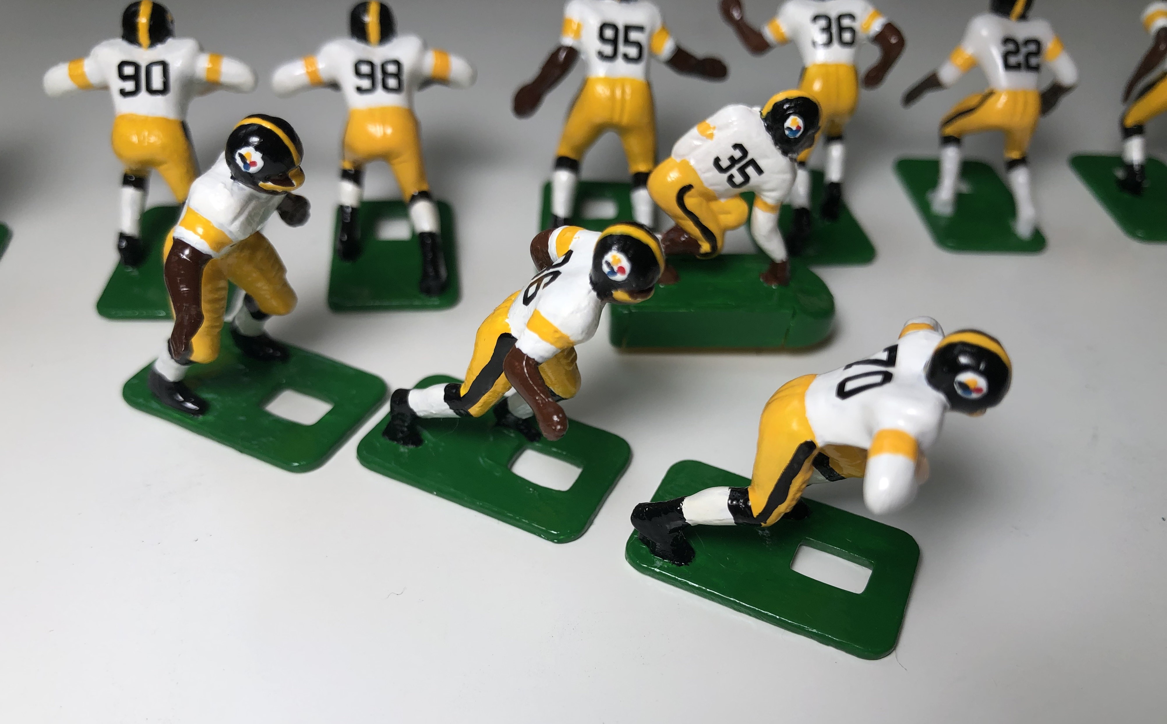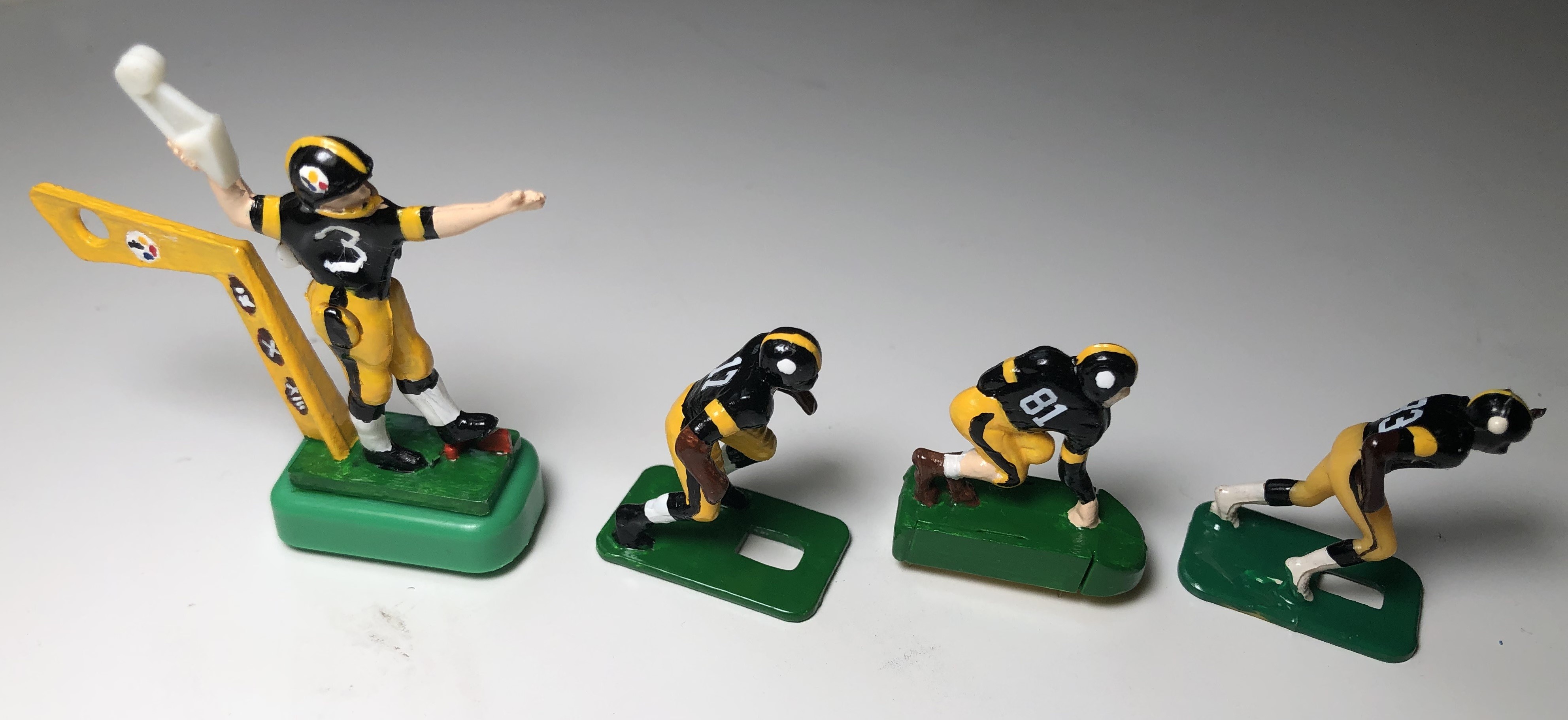 “Mike Maxwell is a biologist, artist, and Steelers fan in San Diego. His approach emulates the style of vintage Tudor figures — glossy enamel on raw plastic. He enjoys the challenge of painting helmet logos but prefers decals for jersey numbers.”