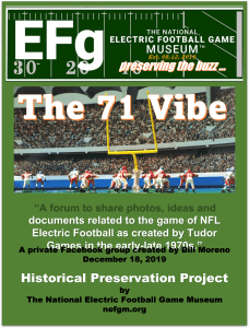“The 71 Vibe” is electric football gamer and hobbyist, Bill Moreno’s Facebook group page “created … as a forum to share photos, ideas and documents related to the game of NFL Electric Football as created by Tudor Games in the early-late 1970s. It is a private group, so only members can see who’s in the group and what they post. As of this writing (8/26/2021) there are 324 members.