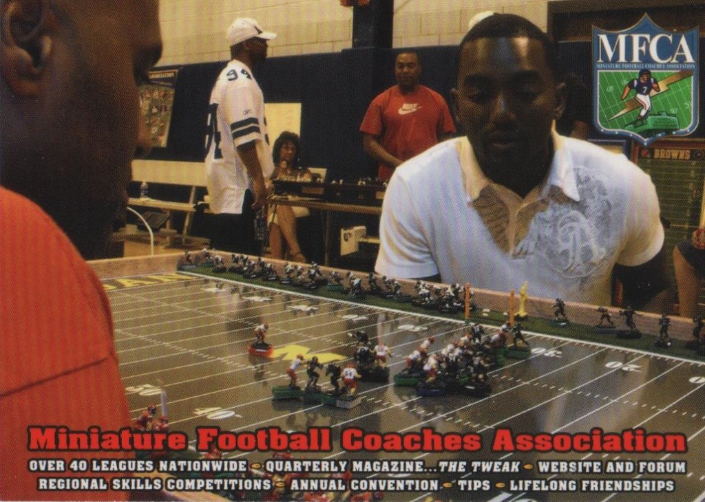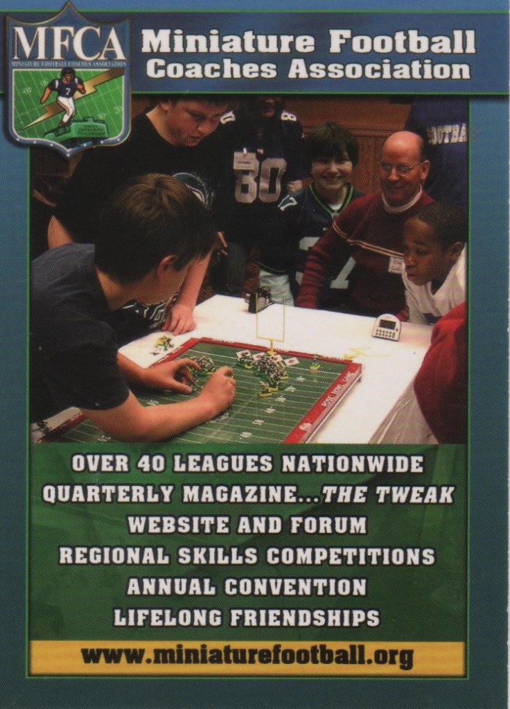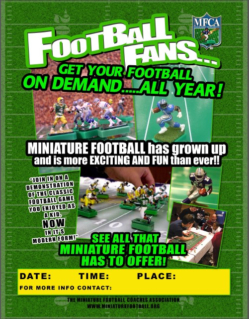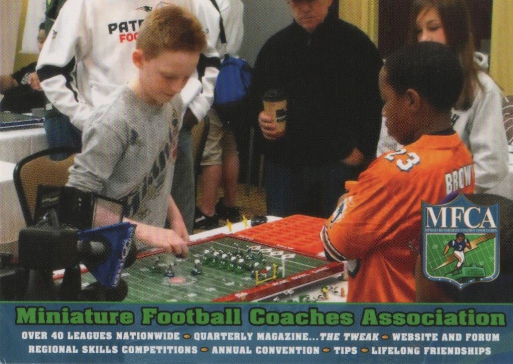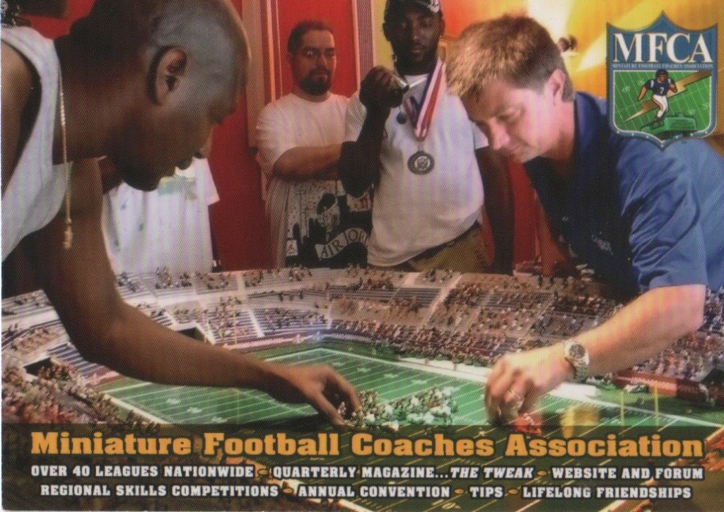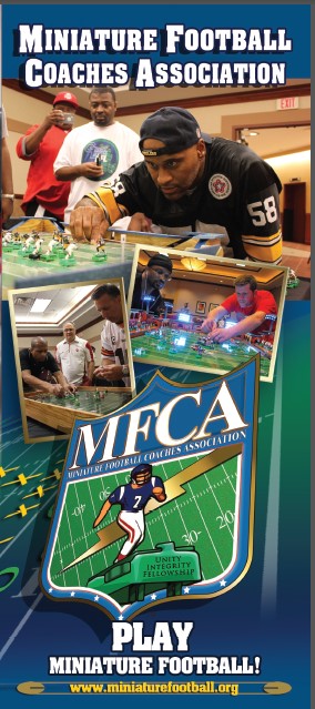 The Miniature Football Coaches Association (MFCA) is a group of electric football coaches, hobbyists and enthusiasts with over 2300 Facebook followers world wide. It was founded in 2007 with the following mission statement: “Unifying the miniature football hobbyist by promoting miniature football, educating the public and providing a unified association which recognizes and supports the diverse coaches and leagues.” Originally, the MFCA was organized as a 501(c)(7) non profit organization. It was governed by by-laws and a board of directors and required a paid membership fee to be an “official” member of the organization.