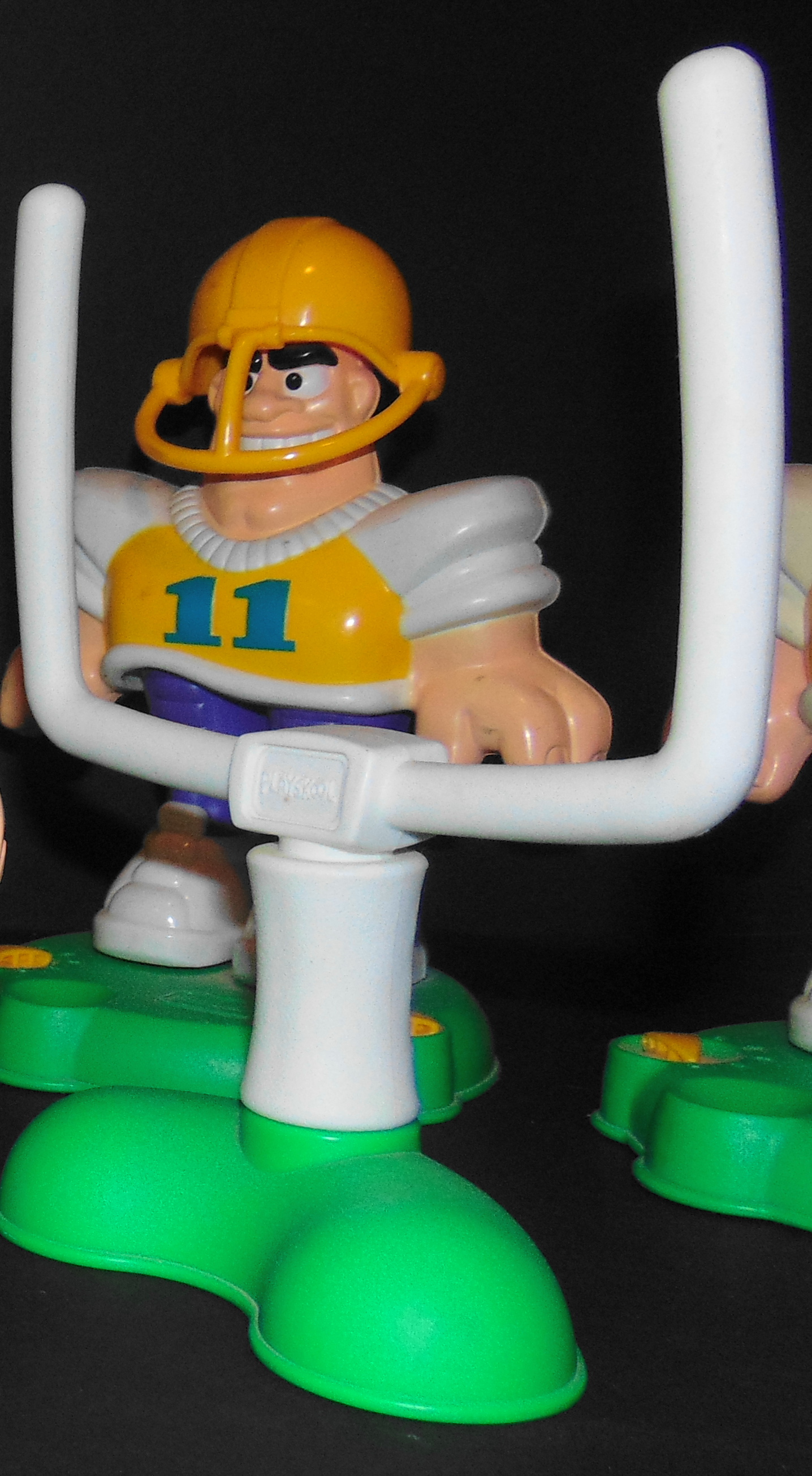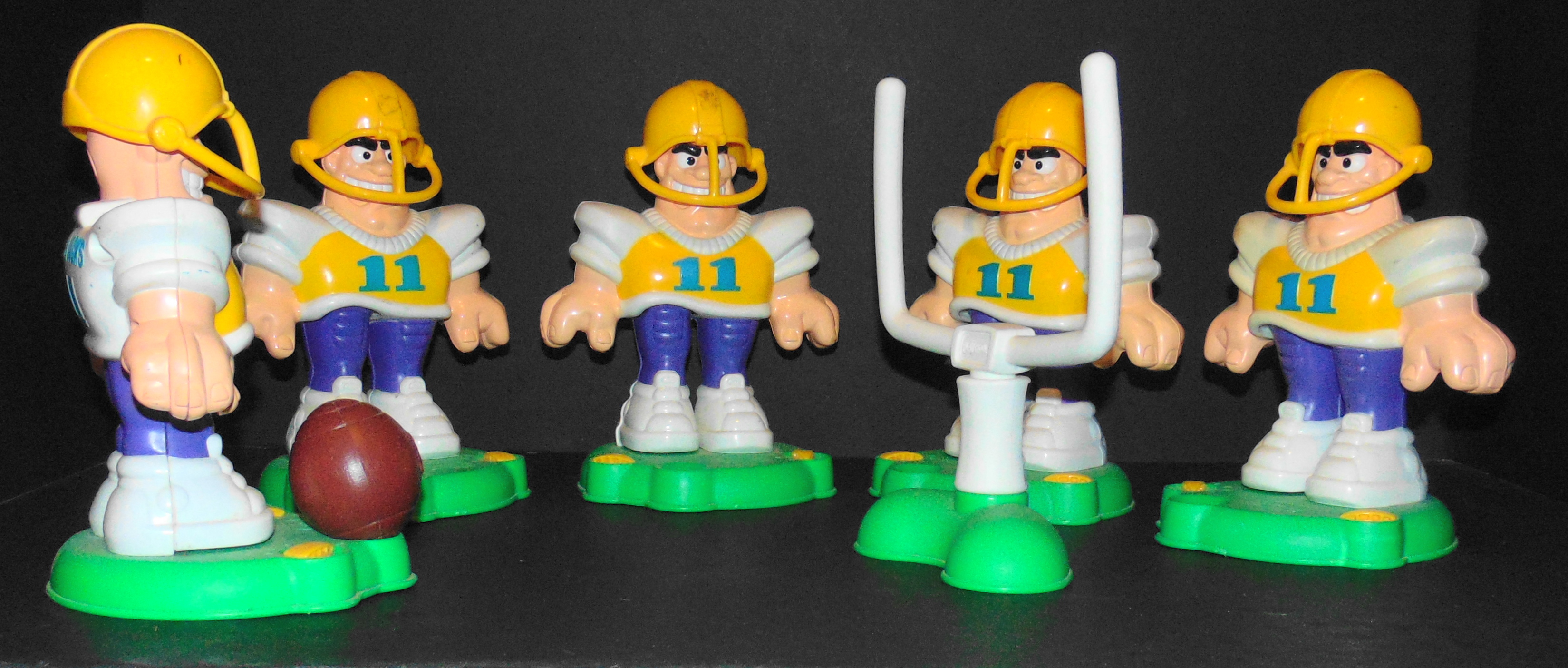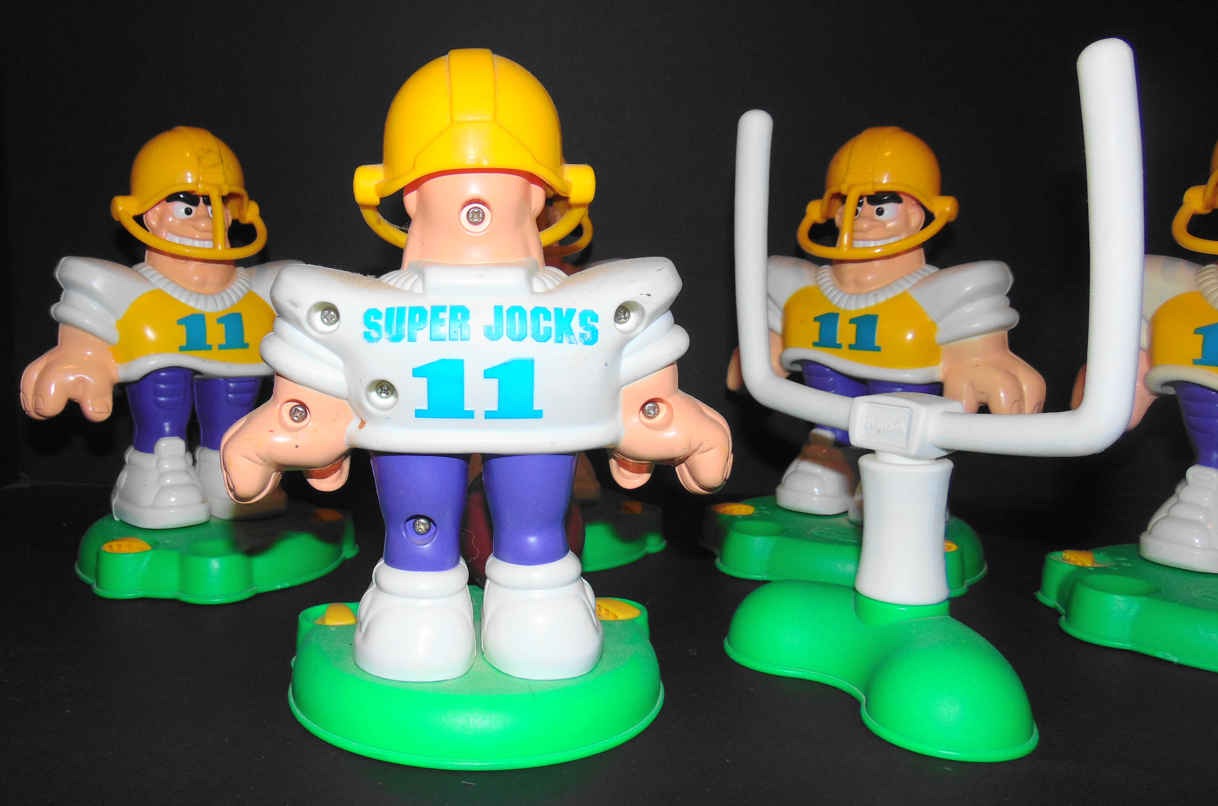 Enjoy real “Football Action” Field Goal Kicking game. 1996 Hasbro. The set includes 5 “Super Jock” action figure kickers, 1 football, and 1 Goal Posts. Figures are approximately 8″ tall.