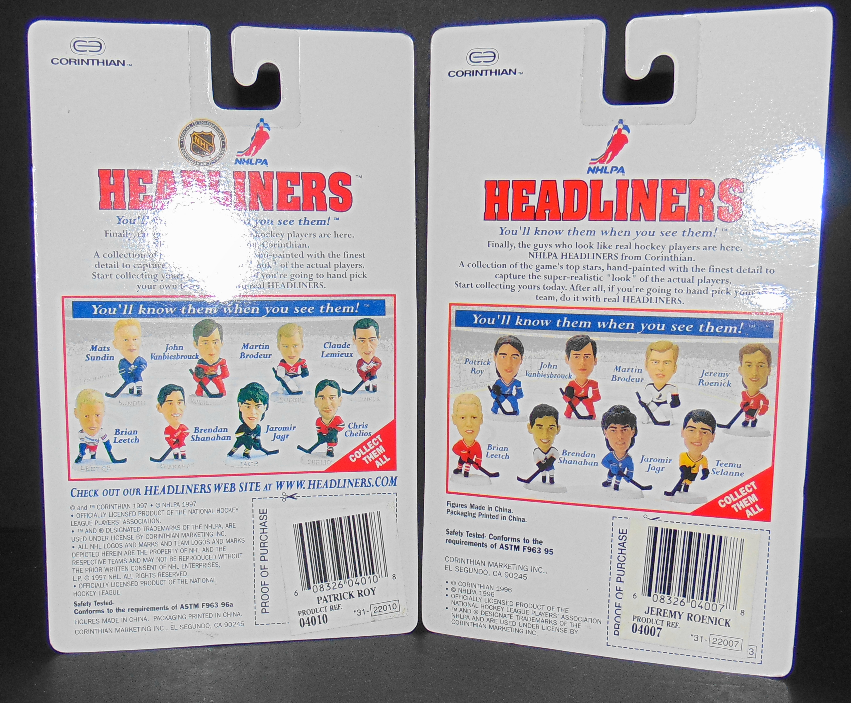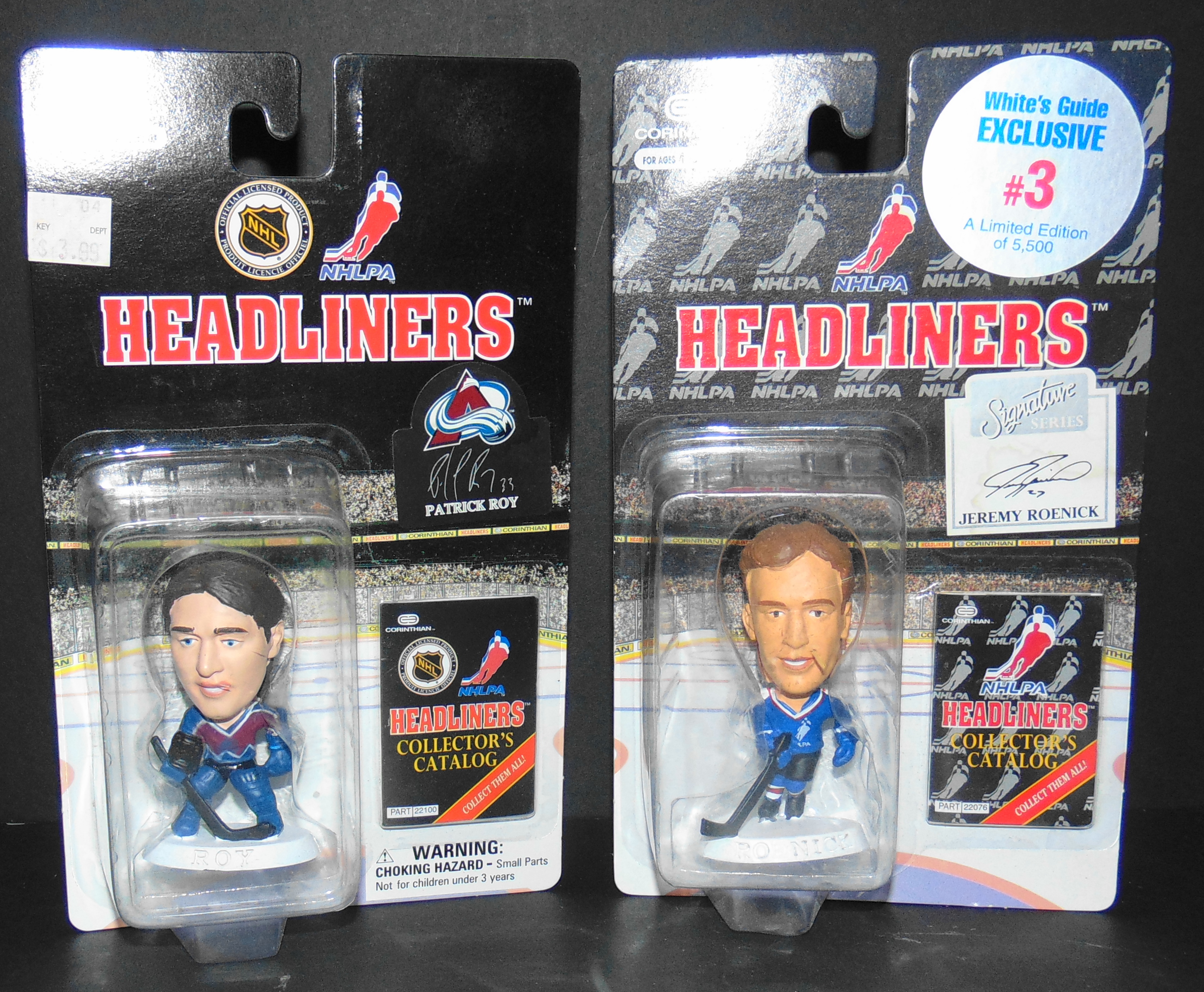 Set of 2 National Hockey Leage Players Association 3″ Hockey Player Figures. 1997 #04010 Colorado Avalanche Patrick Roy and 1996 #04007 Signature Series Jeremy Roenick “White’s Guide Exclusive #3” of 5500 Limited Edition. Sold as the 2 Player Set Only. Corithian Marketing, INC, MADE IN CHINA