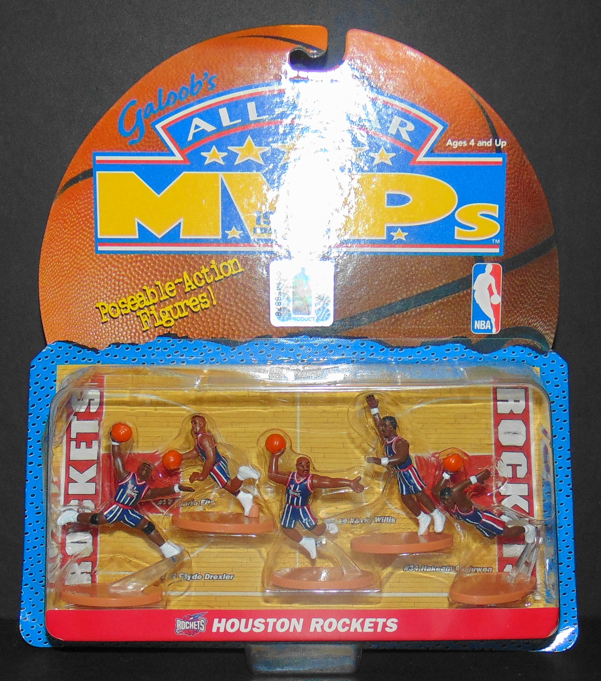 Poseable Action Figures of your favorite NBA team players. Rockets include #34 Hakeem Olajuwan C * #23 Clyde Drexler G * #34 Charles Barkley F * #37 MarloOlie F/G * # 42 Kevin Willis F Galoob Toys, Inc. MADE IN CHINA Only 1 set Available.