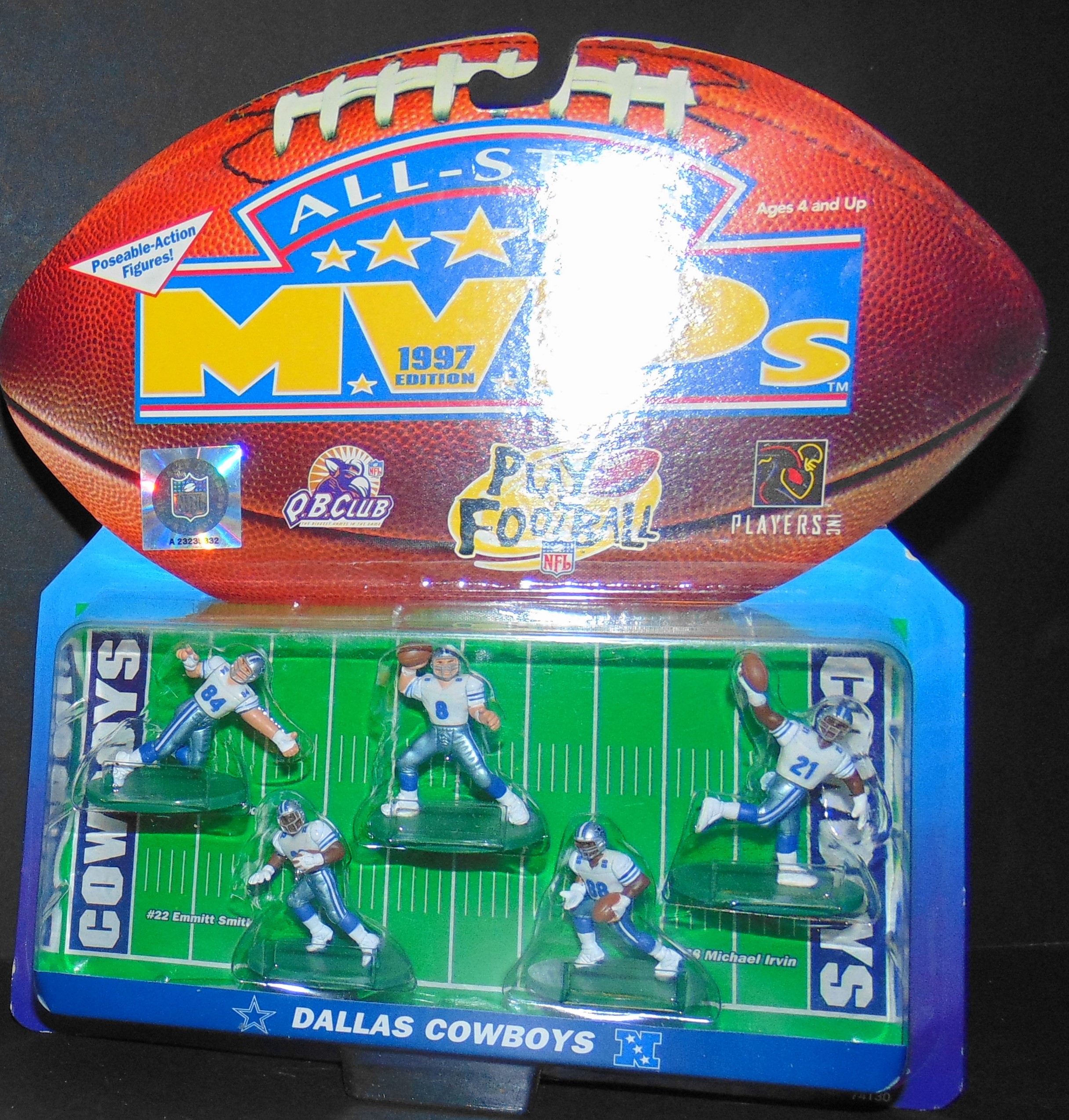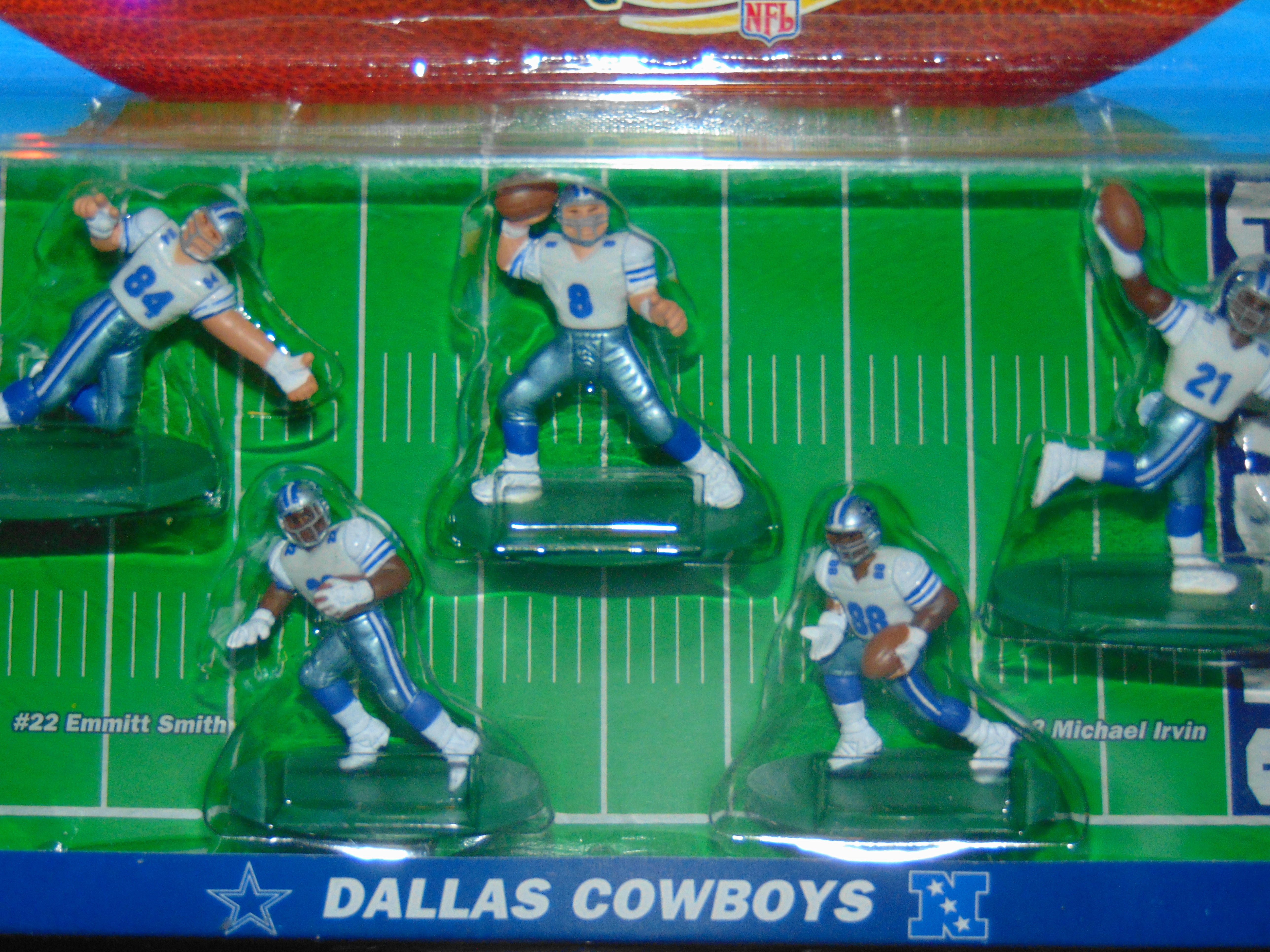 Poseable Action figures of your favorite NFL team players. Figures are approximately 2″ tall. Cowboys include #8 Troy Aikman QB * #22 Emmit Smith RB * #88 Michael Irvine WR * #21 Dieon Sanders CB/WR * #84 Jay Novacek TE. Galoob Toys, Inc. MADE IN CHINA Only 2 sets Available.
