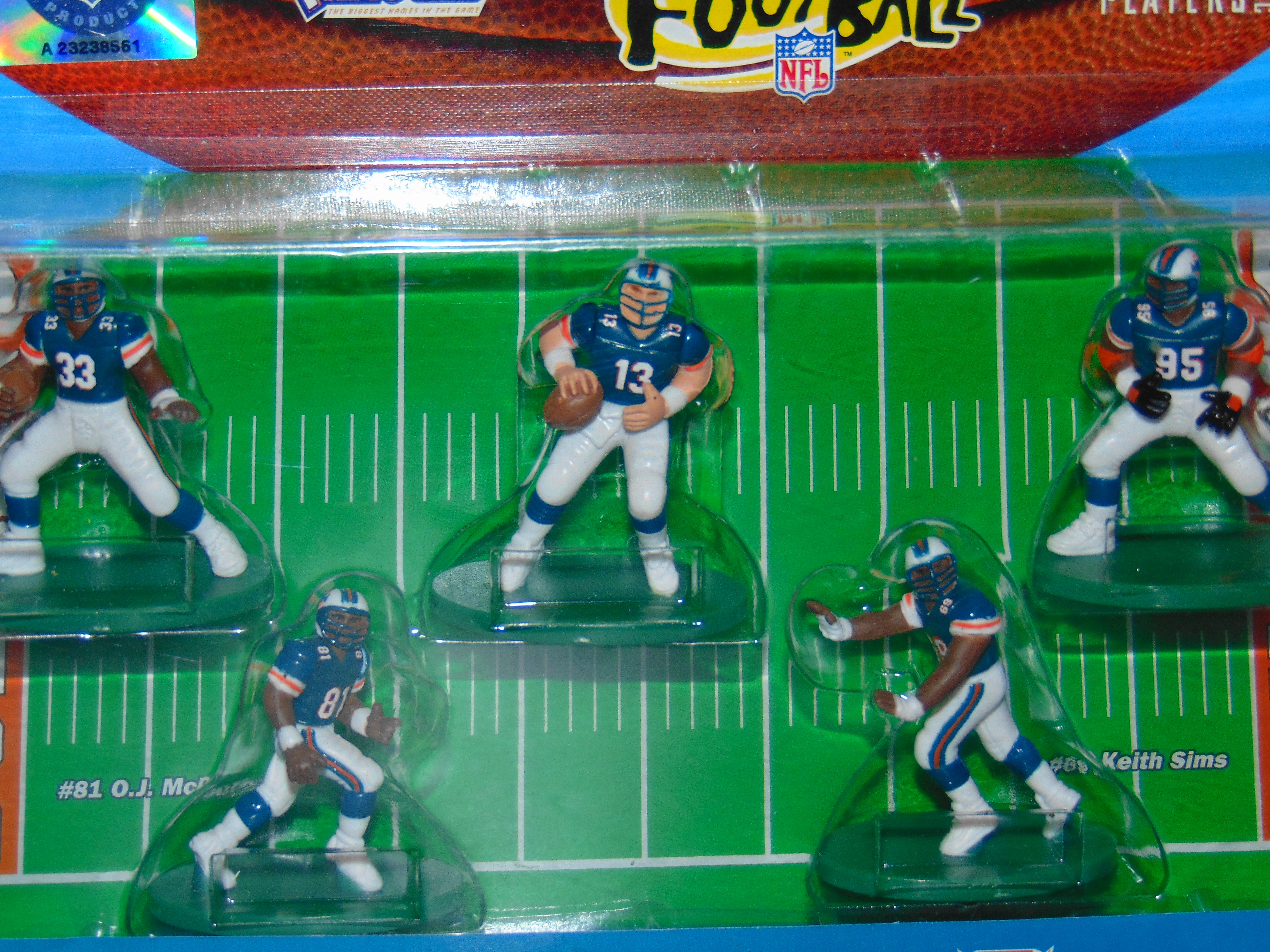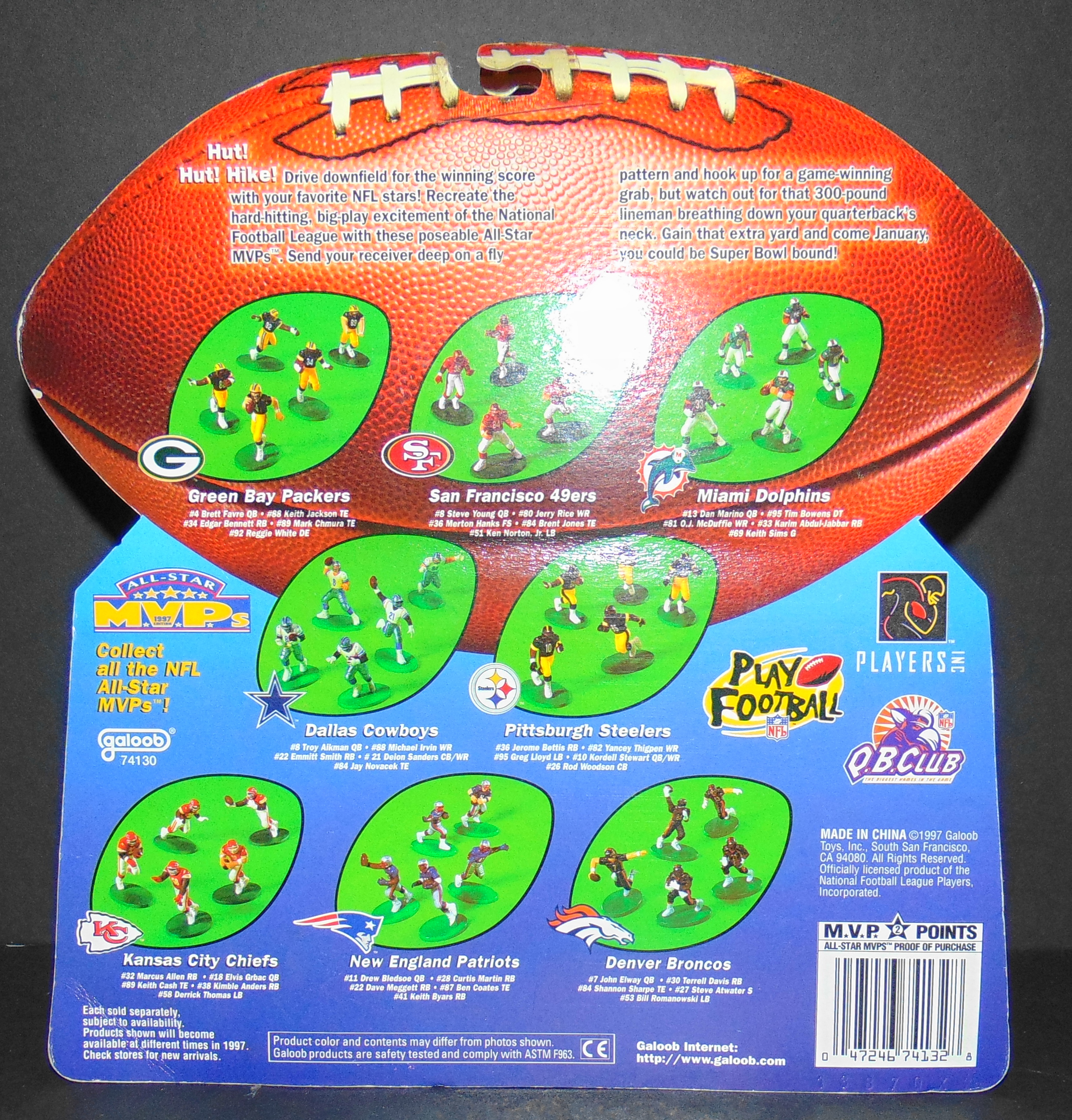 Poseable Action figures of your favorite NFL team players. Figures are approximately 2″ tall. Dolphins include #13 Dan Marino QB * #95 Tim Bowens DT * #81 O.J. McDuffie WR * #33 Karim Abdul-Jabbar RB * #69 Keith Sims G. Galoob Toys, Inc. MADE IN CHINA Only 1 set Available.