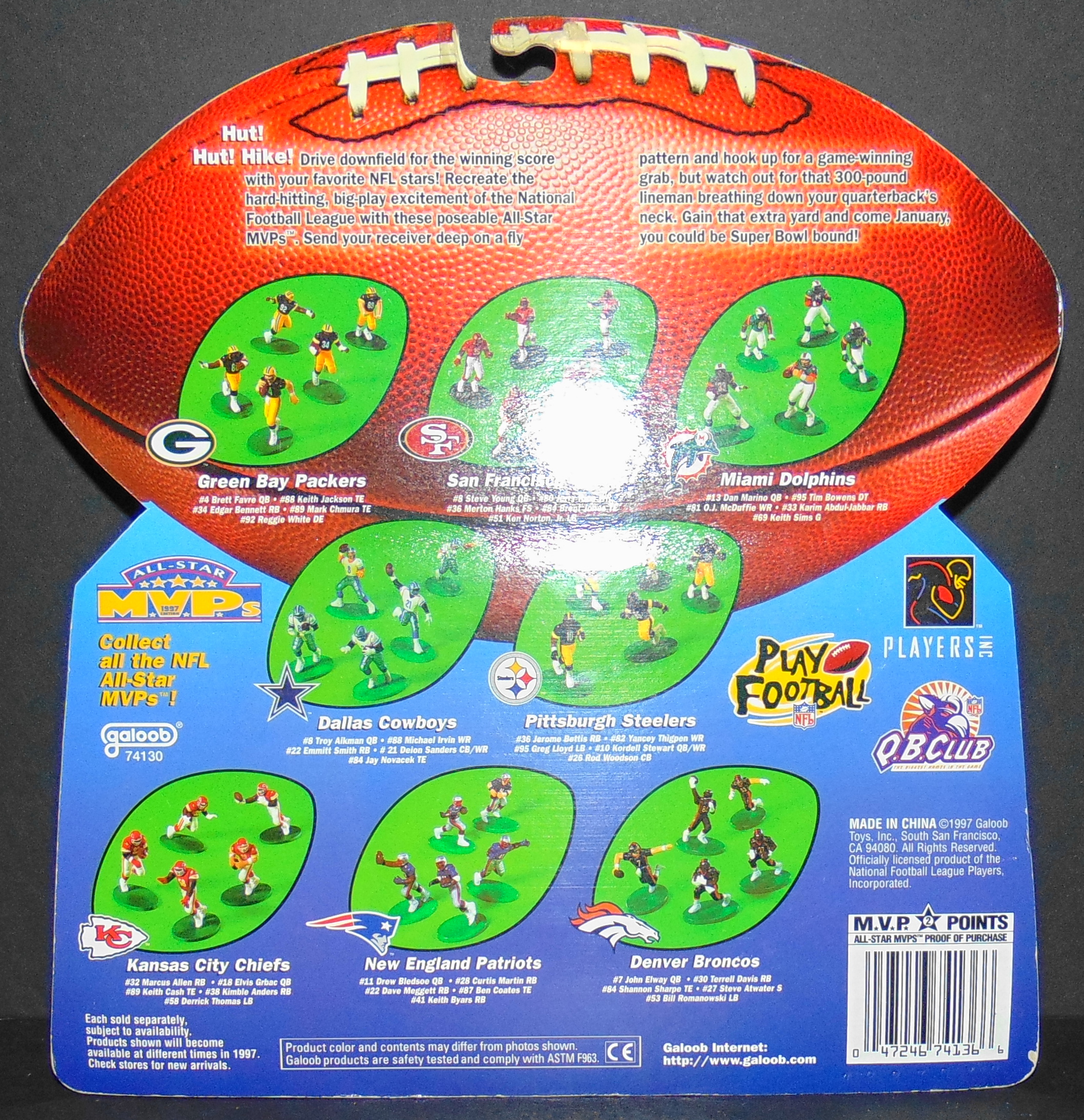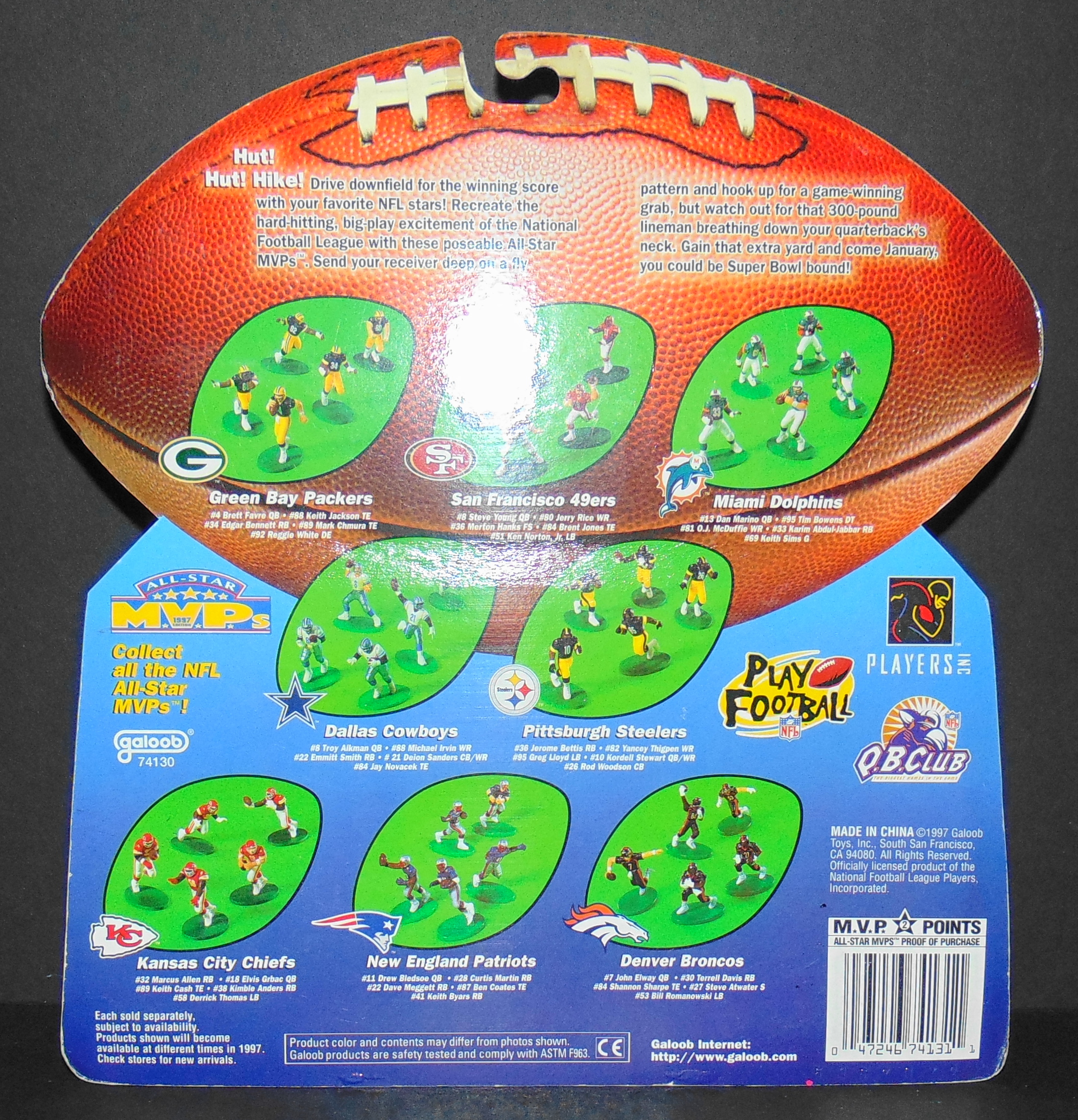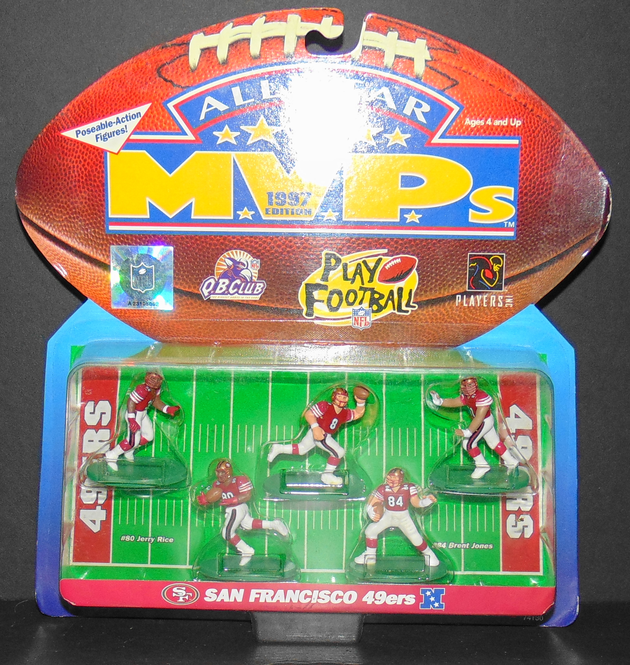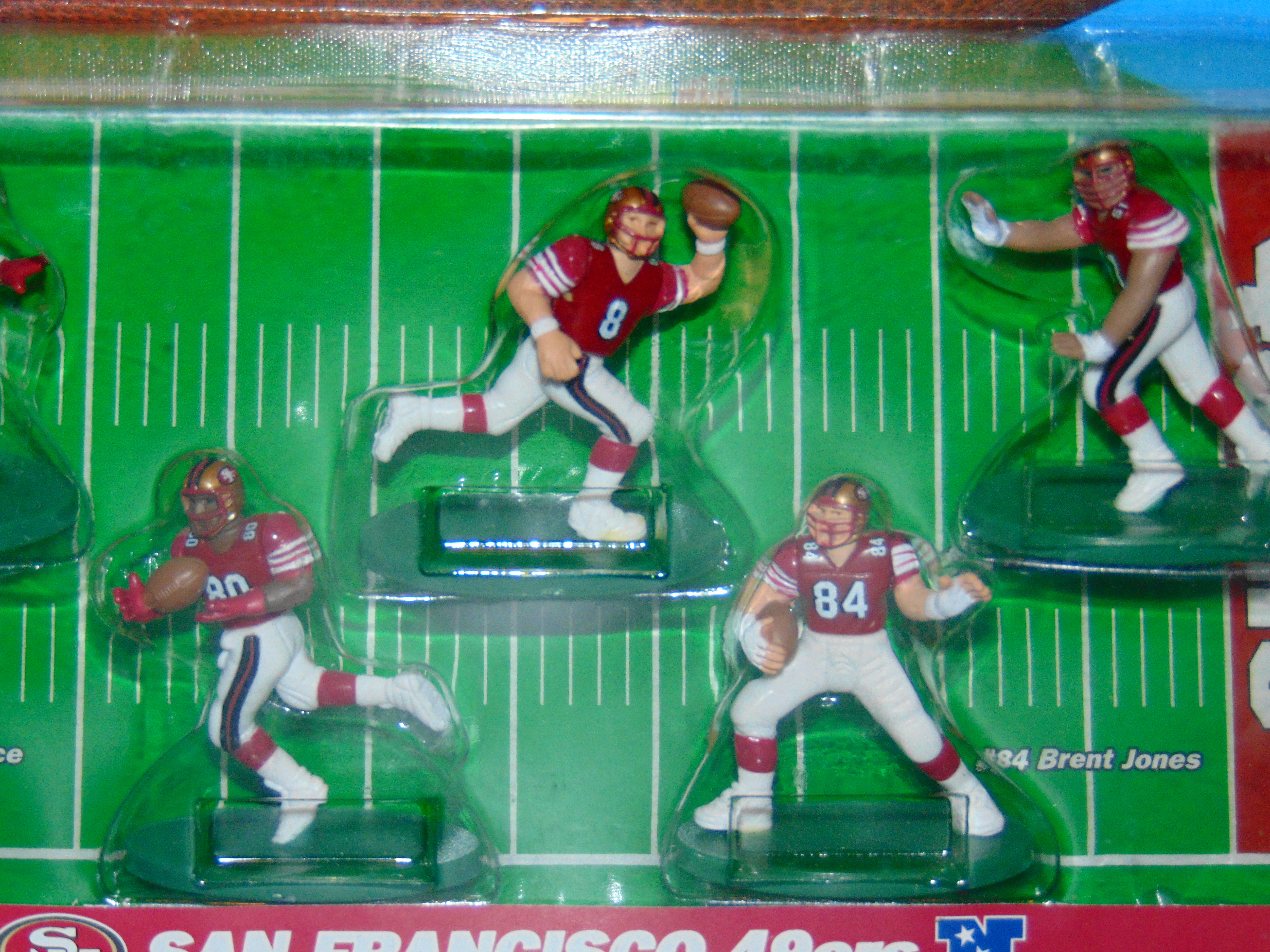 Poseable Action figures of your favorite NFL team players. Figures are approximately 2″ tall. 49ers include #8 Steve Young QB * #80 Jerry Rice WR * #36 Marlon Hanks FS * #84 Brent Jones TE * #51 Ken Norton, Jr. Galoob Toys, Inc. MADE IN CHINA Only 3 sets Available.