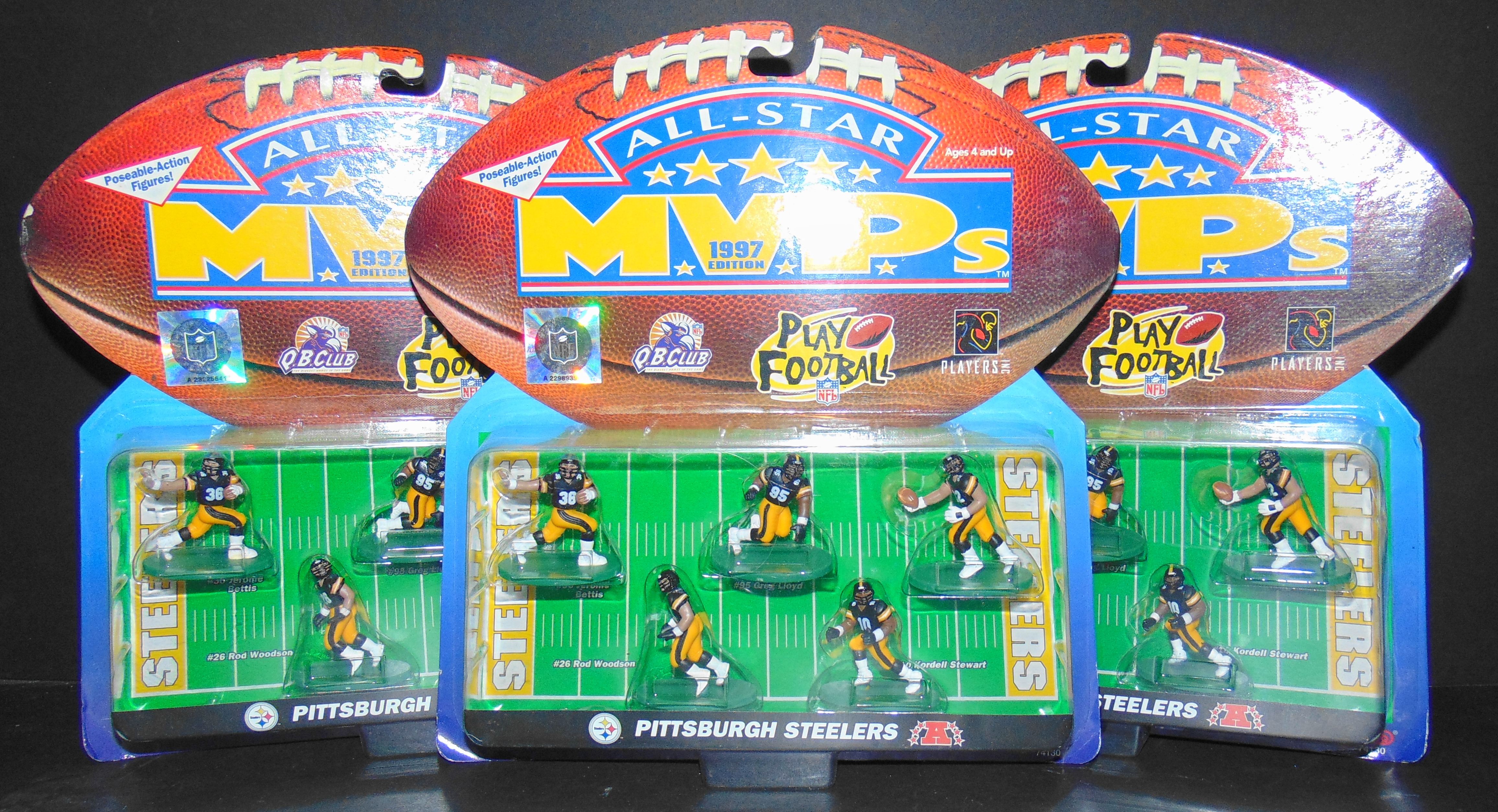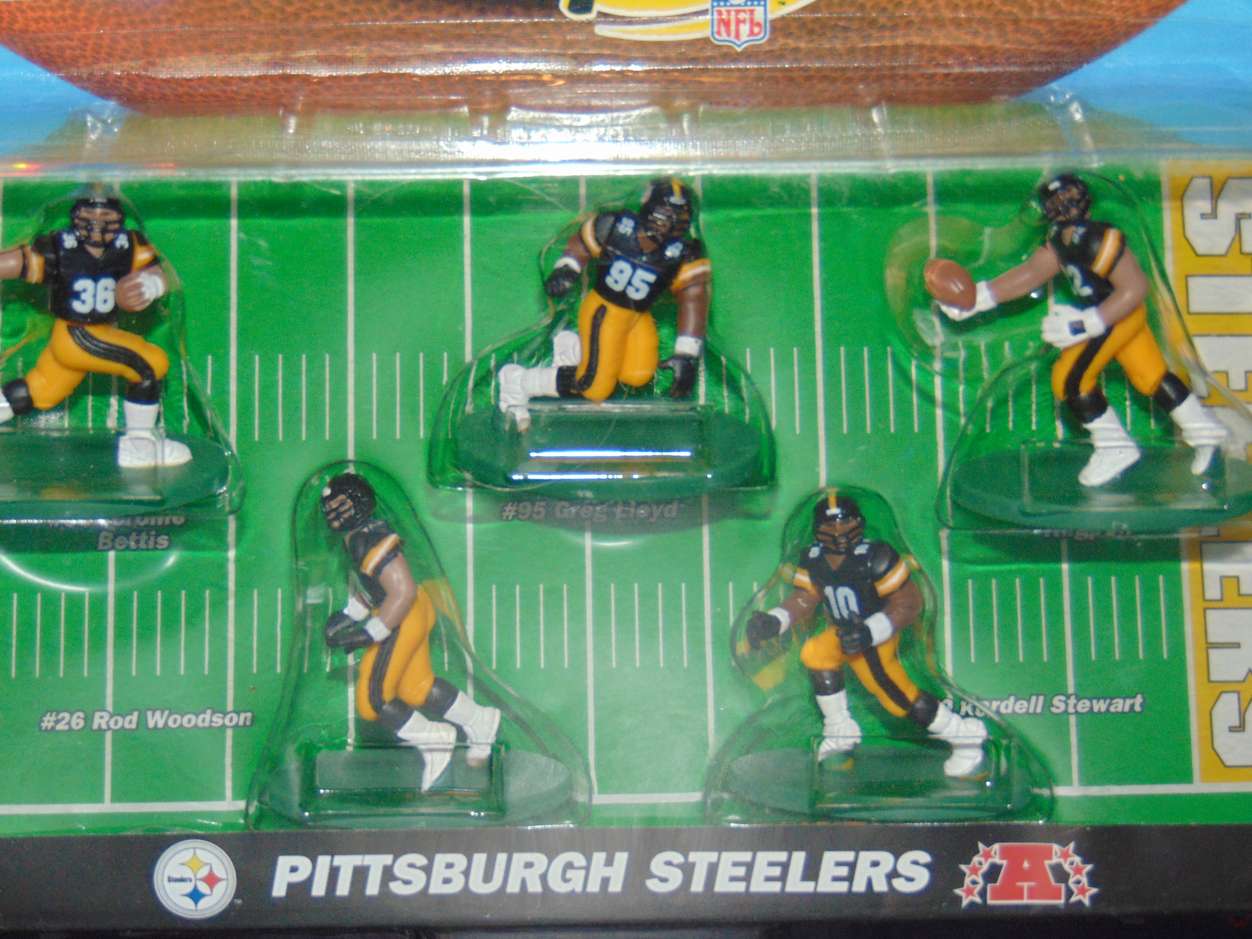 Poseable Action figures of your favorite NFL team players. Figures are approximately 2″ tall. Steelers include #36 Jerome Bettis RB * #82 Yancy Thigpen WR * #95 Greg Lloyd LB * #10 Kordell Stewart QB * #26 Rod Woodsen Galoob Toys, Inc. MADE IN CHINA Only 3 sets Available.