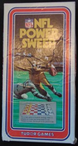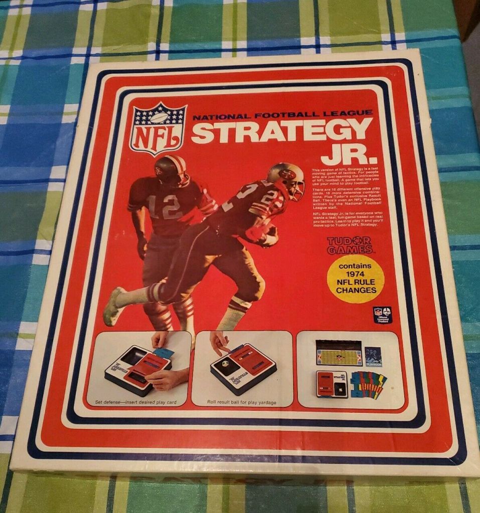 This game was made in 1972. It consists of a game board with result bowl, defensive strategy compartment, scoreboard with timer wheel, playing field, result ball and defense pegs (this game is missing the defense pegs). There are 10 offensive play cards, and a game plan play book. This game is basically just a simpler version of the above NFL Strategy game. In fact in 1974, Tudor produced a game called NFL Strategy, Jr. which is this game updated and renamed. (Photos from an ebay listing).