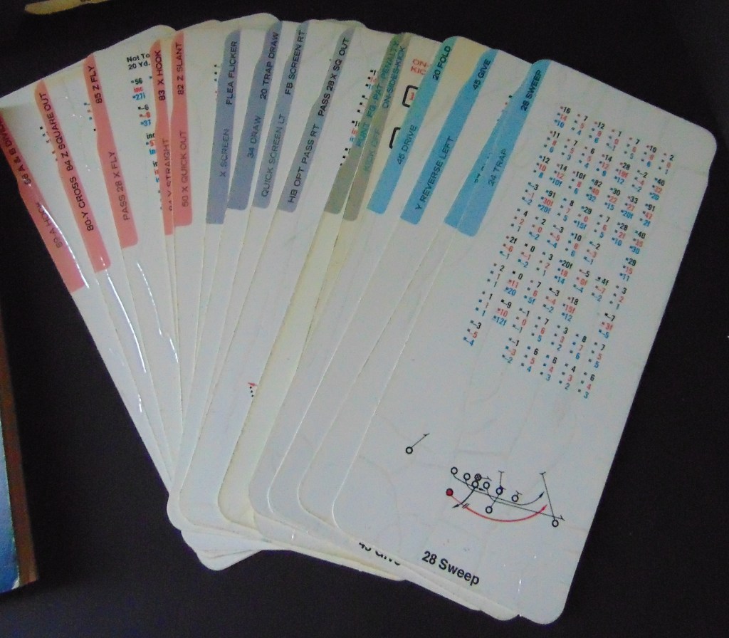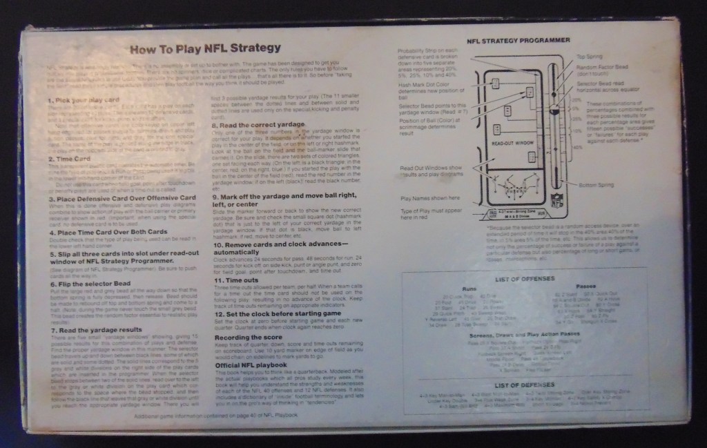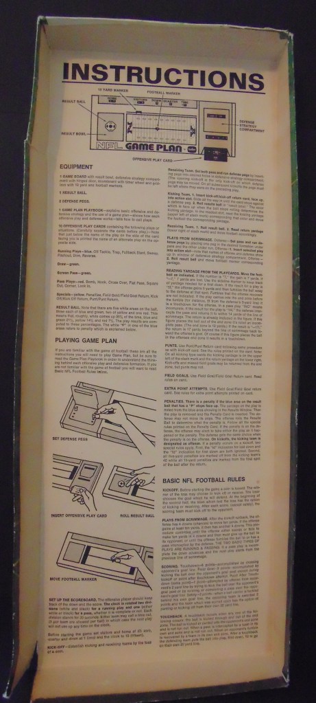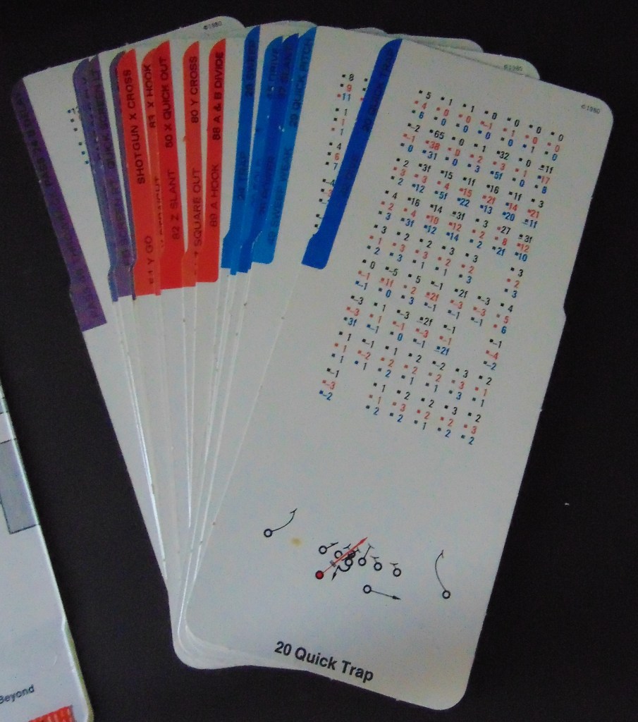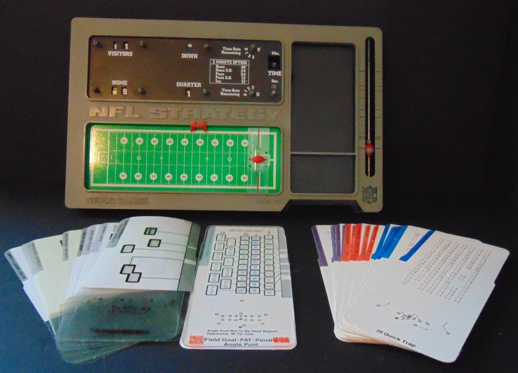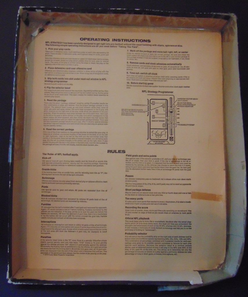 This game, made in 1970, was designed to “get right into pro football without the usual fumbling with charts, spinners or dice”. It consists of 17 offensive play cards, 12 defensive play cards and 2 special cards for kicks, punts and penalties, and a combination playing field, score board, timer and “NFL Strategy Programmer”. The play cards are color coded for various types of plays. Placing a defensive card over an offensive card shows various results. The cards are placed into the programmer and a “selector bead” flipped to produce a random result from the 15 possible results shown. By reading the yardage the offense advances the ball down the field until they score or are forced to give up possession to the opposing team.