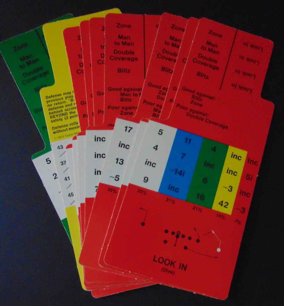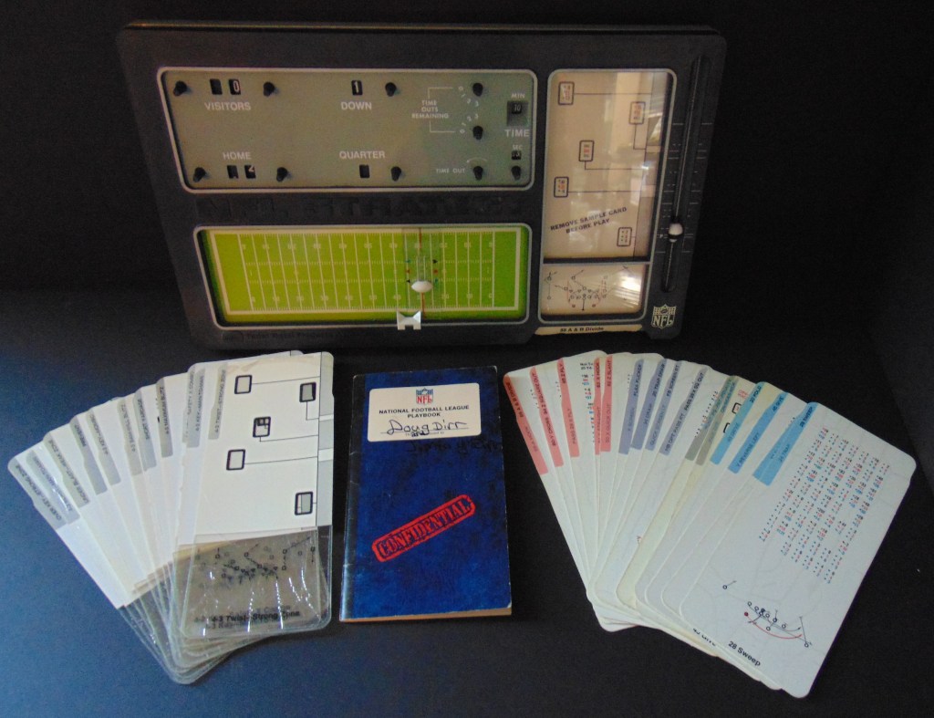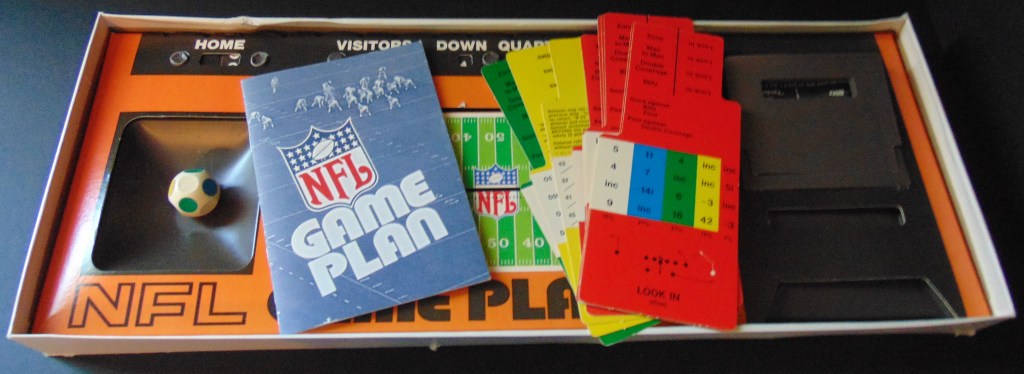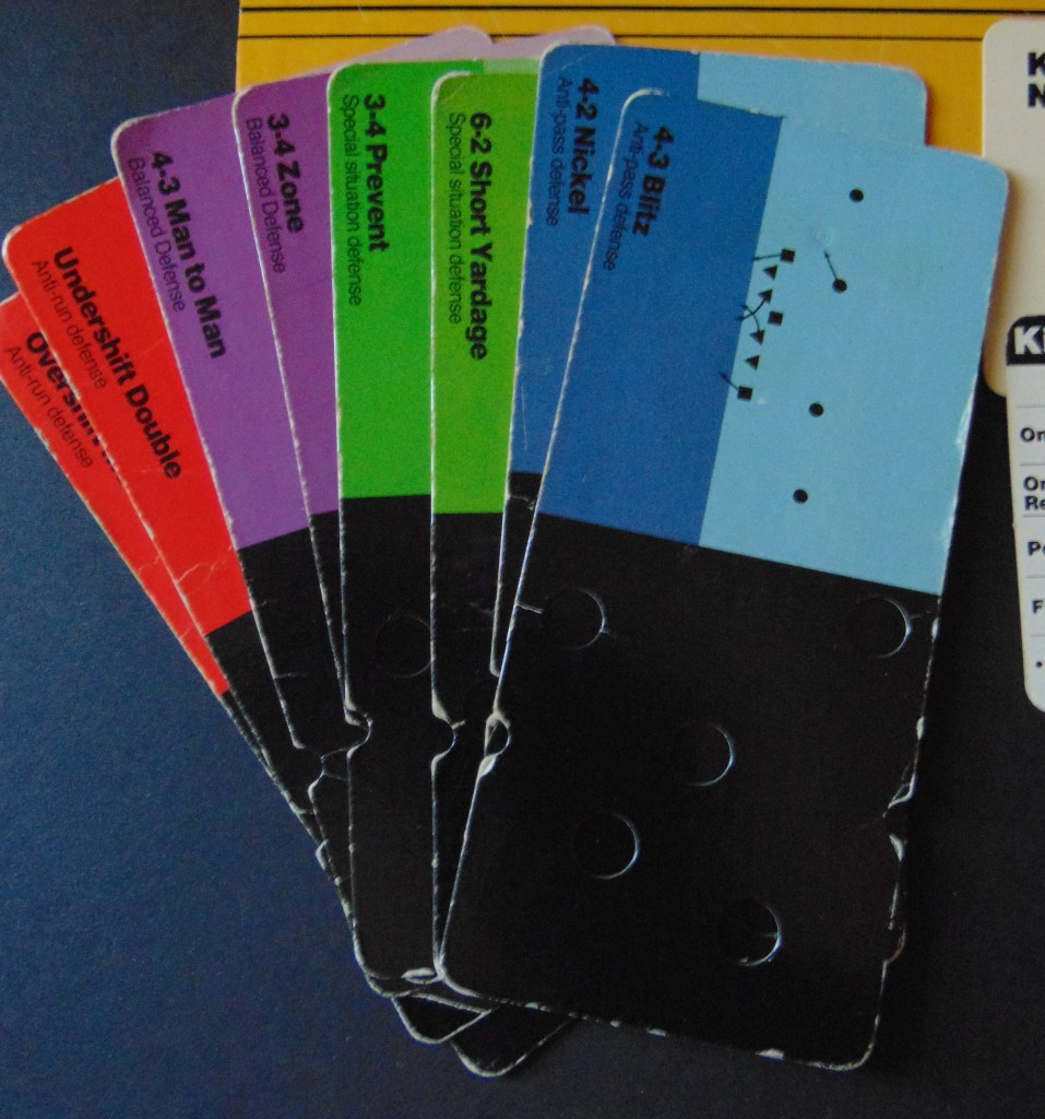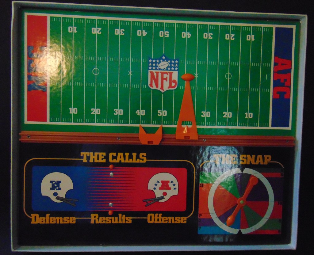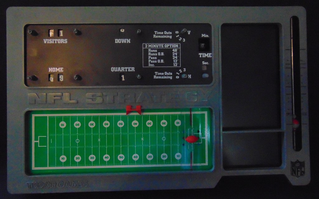 This game, made in 1970, was designed to “get right into pro football without the usual fumbling with charts, spinners or dice”. It consists of 17 offensive play cards, 12 defensive play cards and 2 special cards for kicks, punts and penalties, and a combination playing field, score board, timer and “NFL Strategy Programmer”. The play cards are color coded for various types of plays. Placing a defensive card over an offensive card shows various results. The cards are placed into the programmer and a “selector bead” flipped to produce a random result from the 15 possible results shown. By reading the yardage the offense advances the ball down the field until they score or are forced to give up possession to the opposing team.