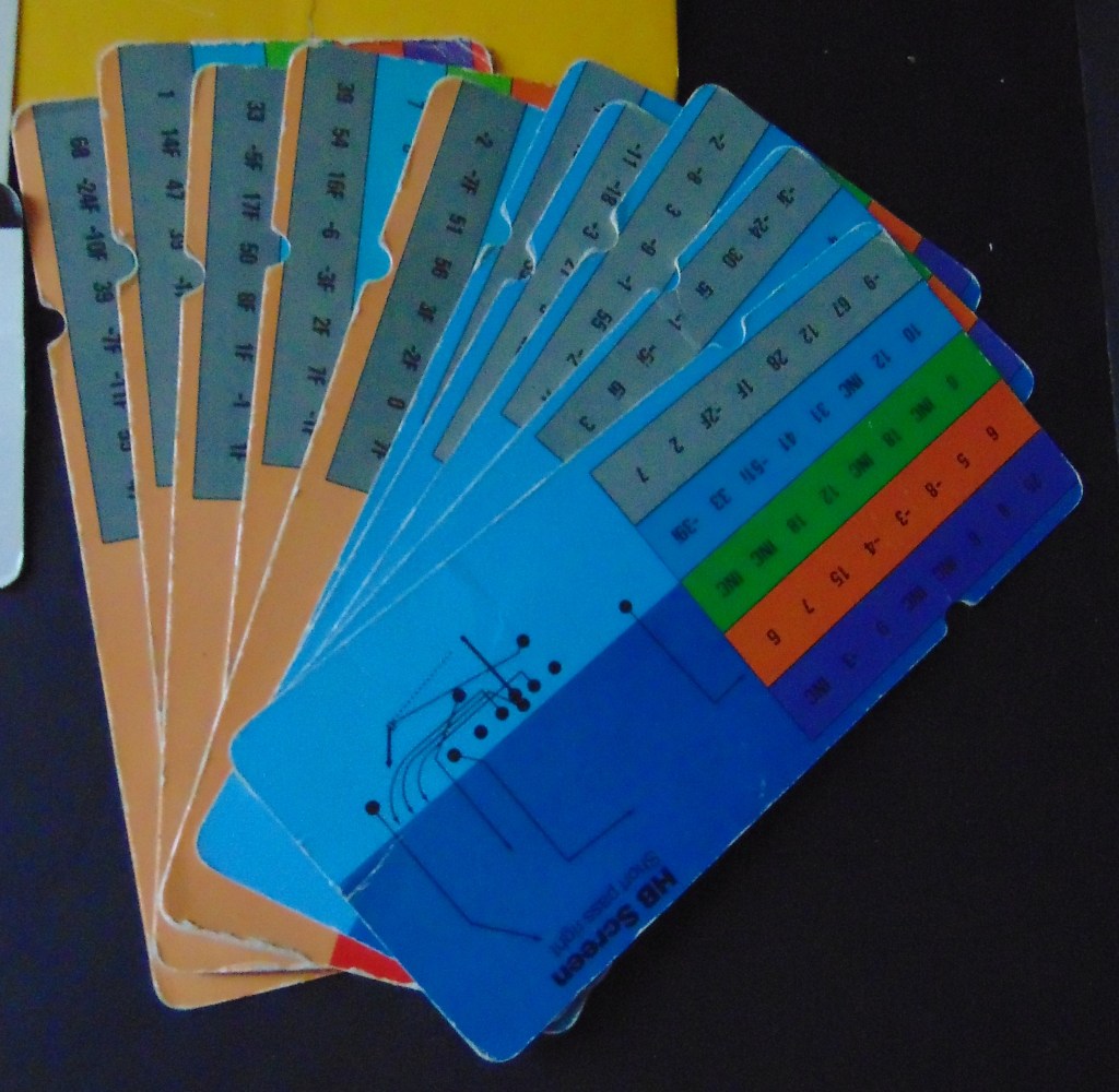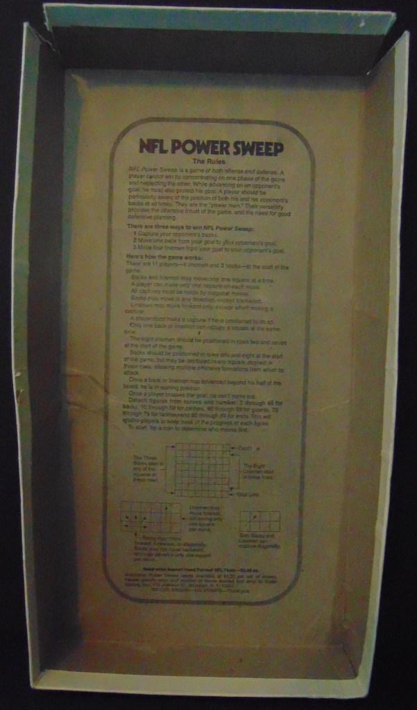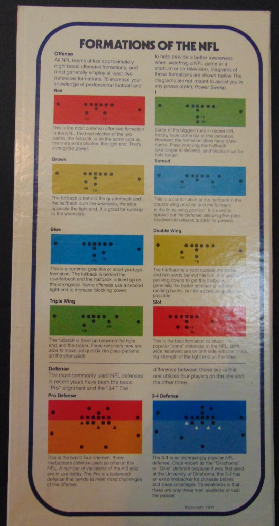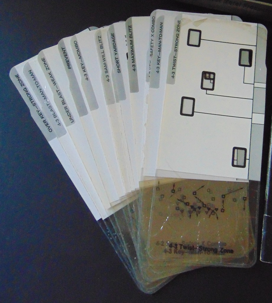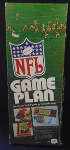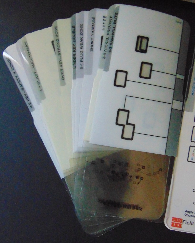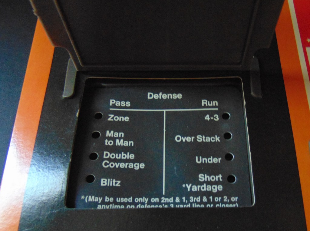 This game, made in 1970, was designed to “get right into pro football without the usual fumbling with charts, spinners or dice”. It consists of 17 offensive play cards, 12 defensive play cards and 2 special cards for kicks, punts and penalties, and a combination playing field, score board, timer and “NFL Strategy Programmer”. The play cards are color coded for various types of plays. Placing a defensive card over an offensive card shows various results. The cards are placed into the programmer and a “selector bead” flipped to produce a random result from the 15 possible results shown. By reading the yardage the offense advances the ball down the field until they score or are forced to give up possession to the opposing team.