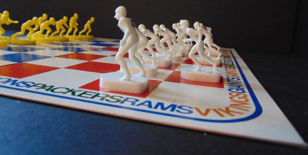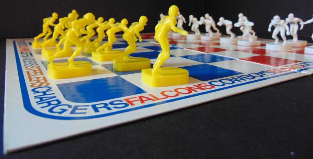 Apparently Tudor needed something to do with its inventory of “Standard” electric football players so they created this “chess” game of football. It consists of a “checkerboard” playing field with 2 teams of yellow and white electric football figures. The 8 lineman across the front line are limited to only moving forward one space at a time (much like the pawns in a game of chess) and the 3 backs may move any direction forward but not back.