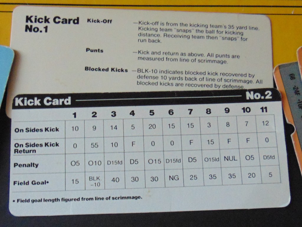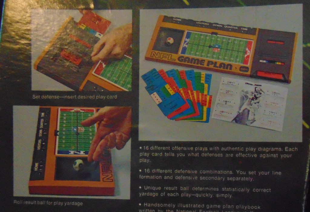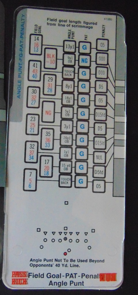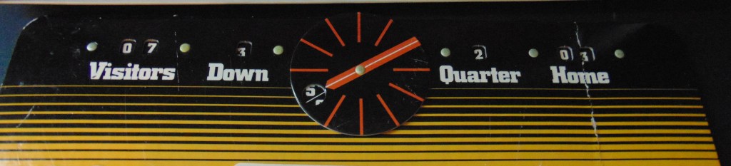 This game was made in the 1970’s (could not find a date for this game, possibly 1977?). Really just another version of the above games. Play cards, defensive cards, kick cards but with a spinner to randomize the play results. The scoreboard is very similar to the scoreboards included with Tudor’s electric football games.